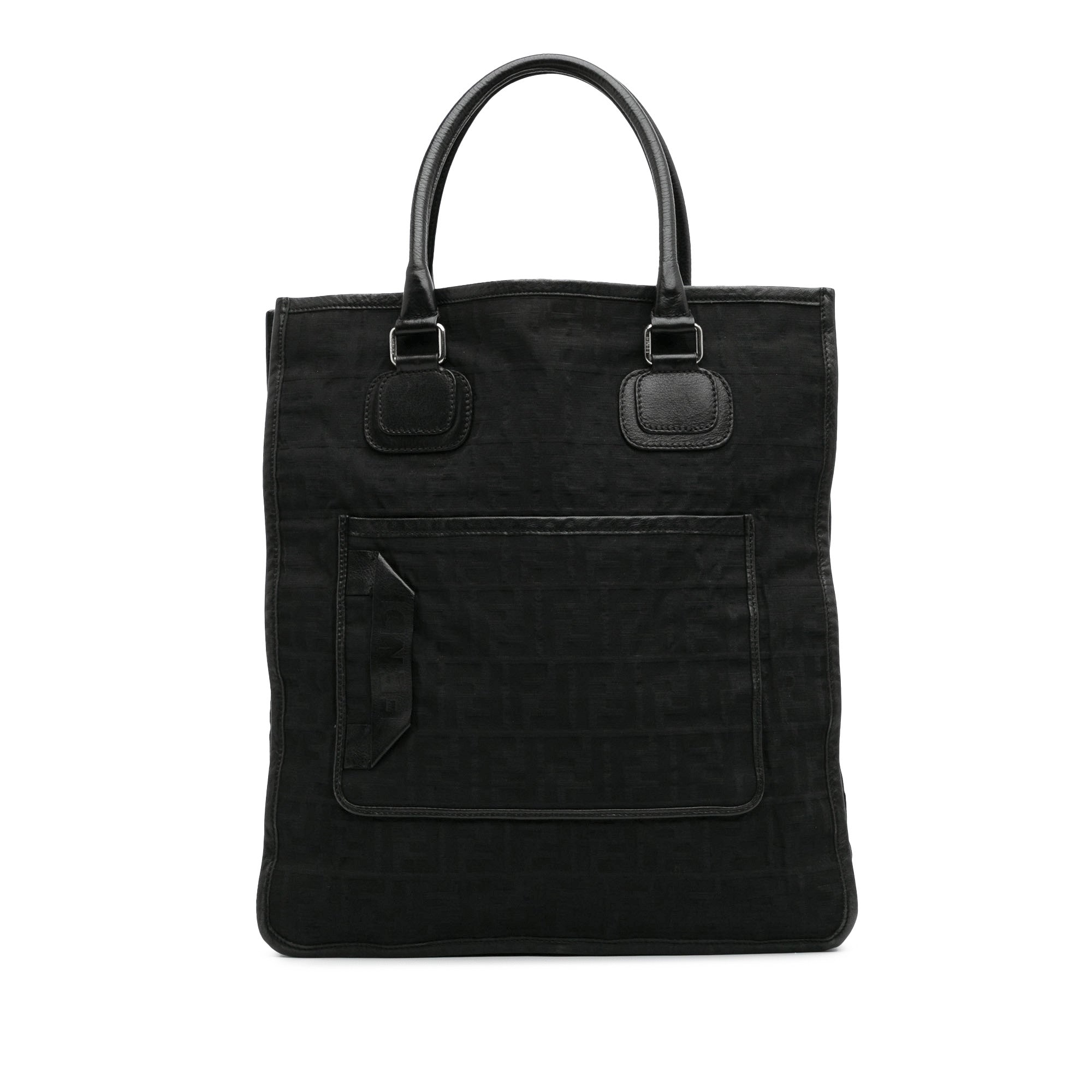 This tote features a canvas body with leather trim, rolled leather handles, an open top, an exterior slip pocket, and interior zip and slip pockets. Retail Price: 1000.00