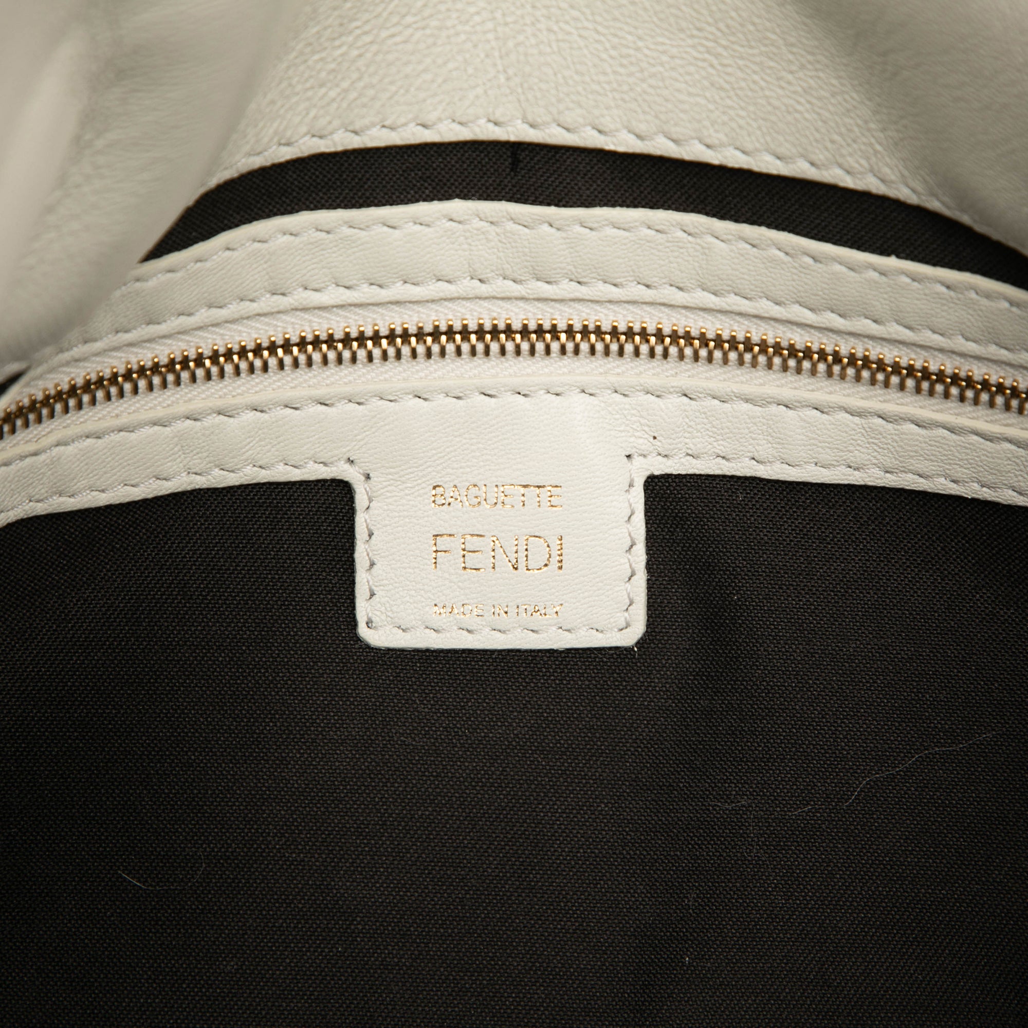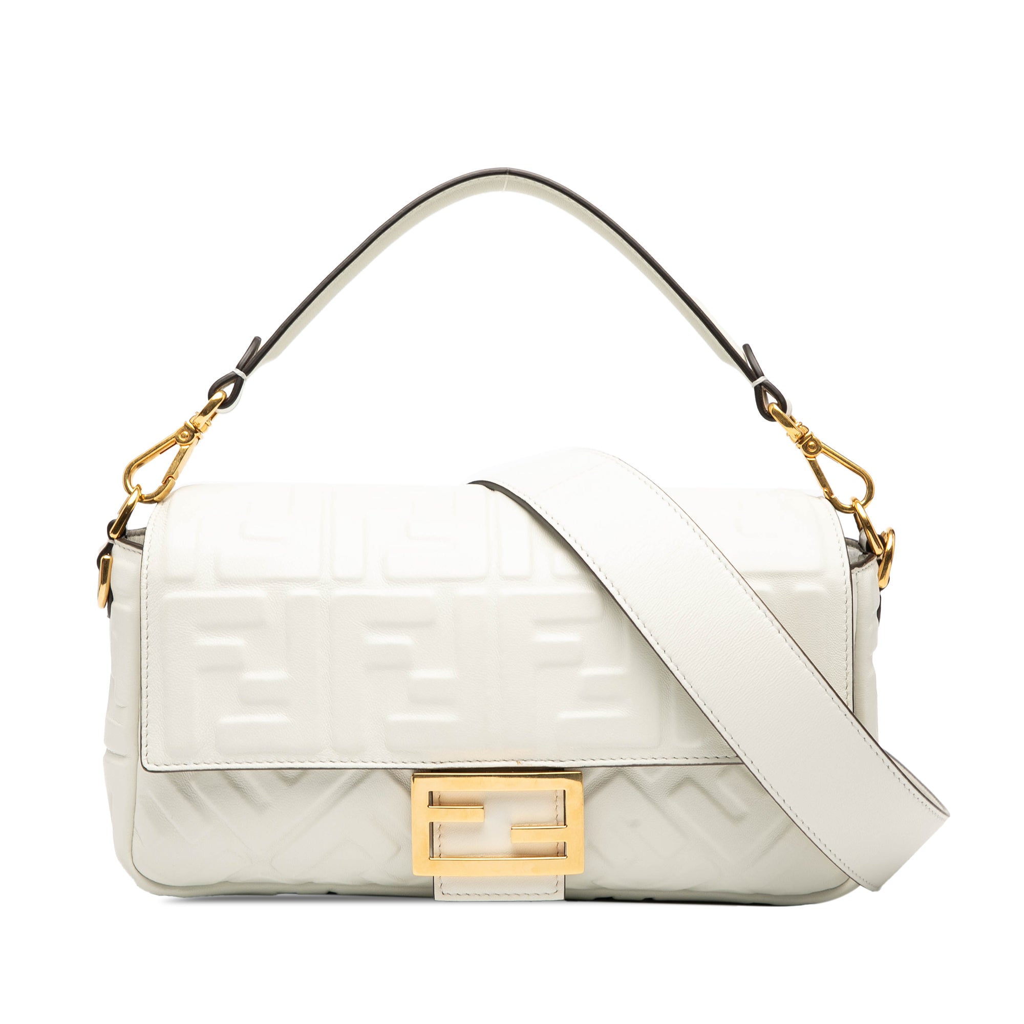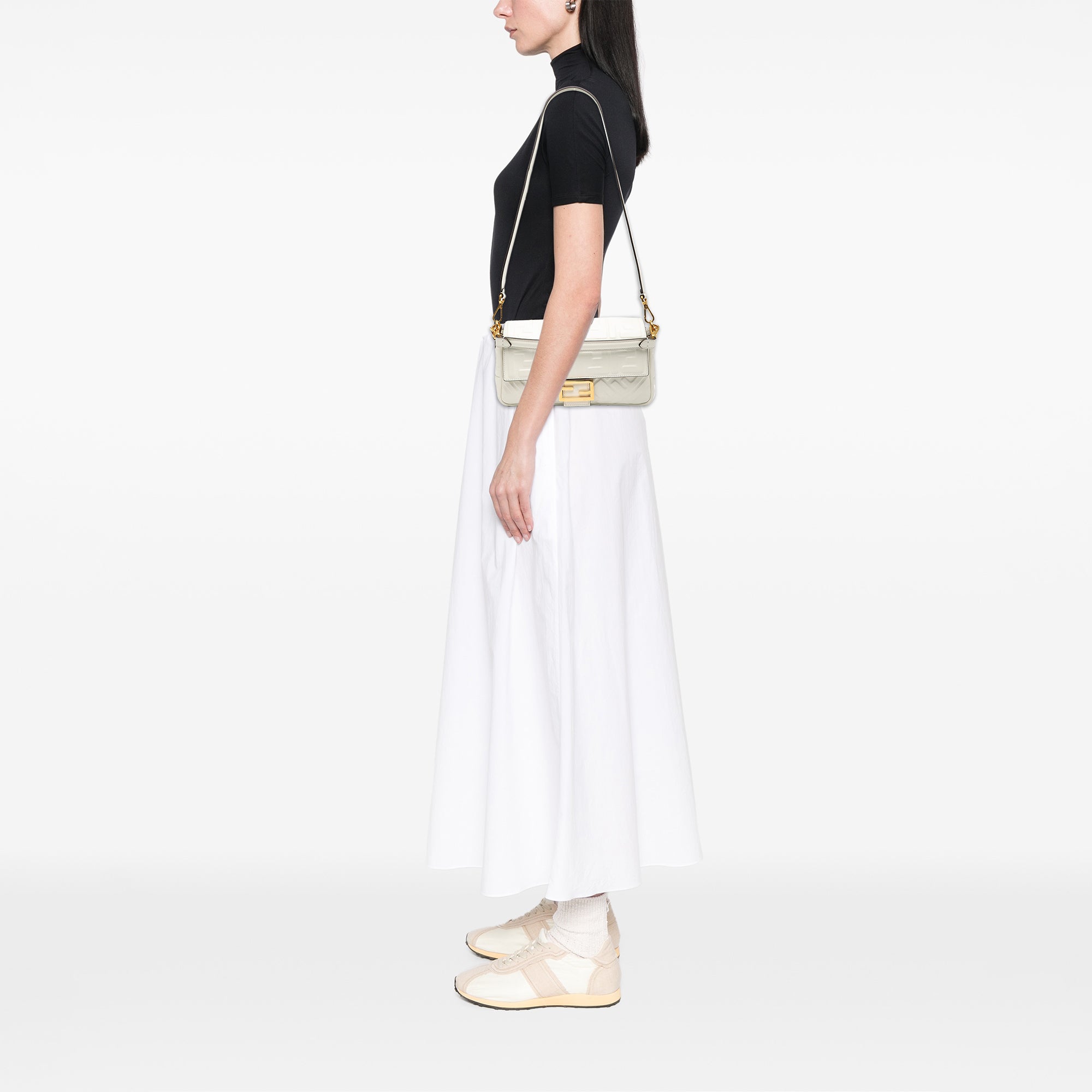 The Baguette satchel features an embossed leather body, a flat leather handle, a detachable strap, a front flap with magnetic snap button closure, and an interior zip pocket. Retail Price: 3150.00