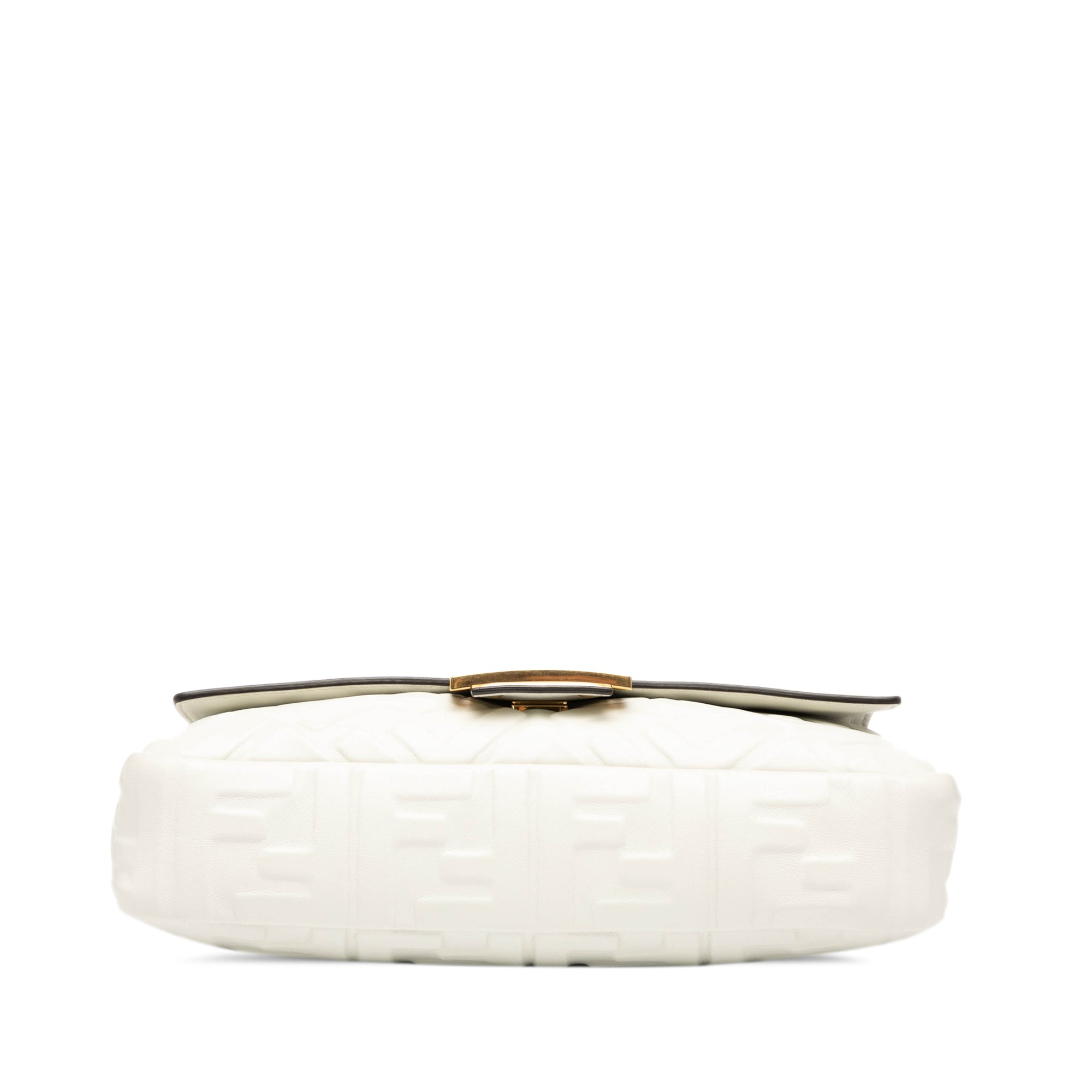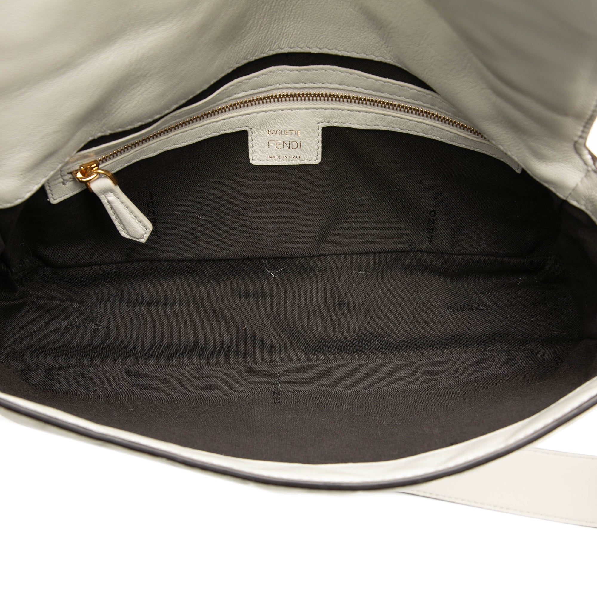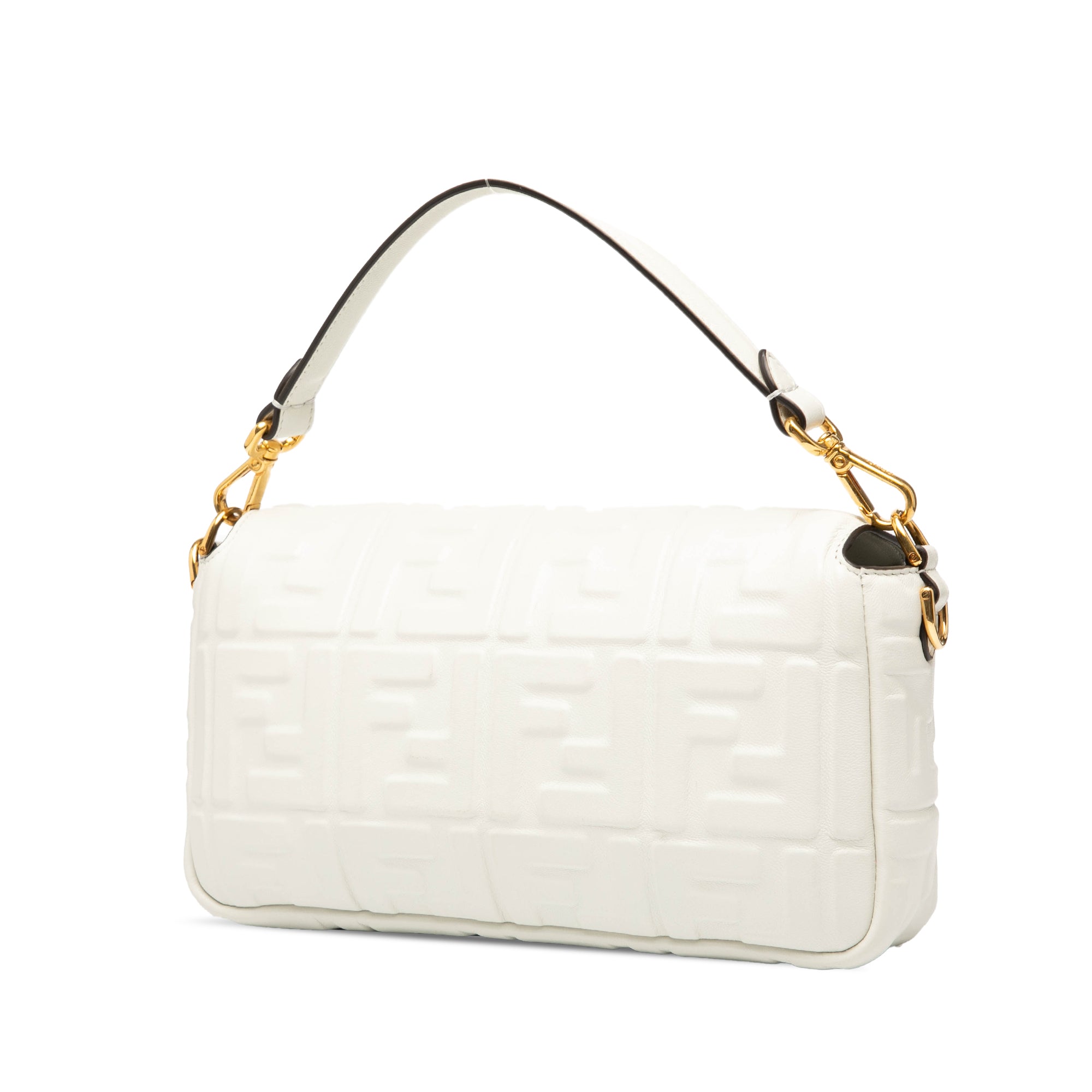 The Baguette satchel features an embossed leather body, a flat leather handle, a detachable strap, a front flap with magnetic snap button closure, and an interior zip pocket. Retail Price: 3150.00