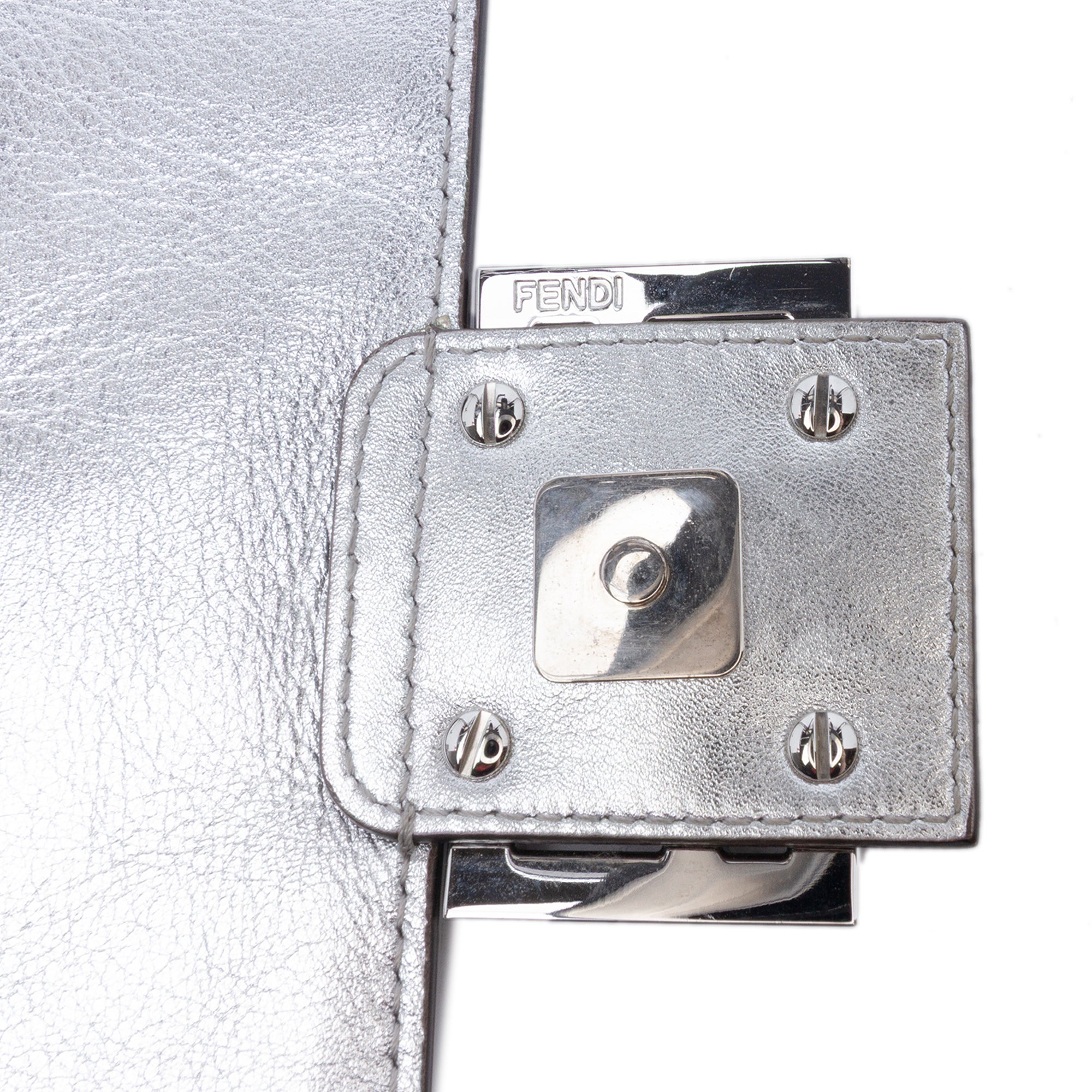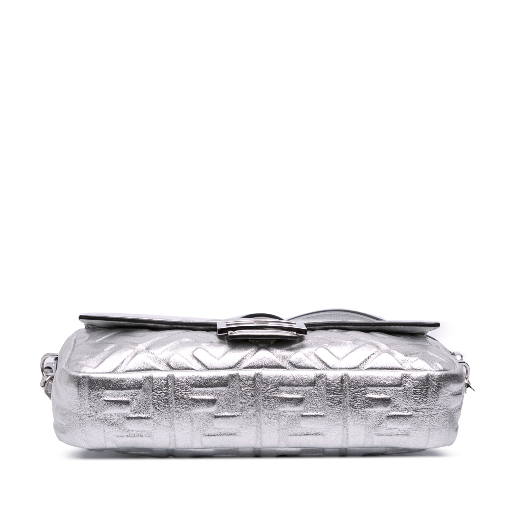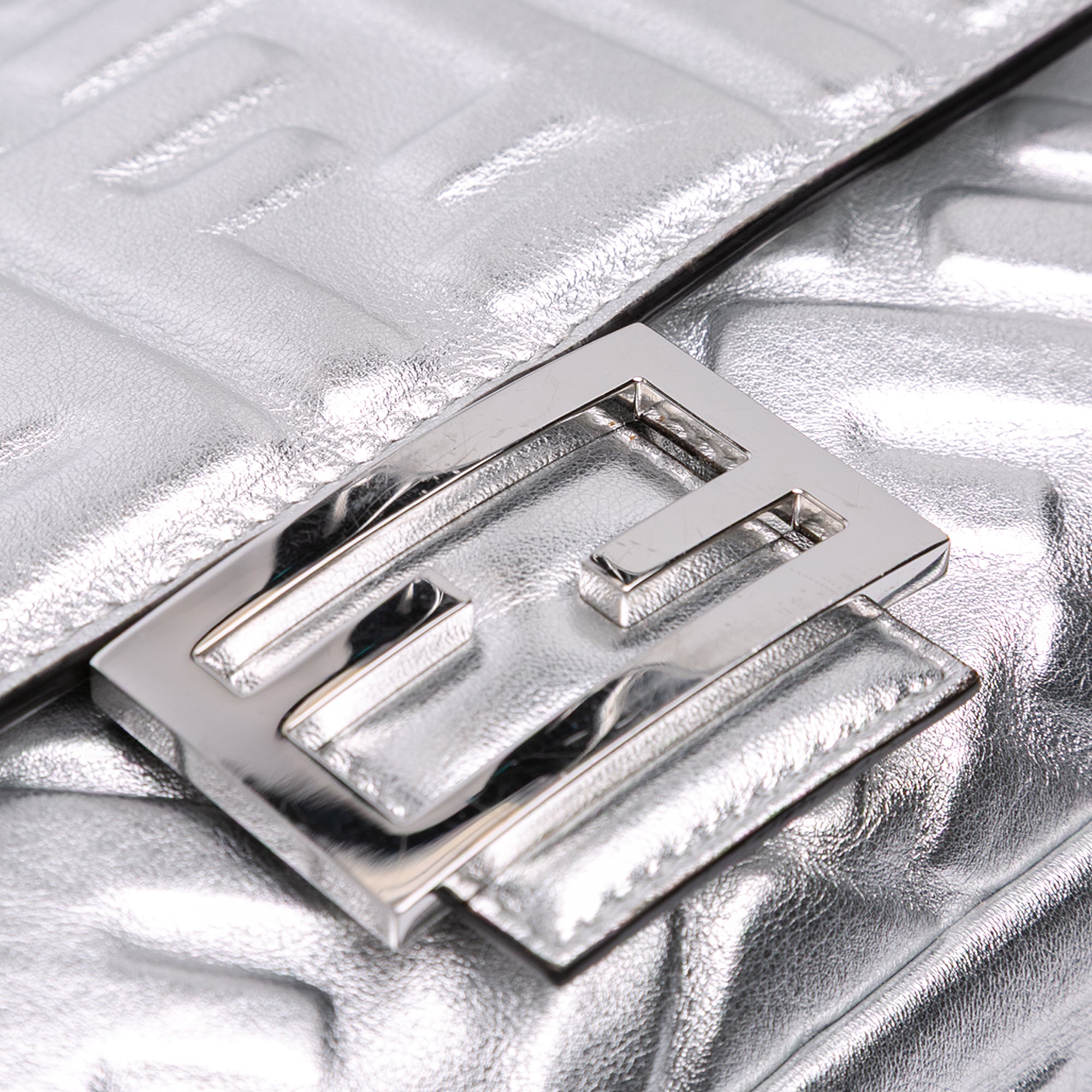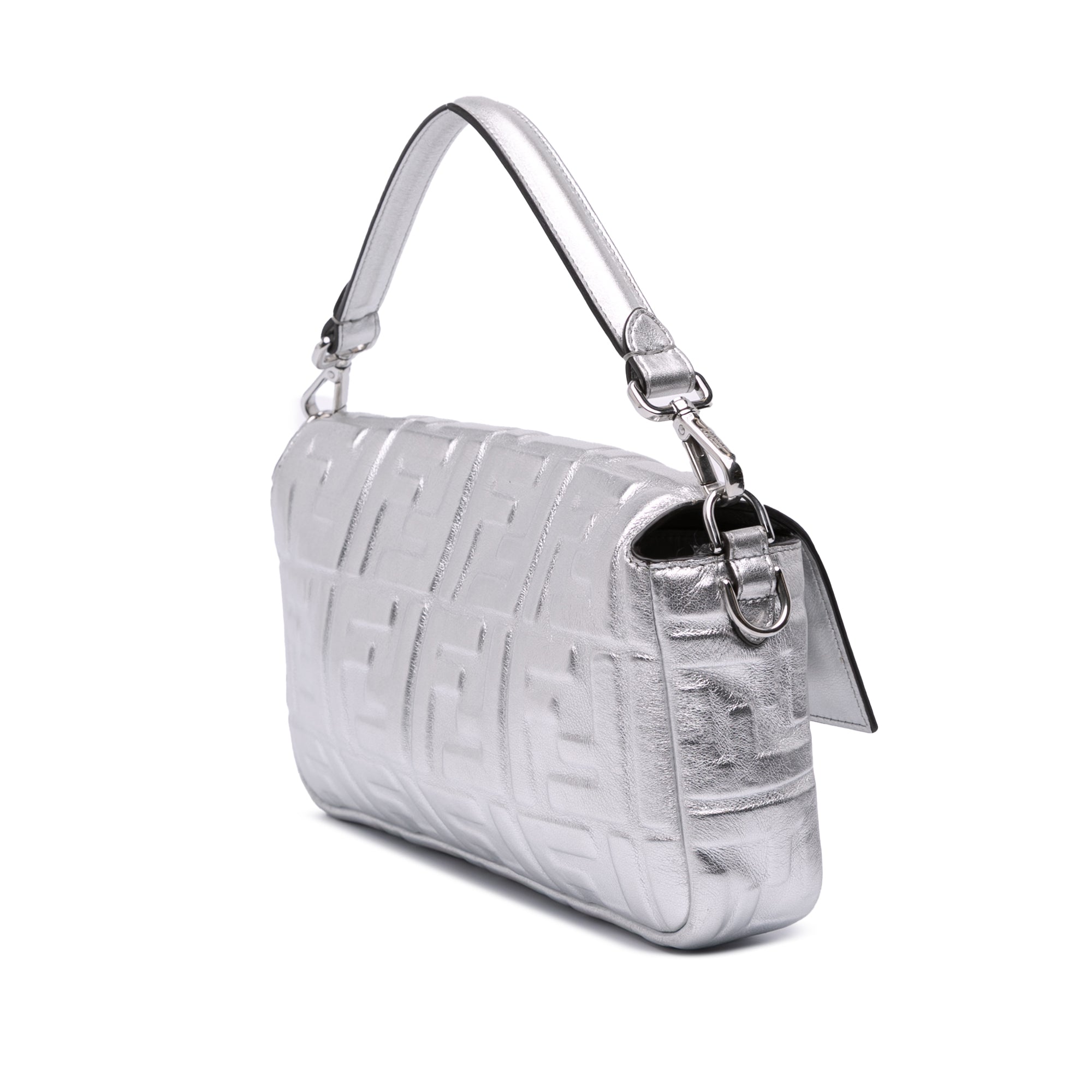 This satchel features an embossed leather body, a flat leather handle, a detachable flat leather strap, a front flap with magnetic snap closure, and an interior zip pocket. Retail Price: 3150.00