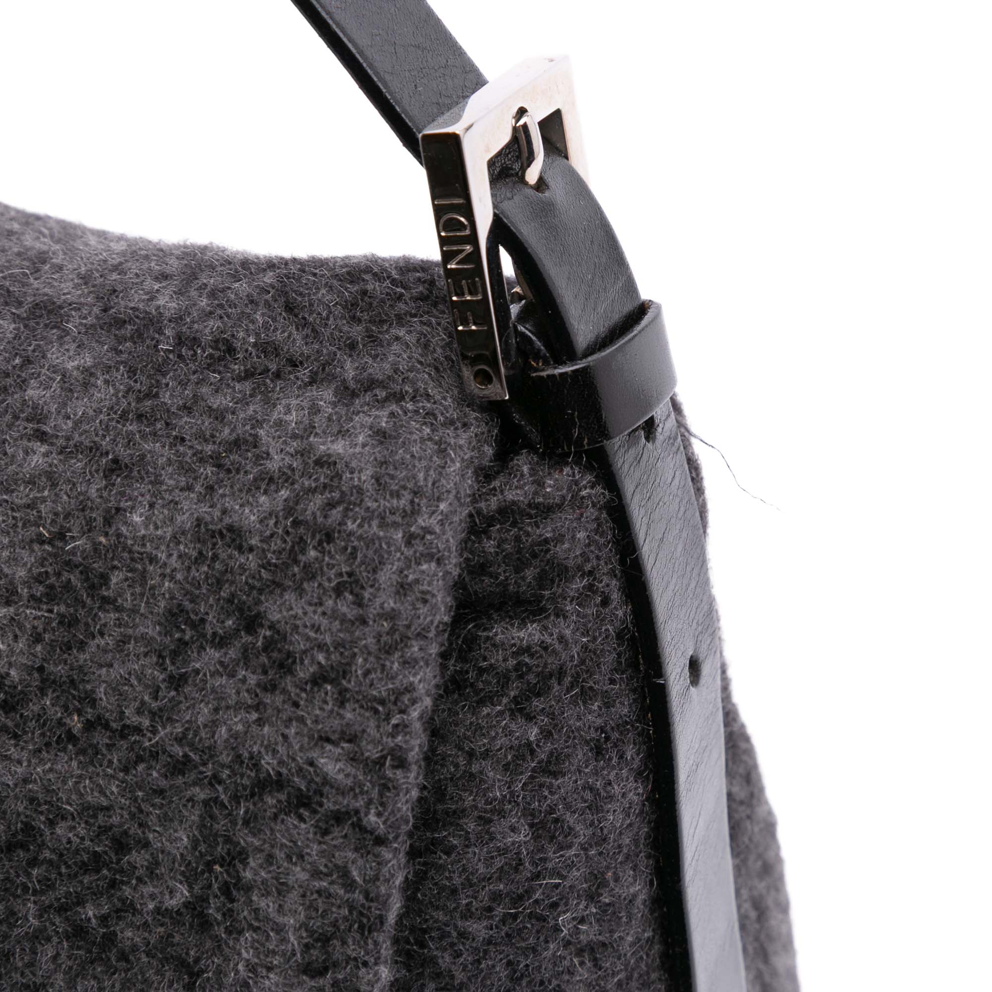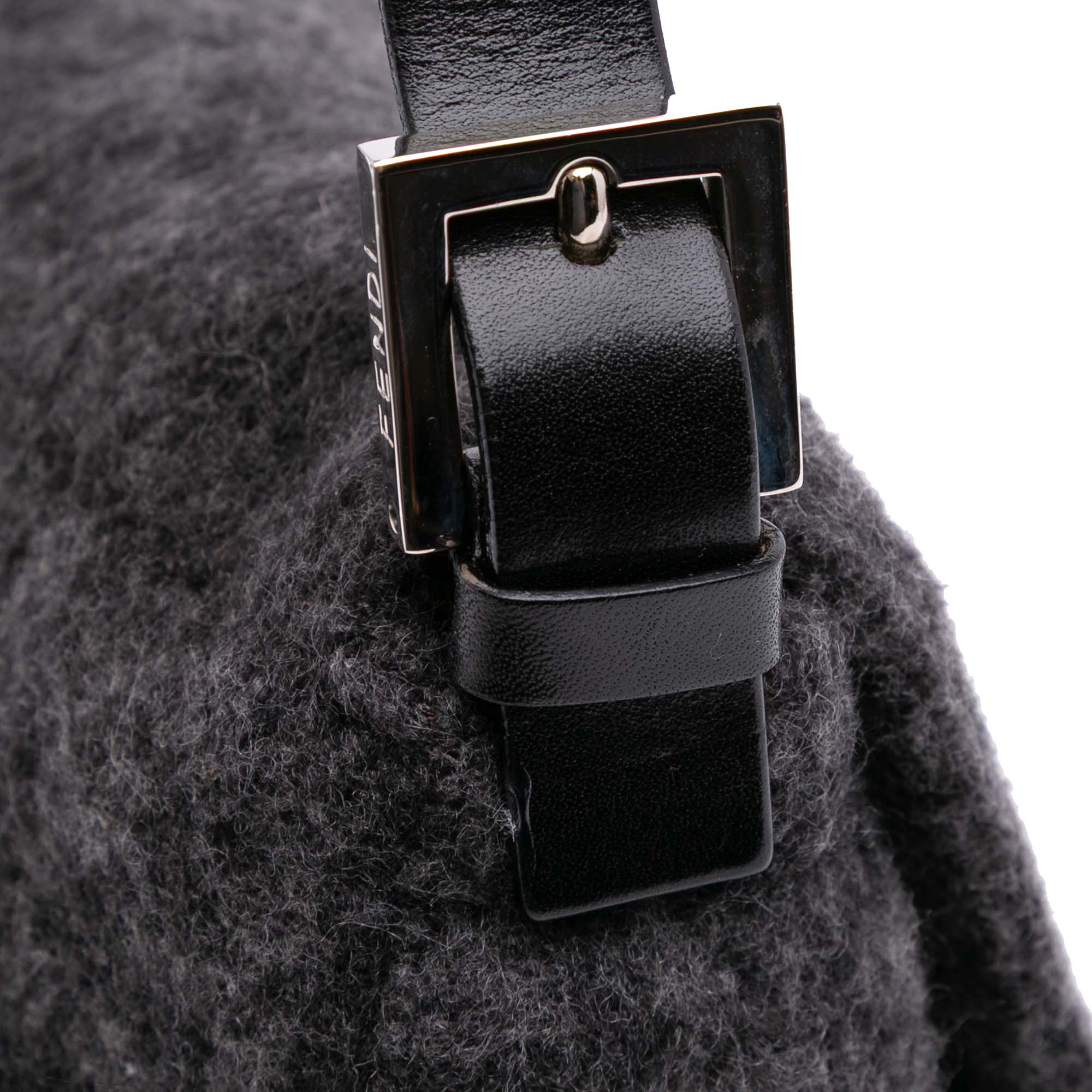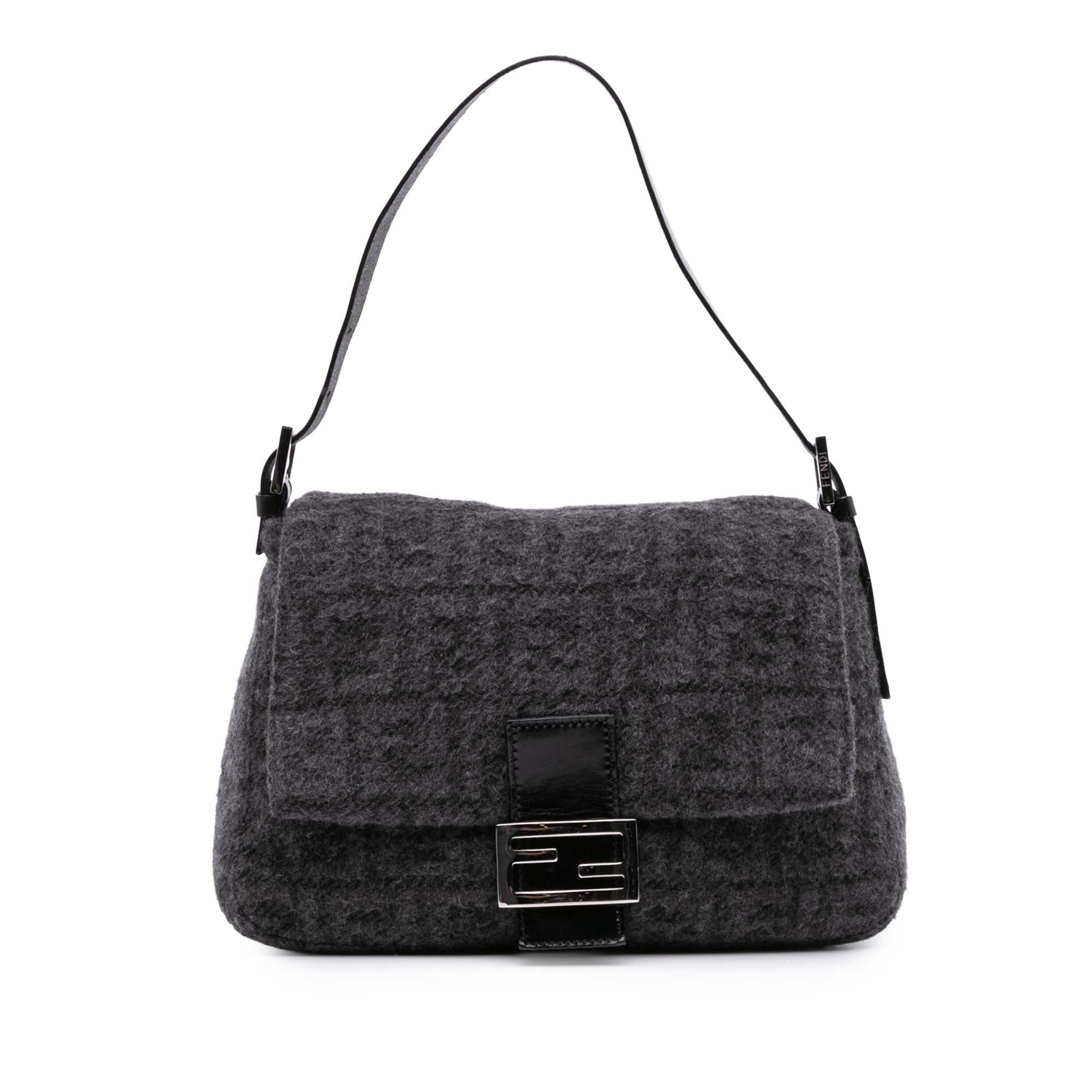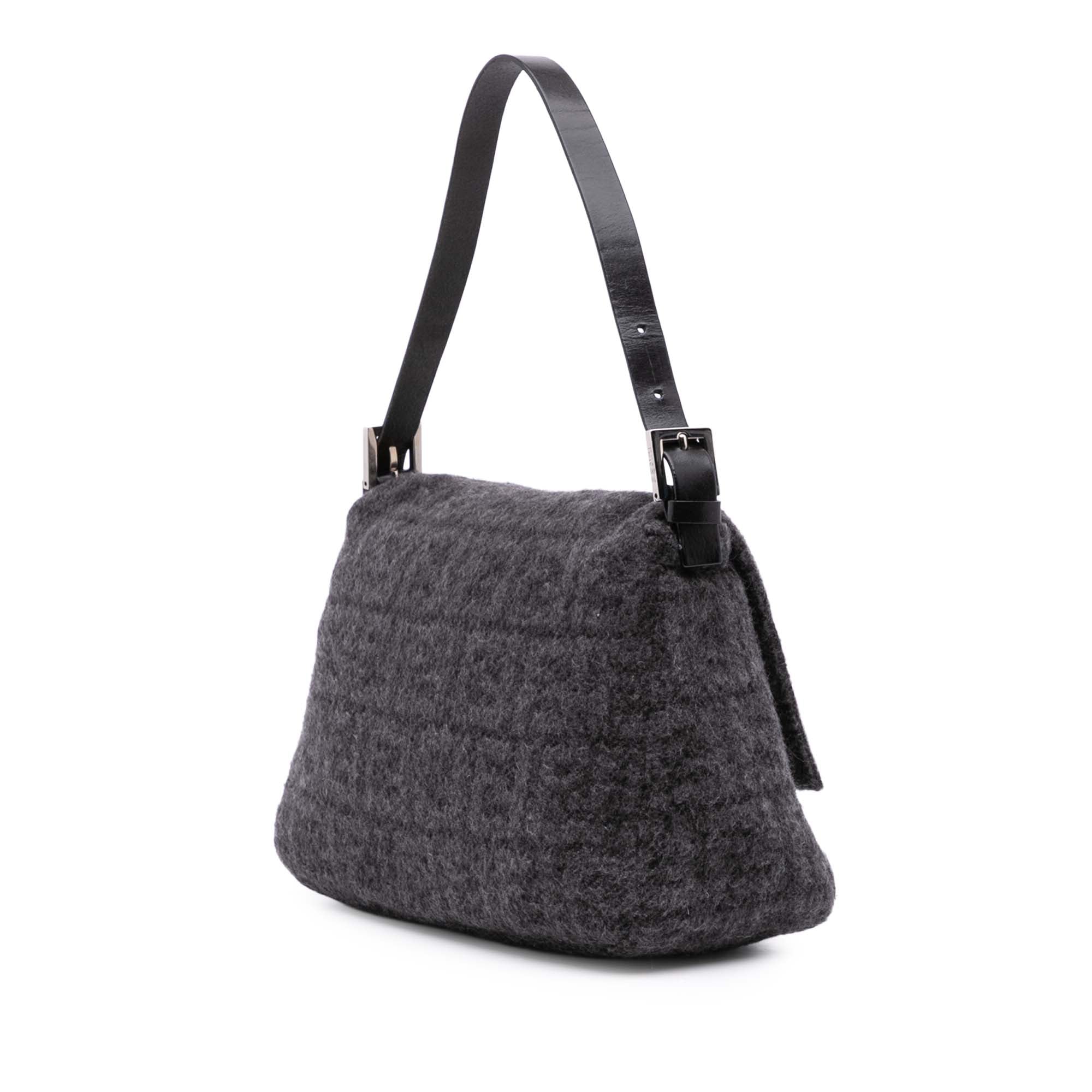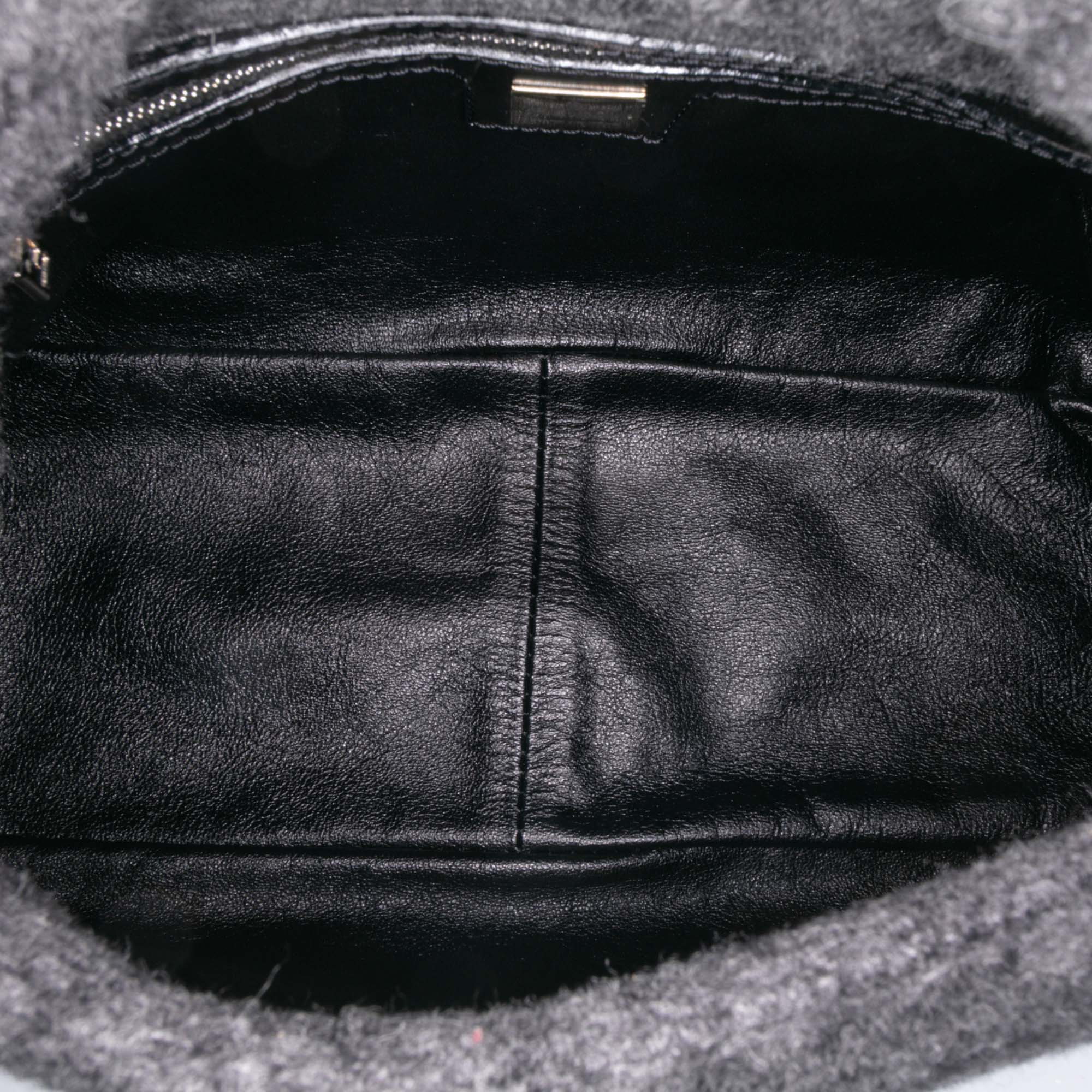The Mamma Shoulder Bag features a wool body, a flat leather strap, a front flap with a flat leather strap and magnetic closure, and an interior zip pocket. Retail Price: 1900.00