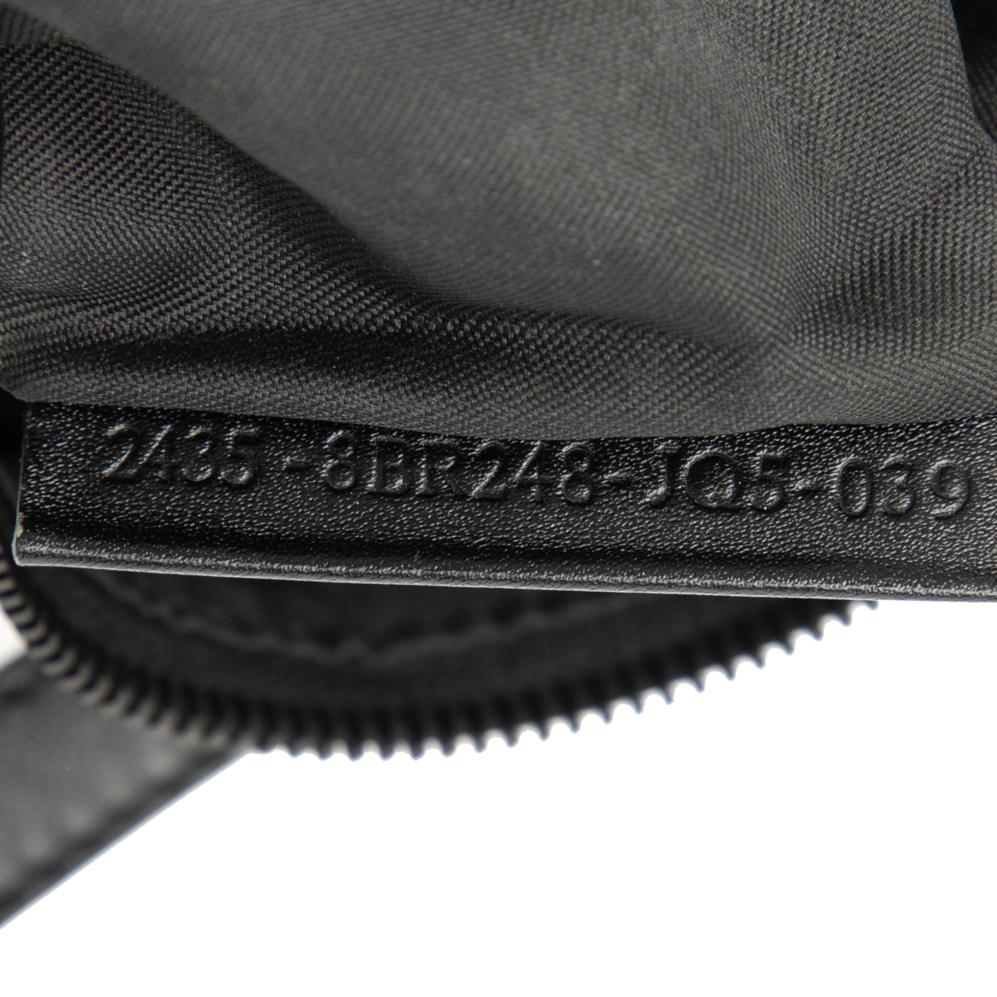 This shoulder bag features a canvas body with leather trim, a flat leather strap, a top zip closure, and an interior slip pocket. Retail Price: 900.00