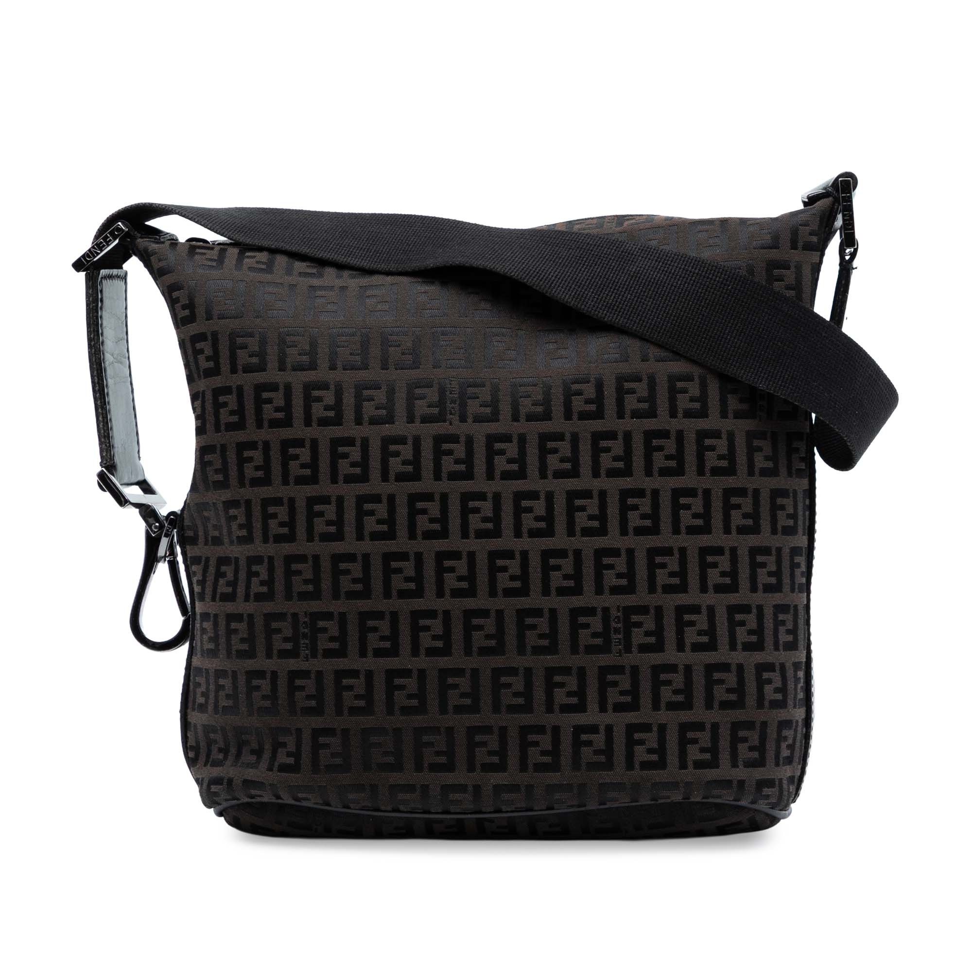 This shoulder bag features a canvas body with leather trim, an adjustable flat canvas strap, and a top zip closure. Retail Price: 995.00