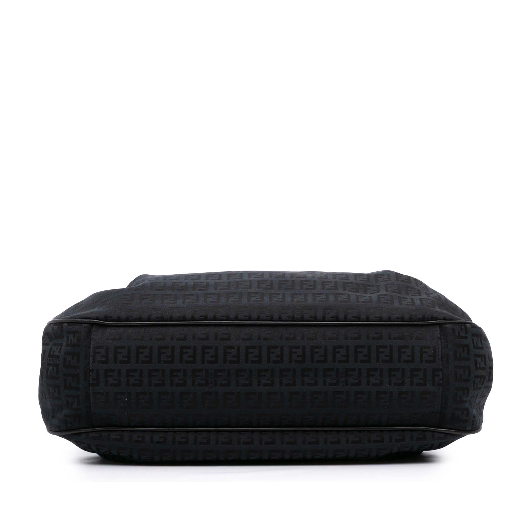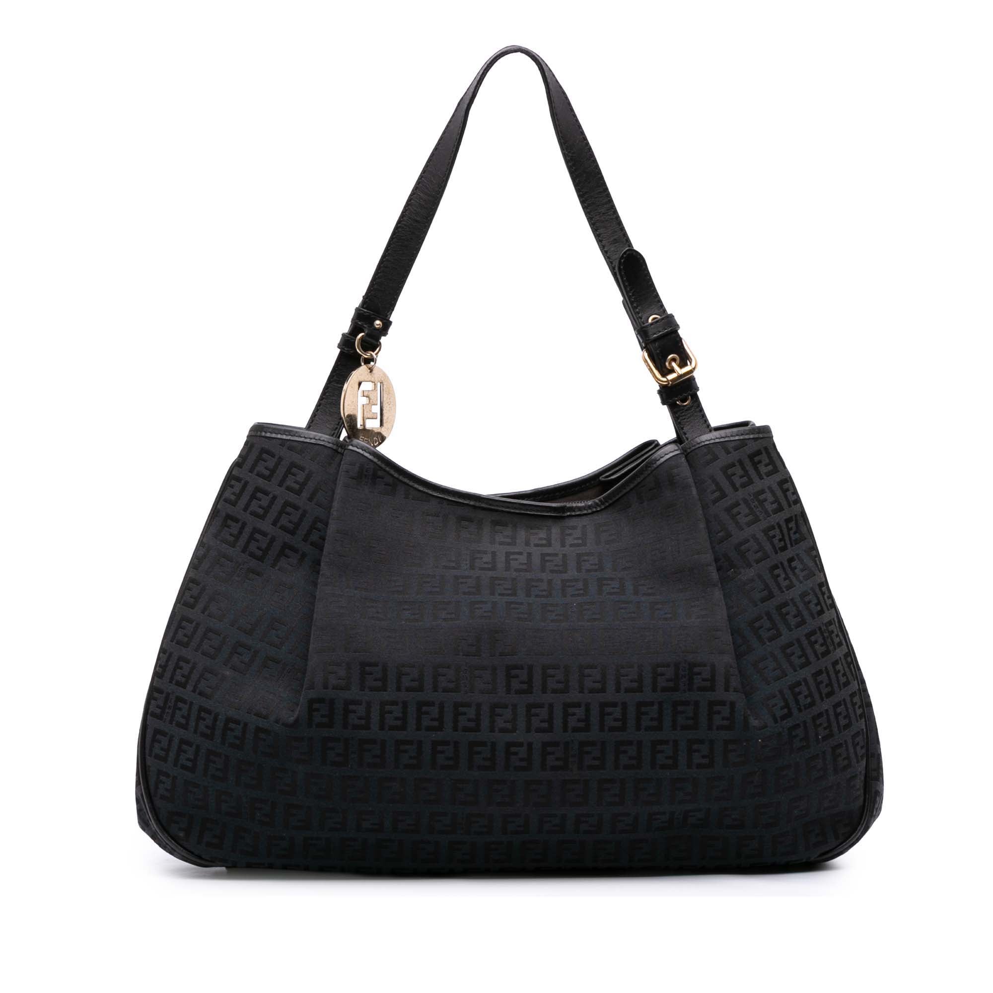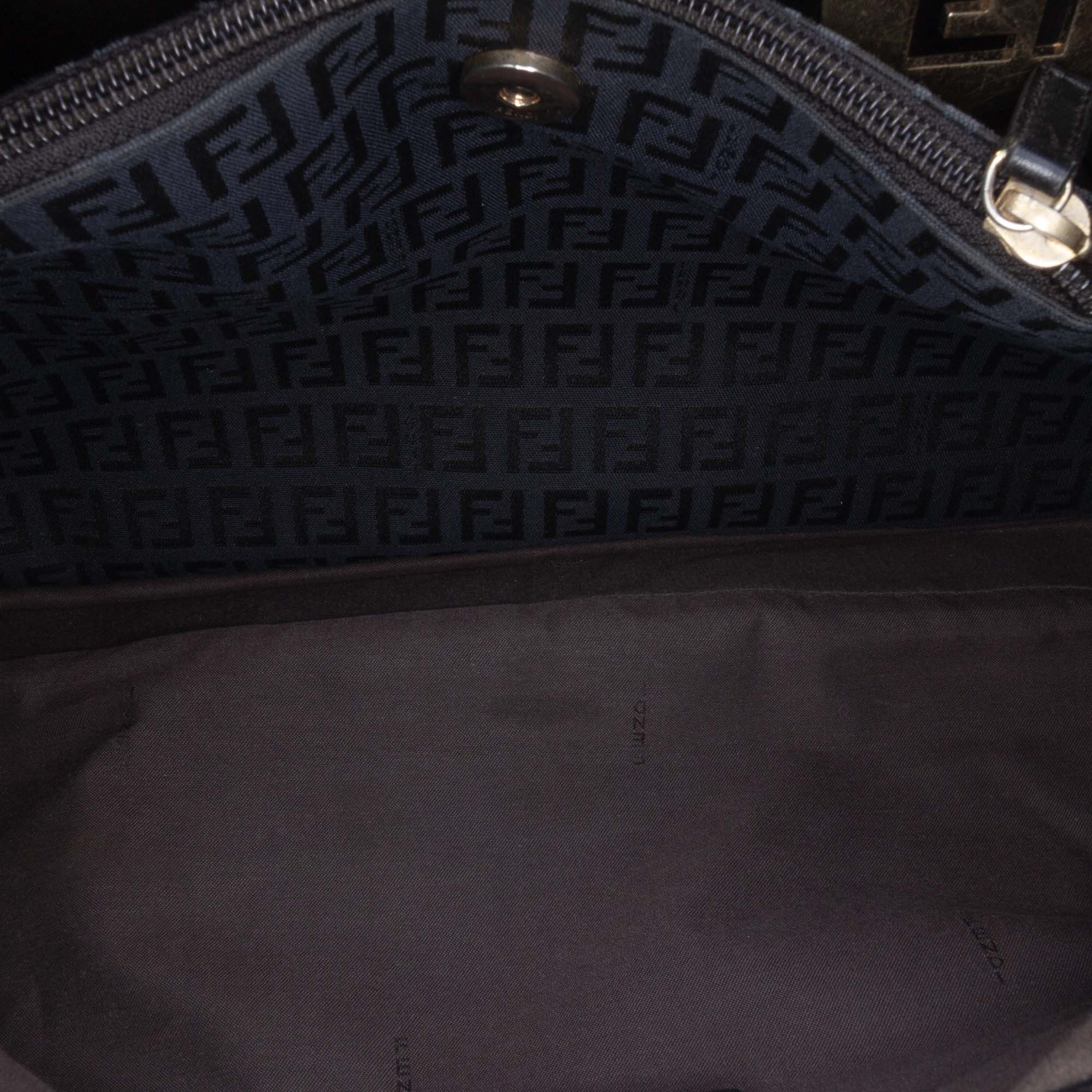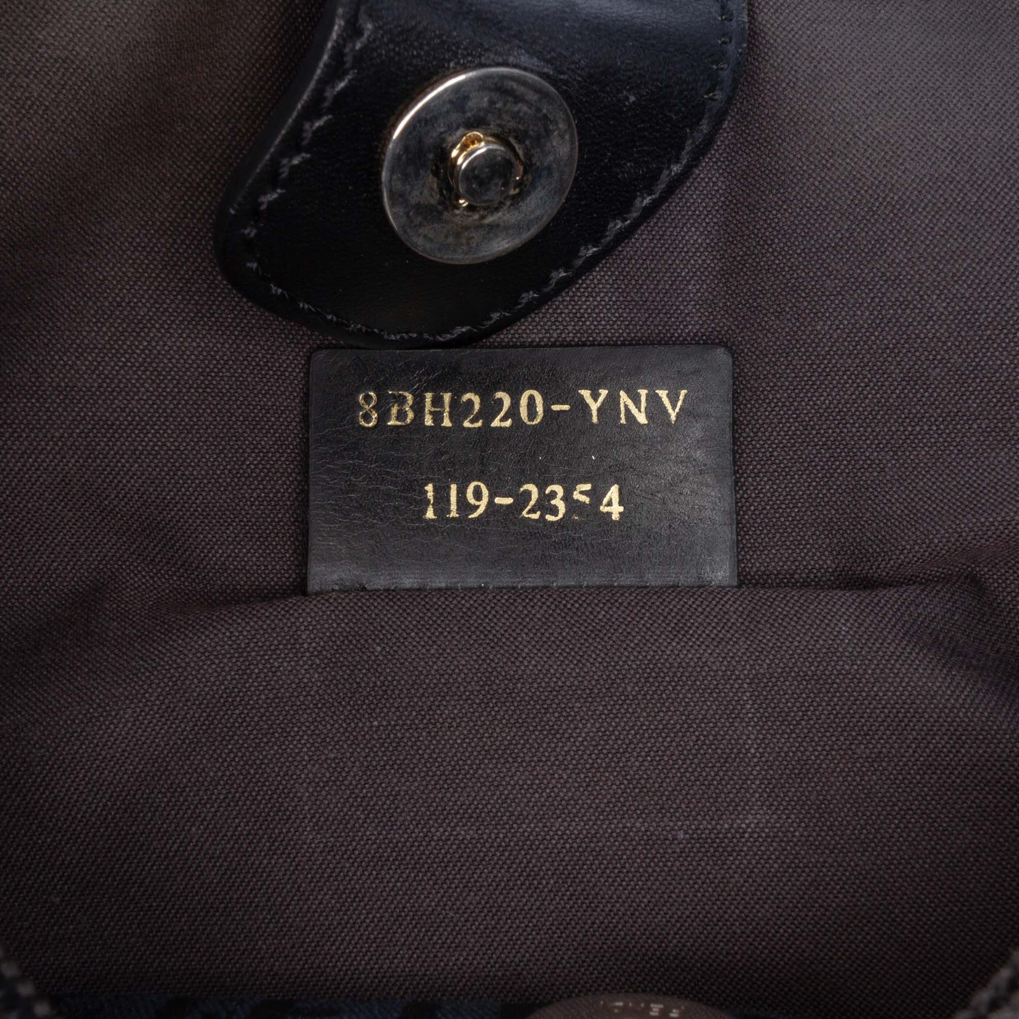 This shoulder bag features a canvas body with leather trim, an adjustable flat leather strap, an open top with magnetic snap closure, and an interior center zip compartment. Retail Price: 800.00