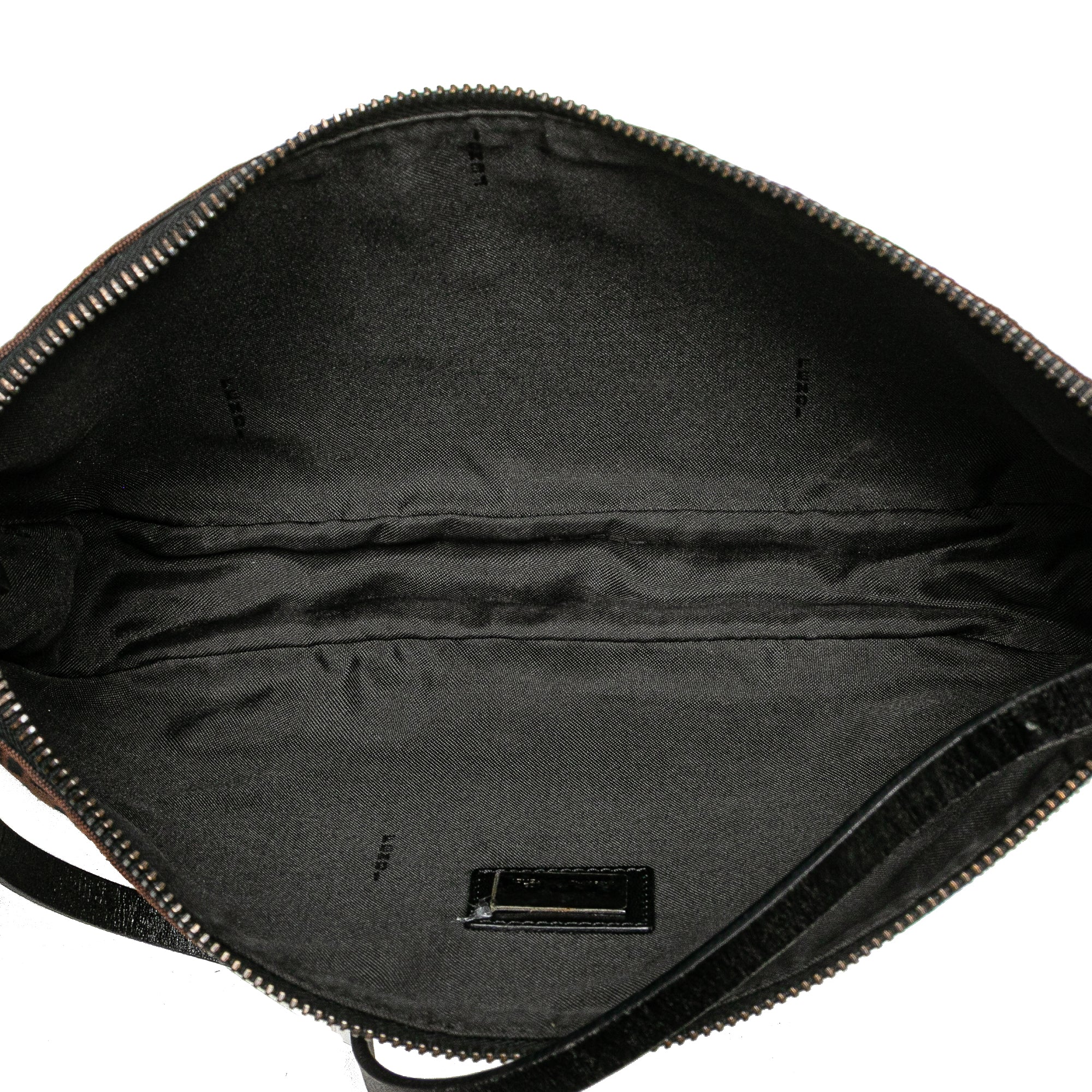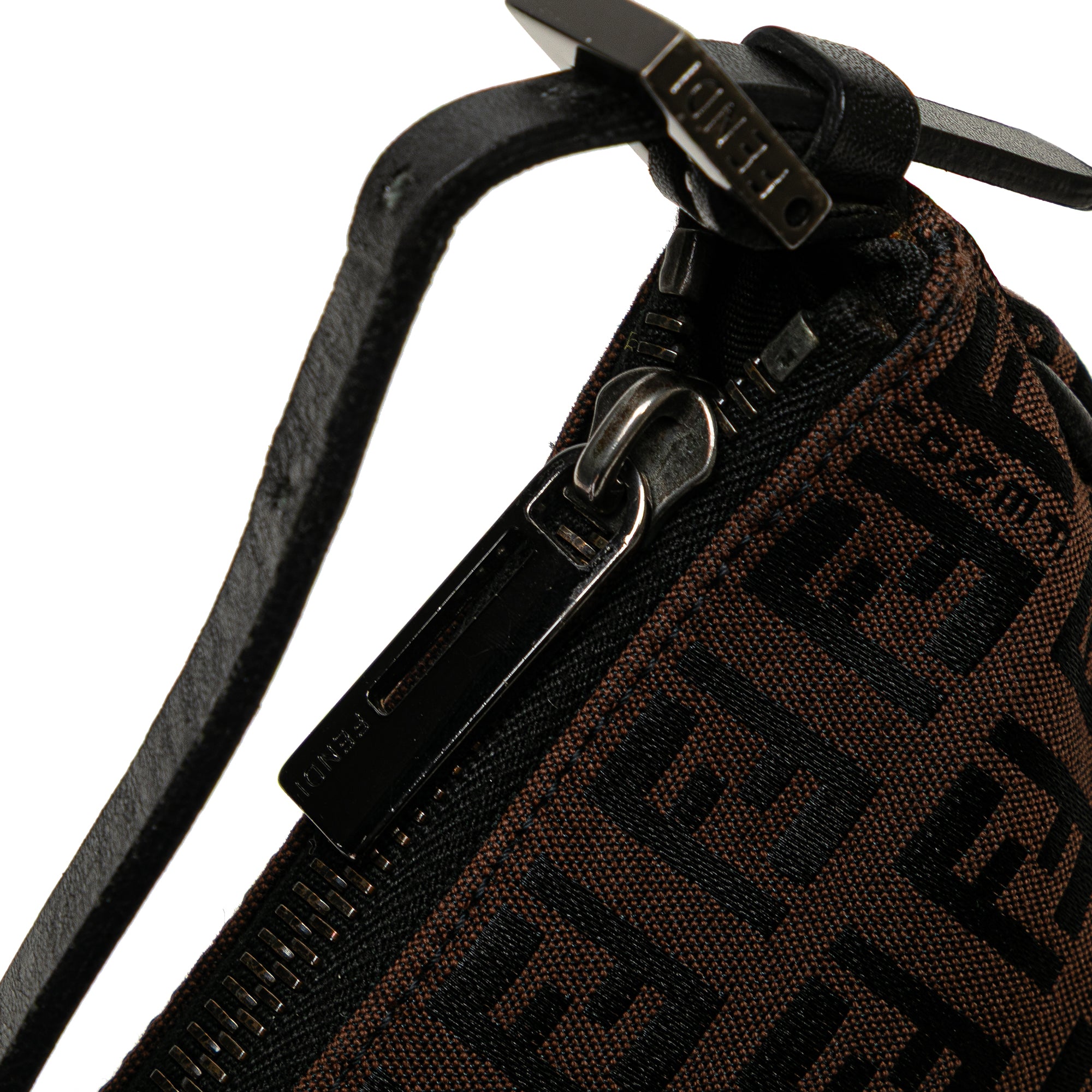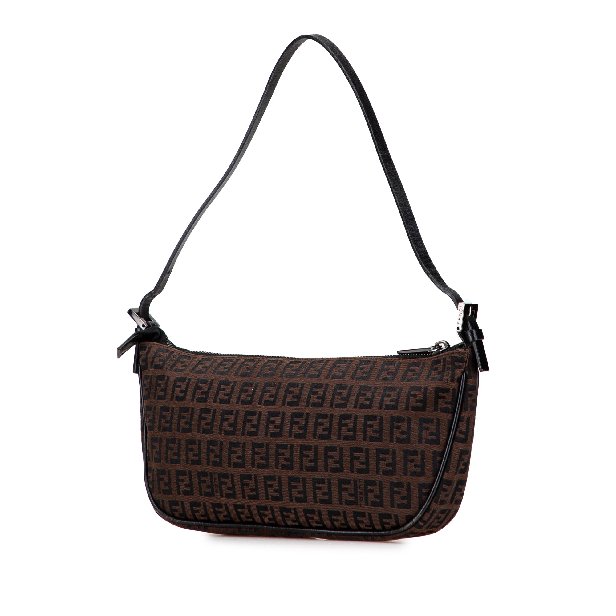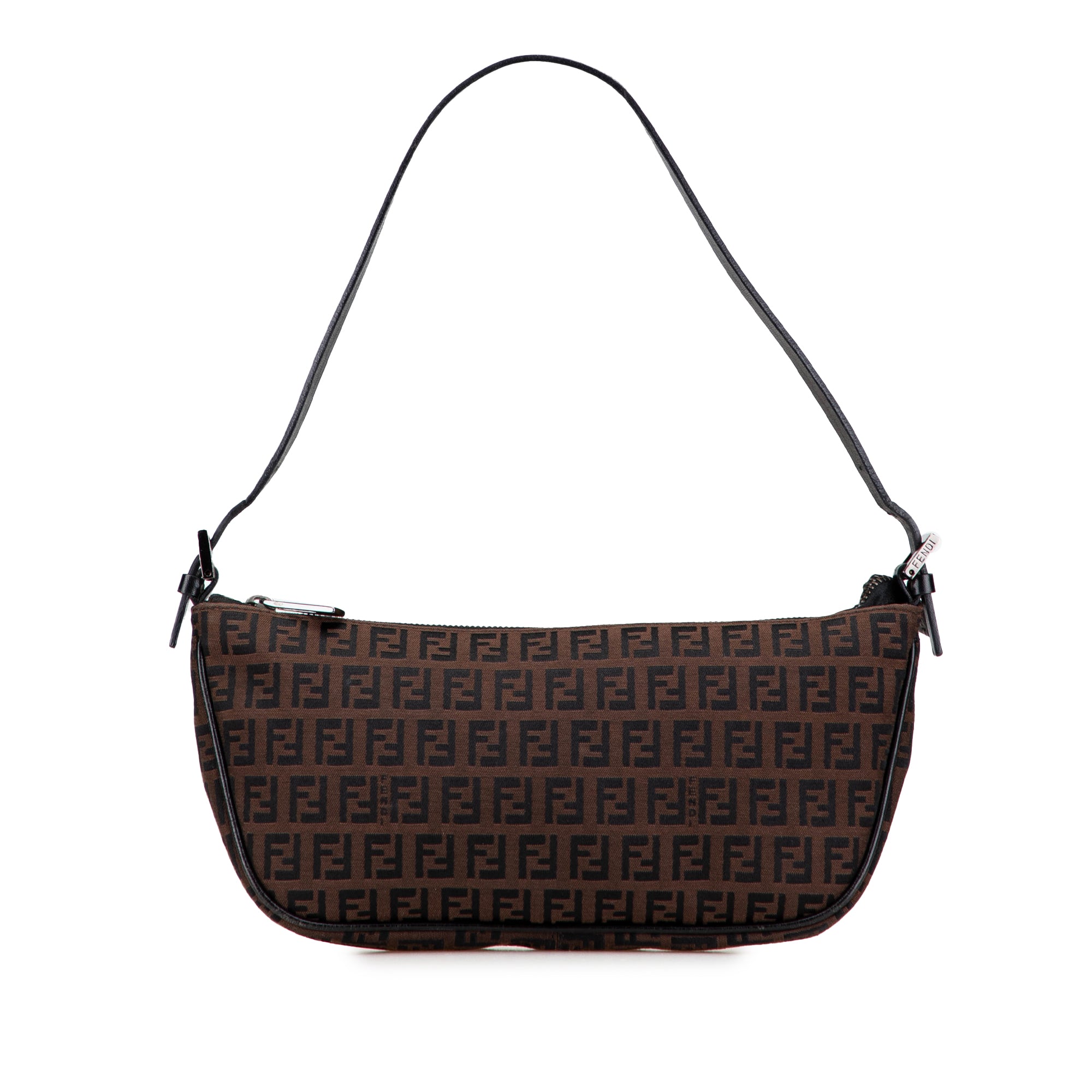 This shoulder bag features a canvas body with leather trim, a flat leather shoulder strap, and a top zip closure. Retail Price: 800.00