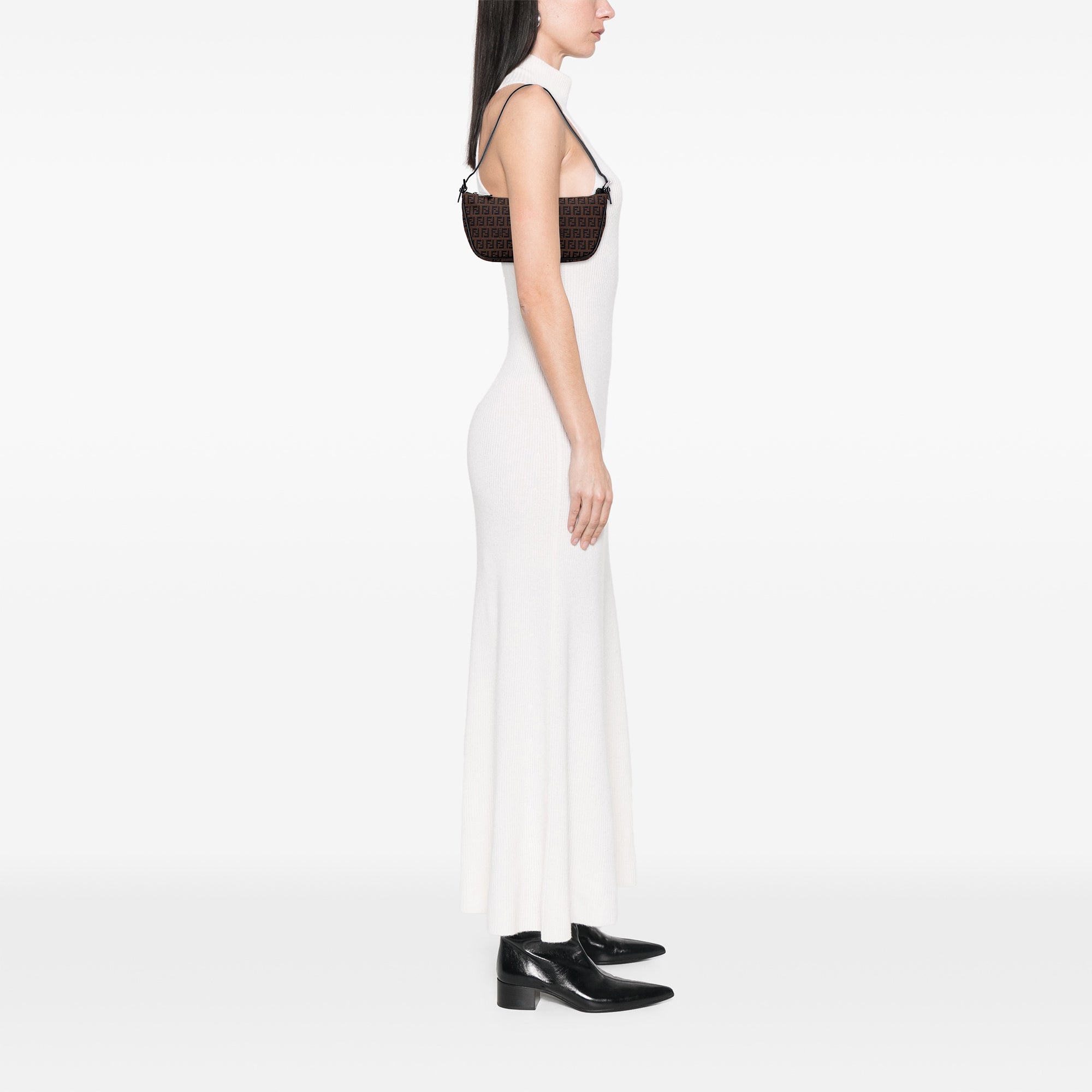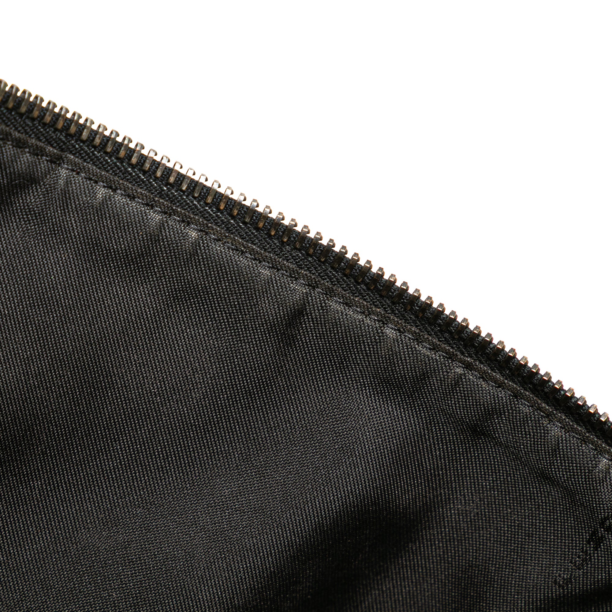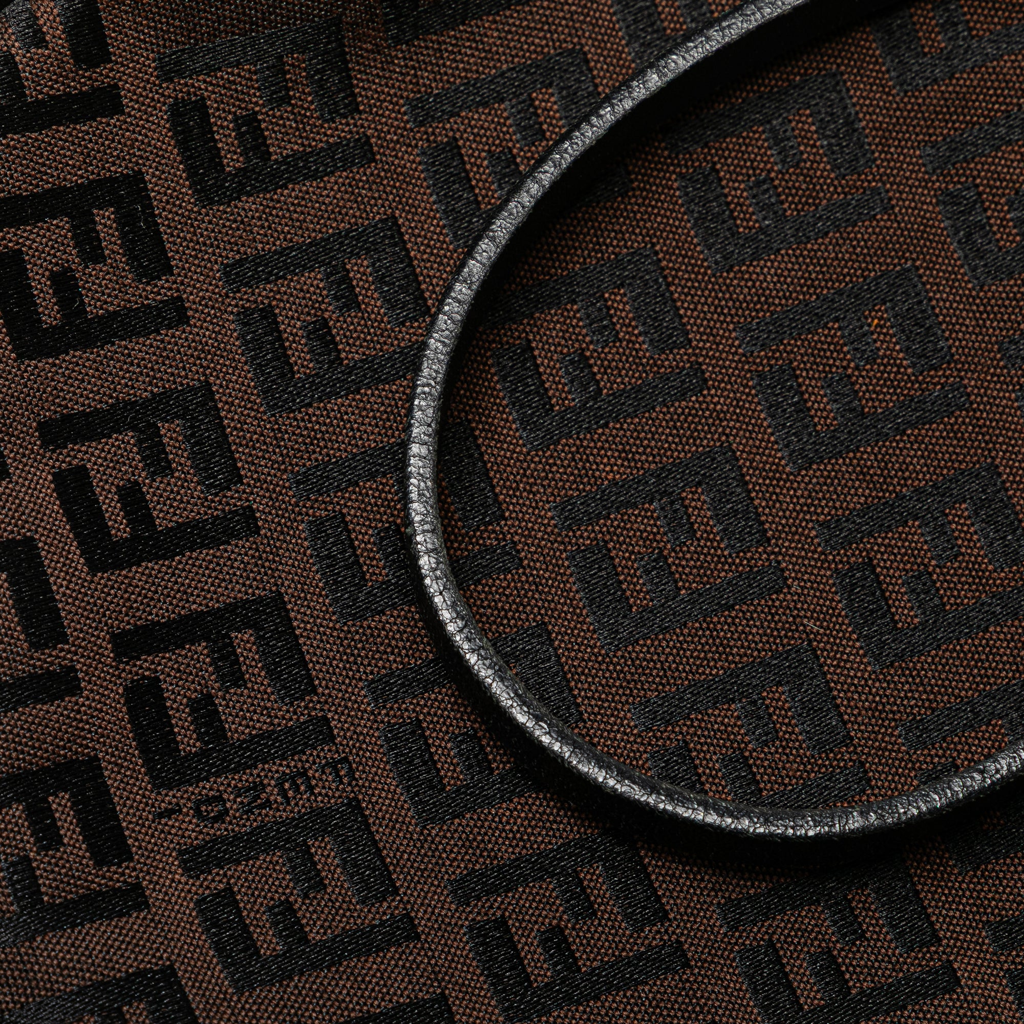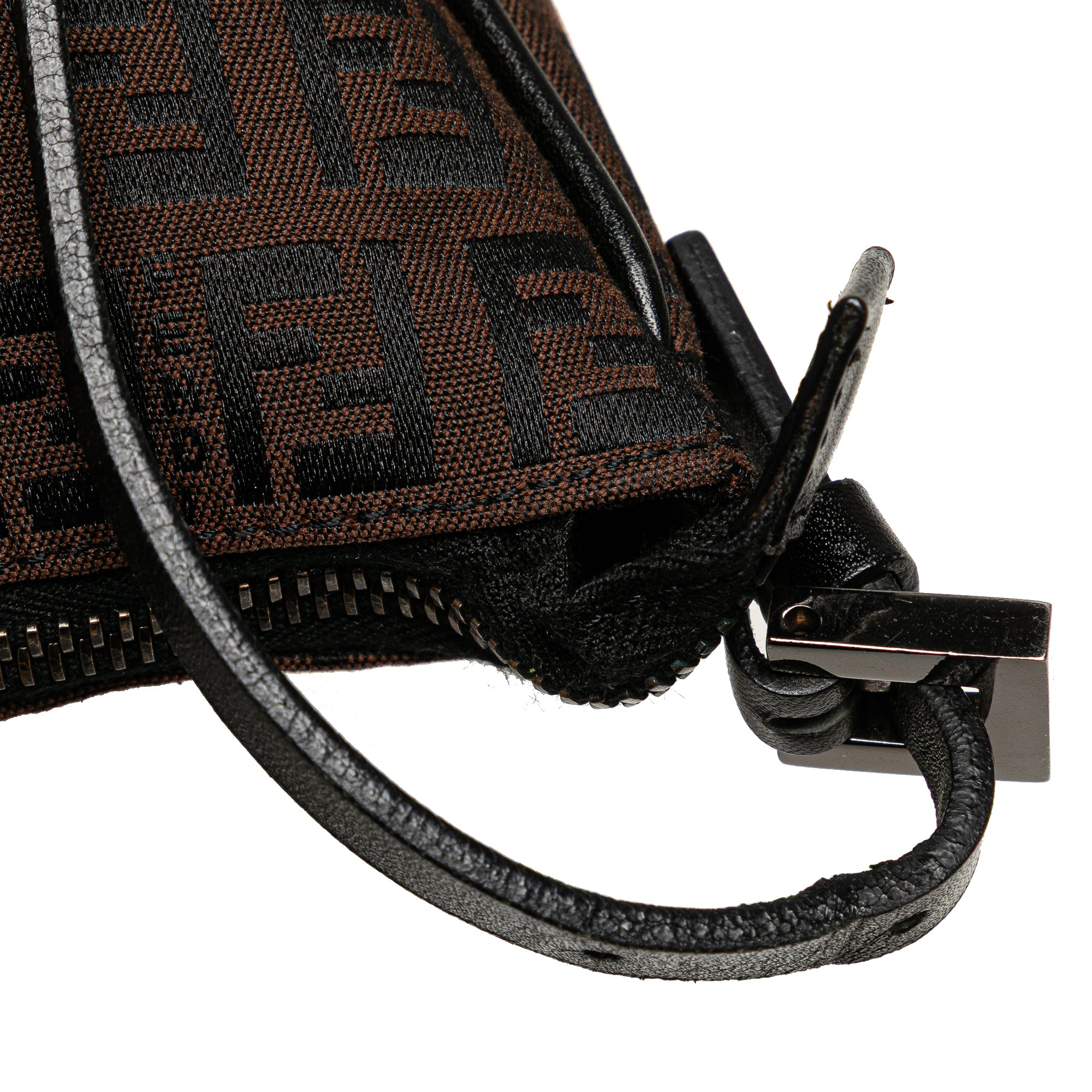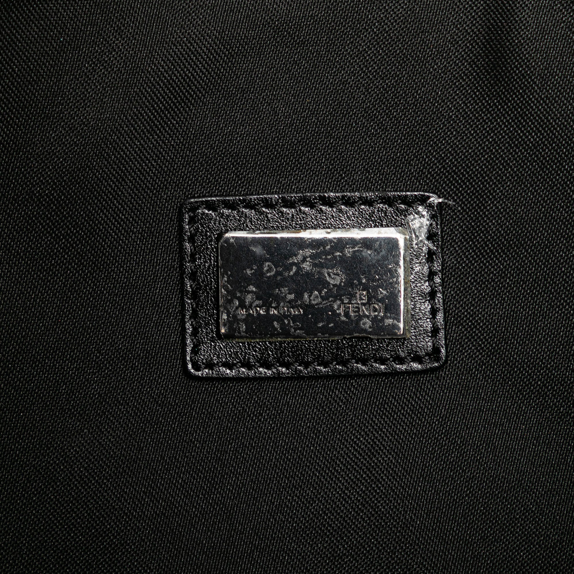 This shoulder bag features a canvas body with leather trim, a flat leather shoulder strap, and a top zip closure. Retail Price: 800.00