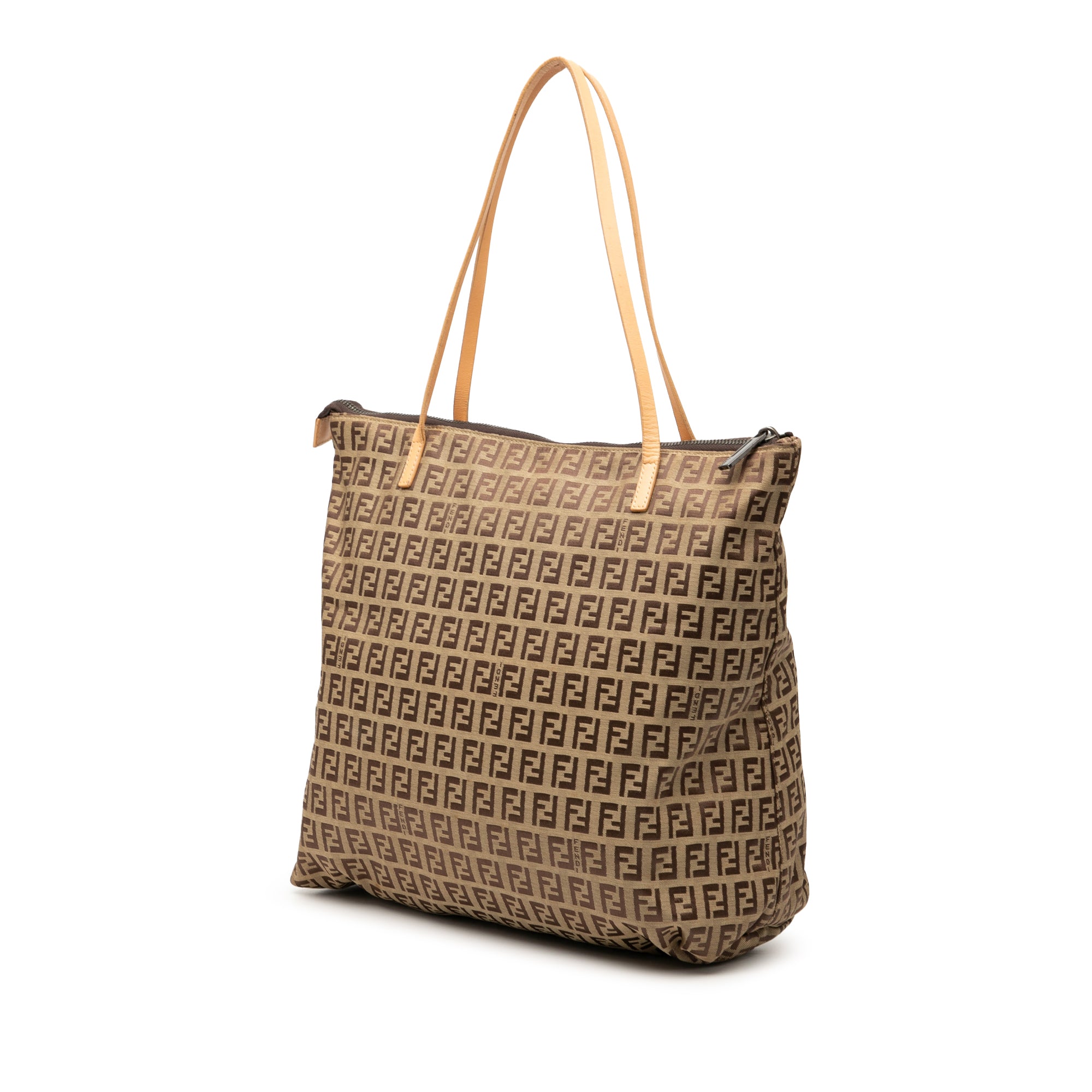 This tote bag features a canvas body, flat leather straps, a top zip closure, and an interior zip pocket. Retail Price: 1250.00