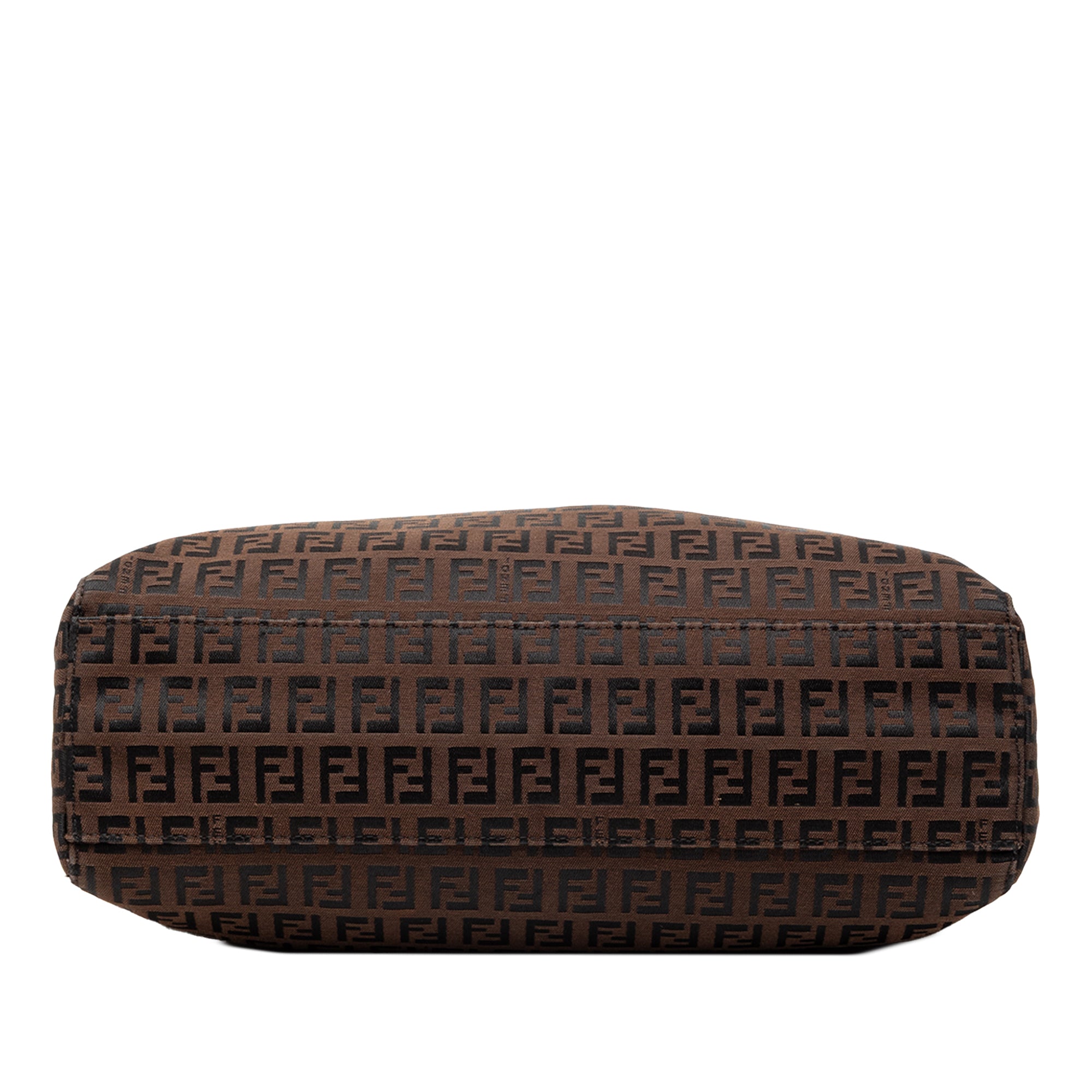 This tote bag features a canvas body, flat leather handles, an open top, an interior center zip compartment, and an interior zip pocket. Retail Price: 1050.00