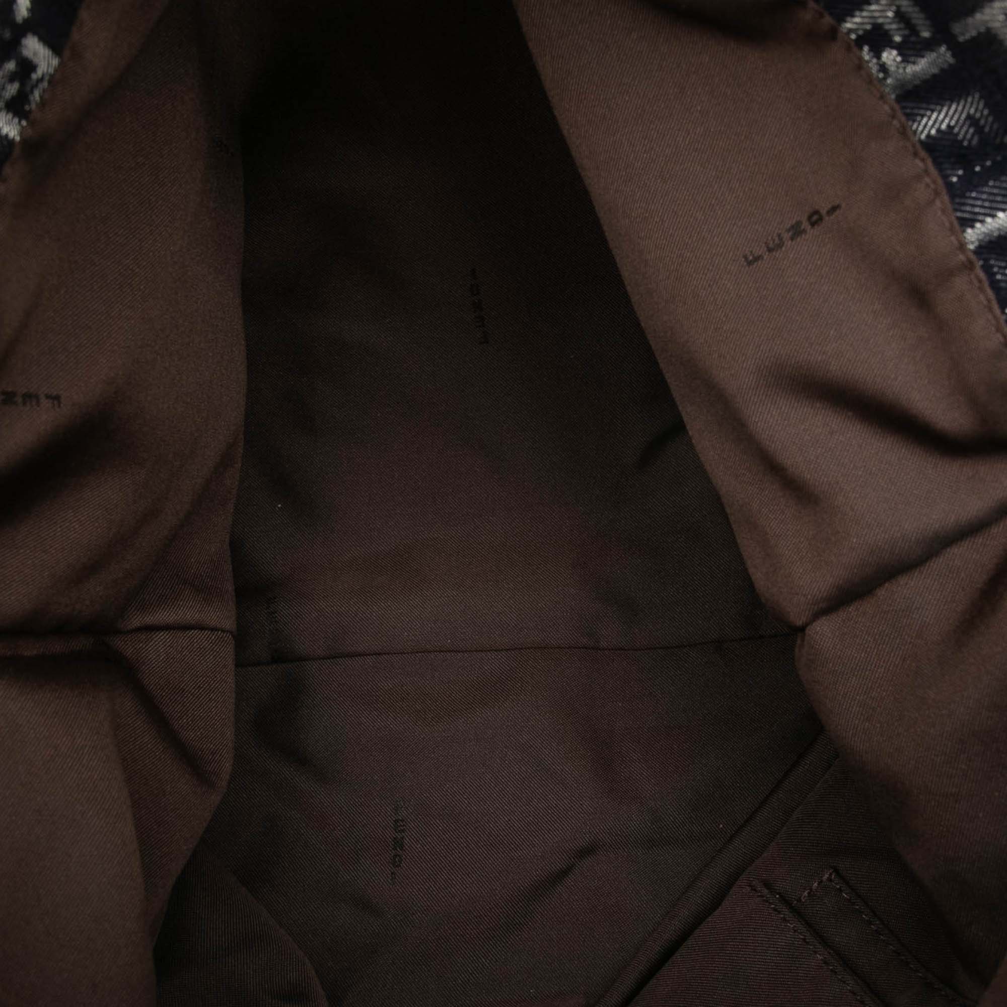 This tote bag features a denim body with leather trim, flat leather straps, an open top, and interior slip pockets. Retail Price: 850.00