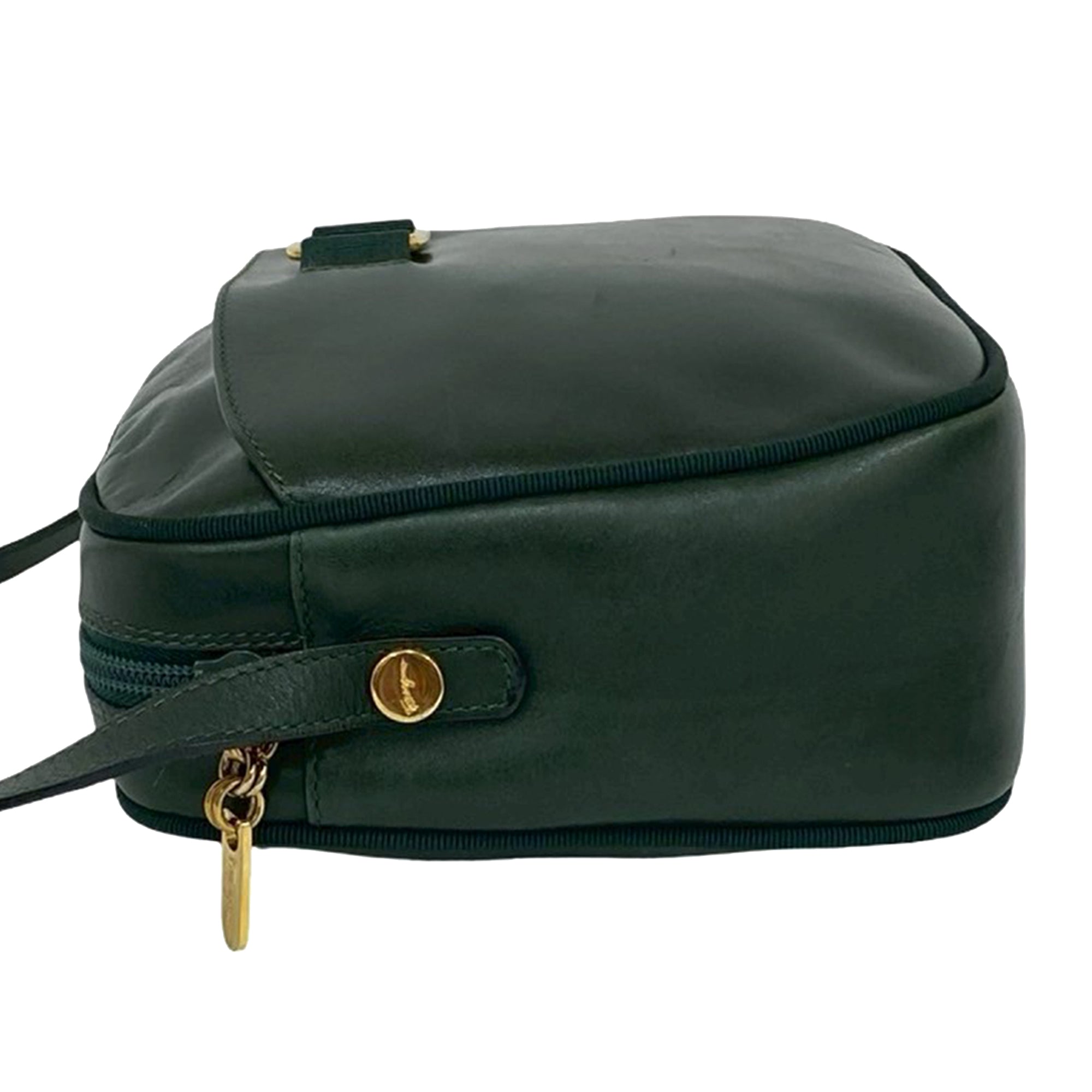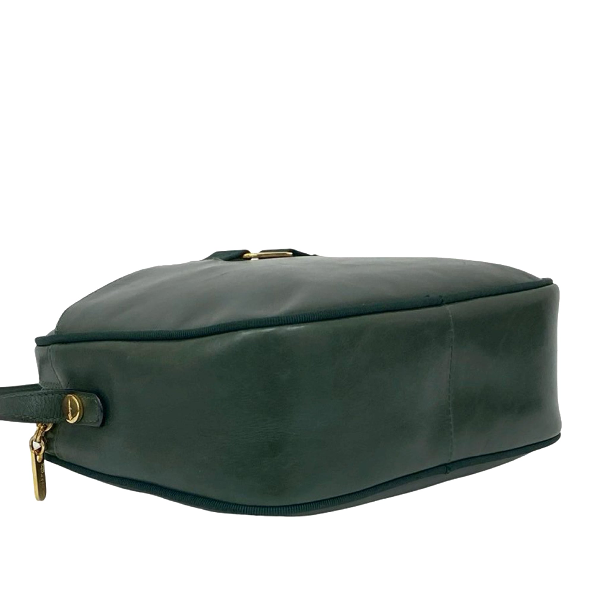 This crossbody bag features a leather body with bow and canvas piping details, an adjustable flat leather shoulder strap, a top zip closure, an exterior front slip pocket, and an interior zip pocket. Retail Price: 795.00