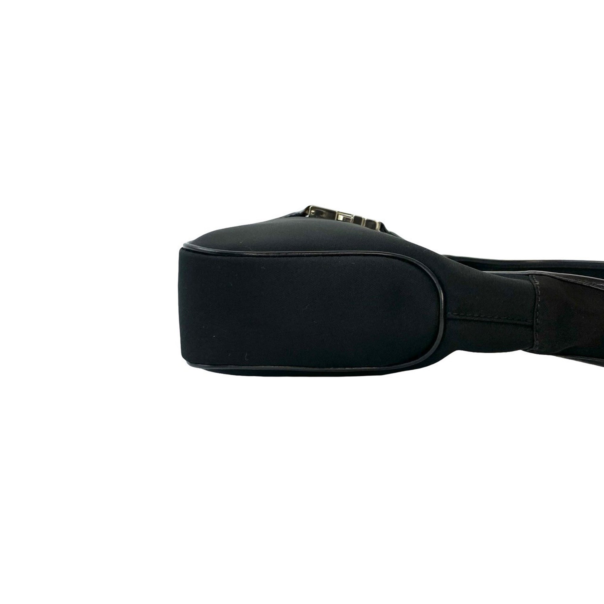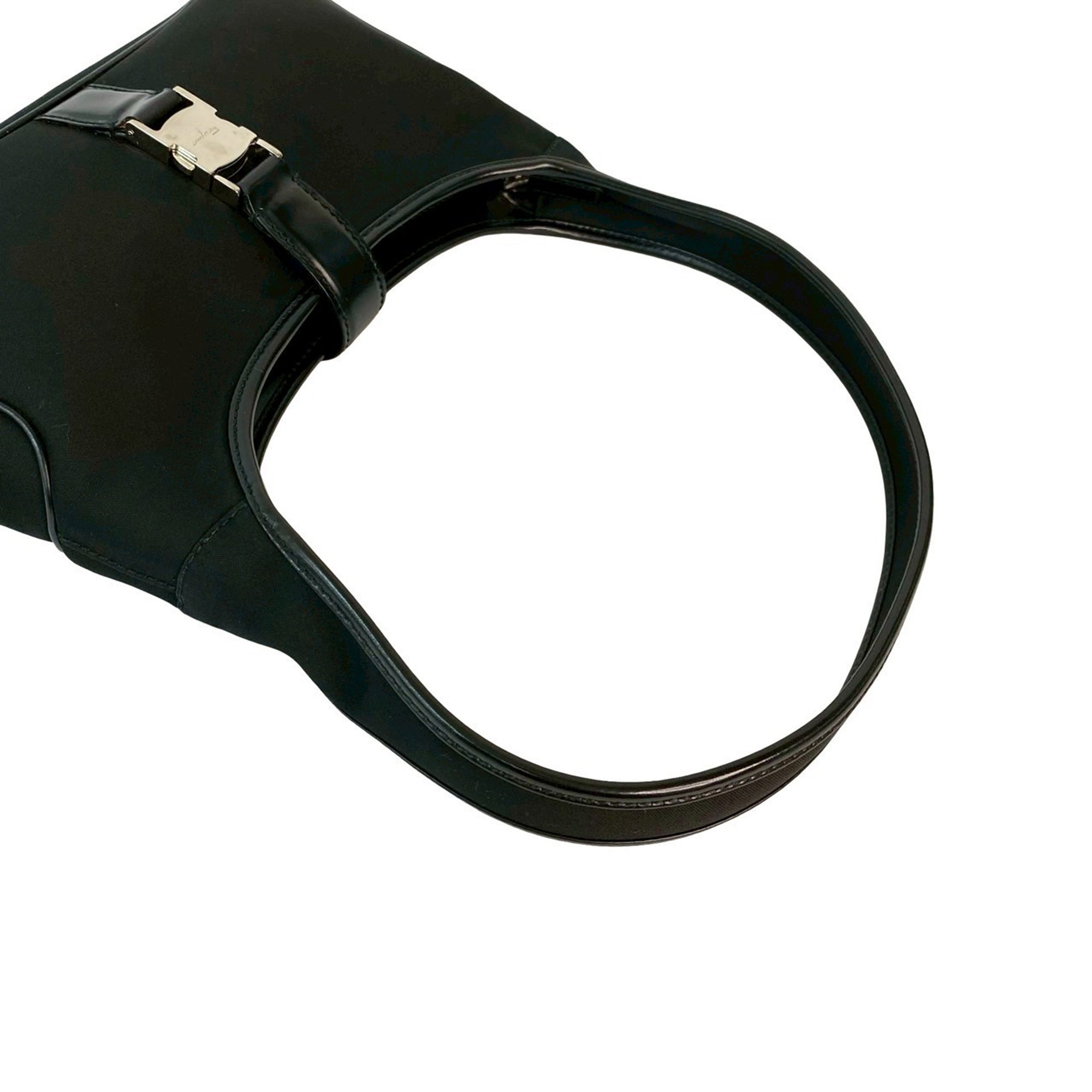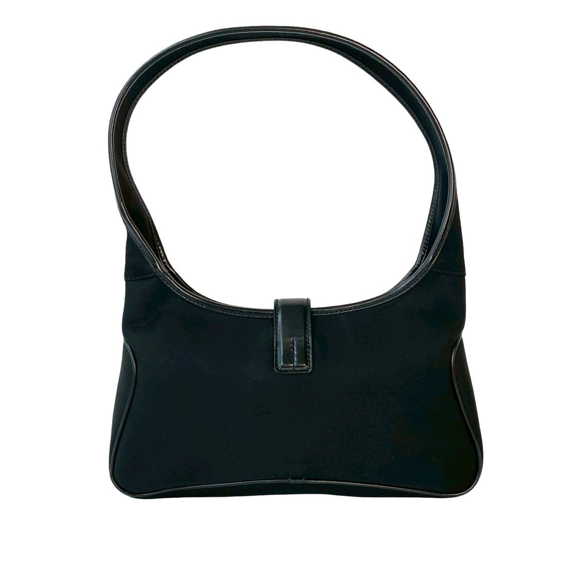 This shoulder bag features a canvas body with leather trim, a flat leather strap, a top zip closure with a flat strap, and an interior zip pocket. Retail Price: 814.00