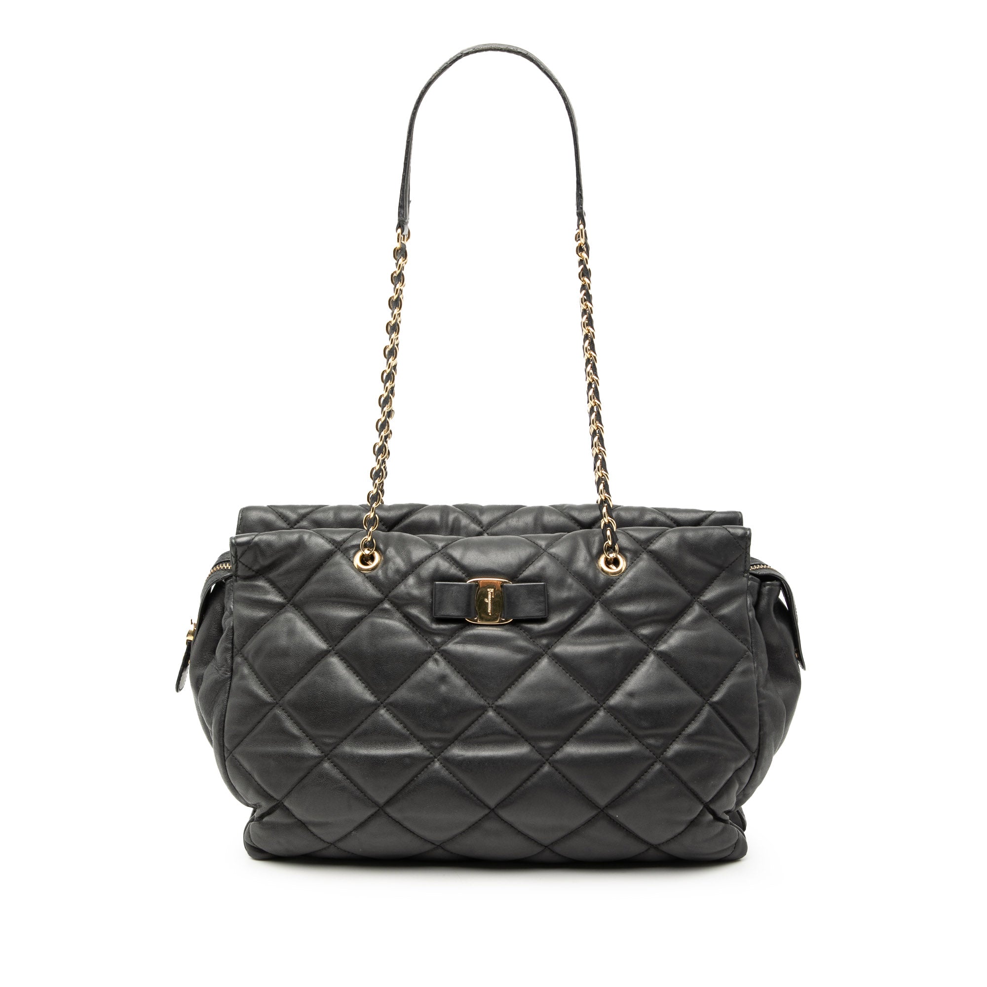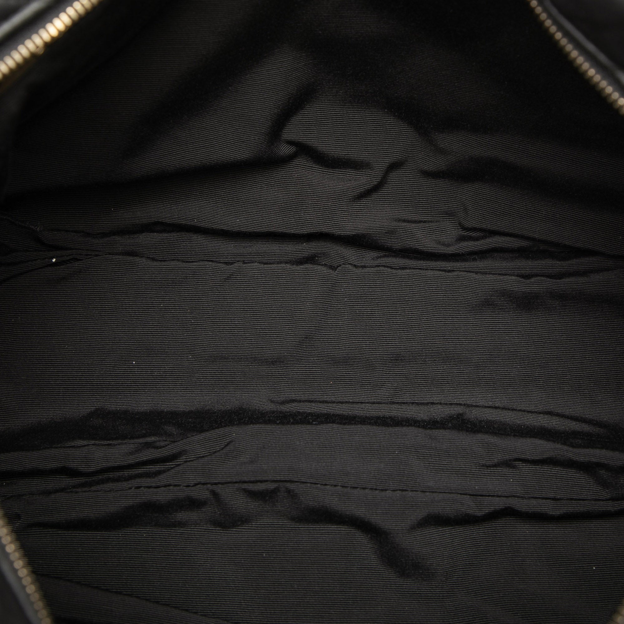 This tote bag features a quilted nappa leather body, leather-woven chain link straps with leather guard, a top zip closure, and an interior zip pocket. Retail Price: 1250.00