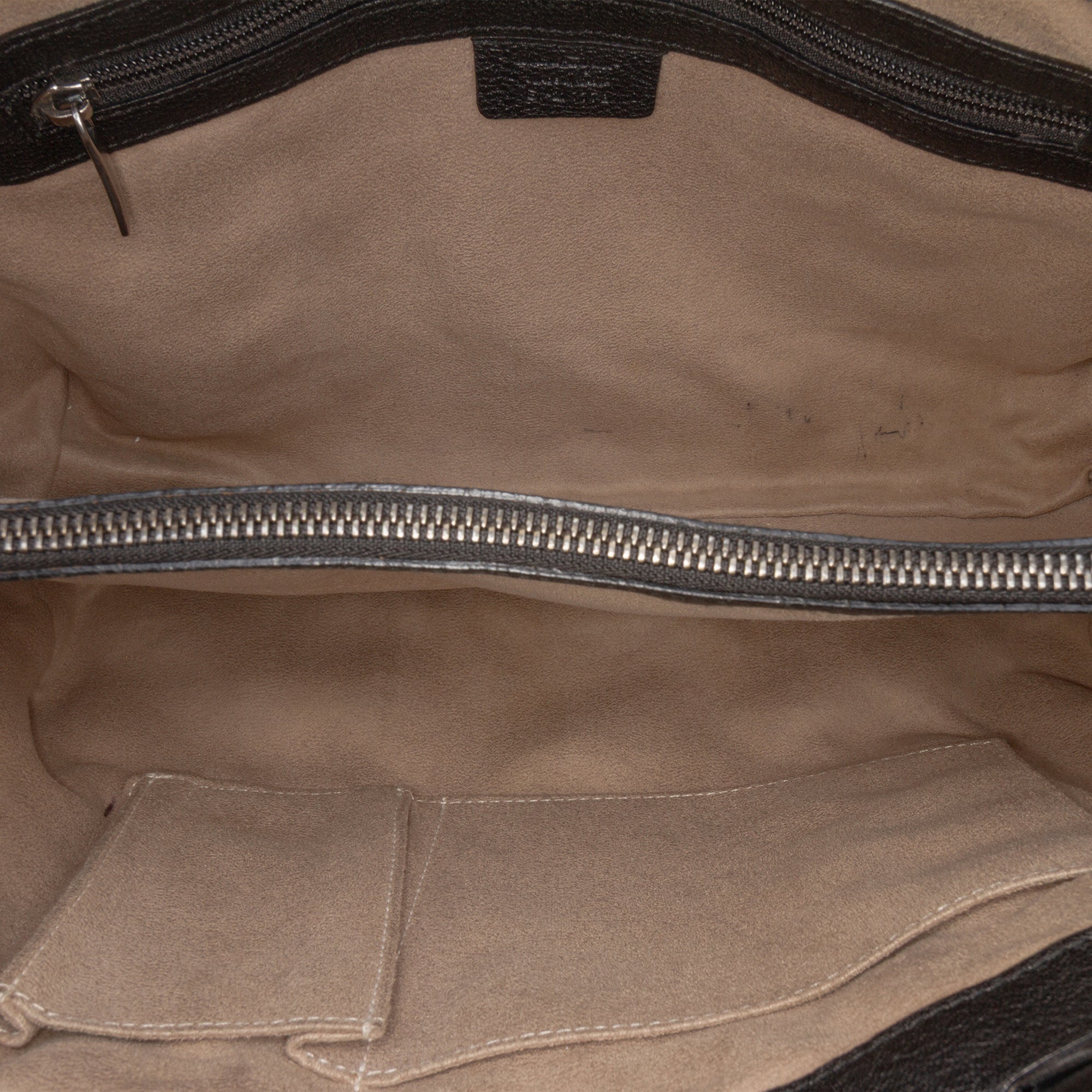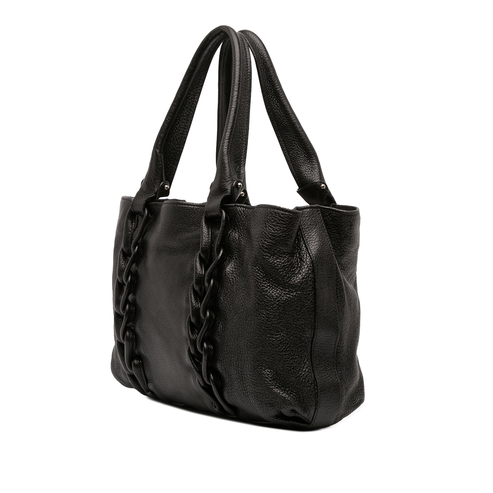 This tote bag features a leather body with braid detail, flat leather handles, an open top, an interior center zip compartment, and interior zip and slip pockets. Retail Price: 292.00