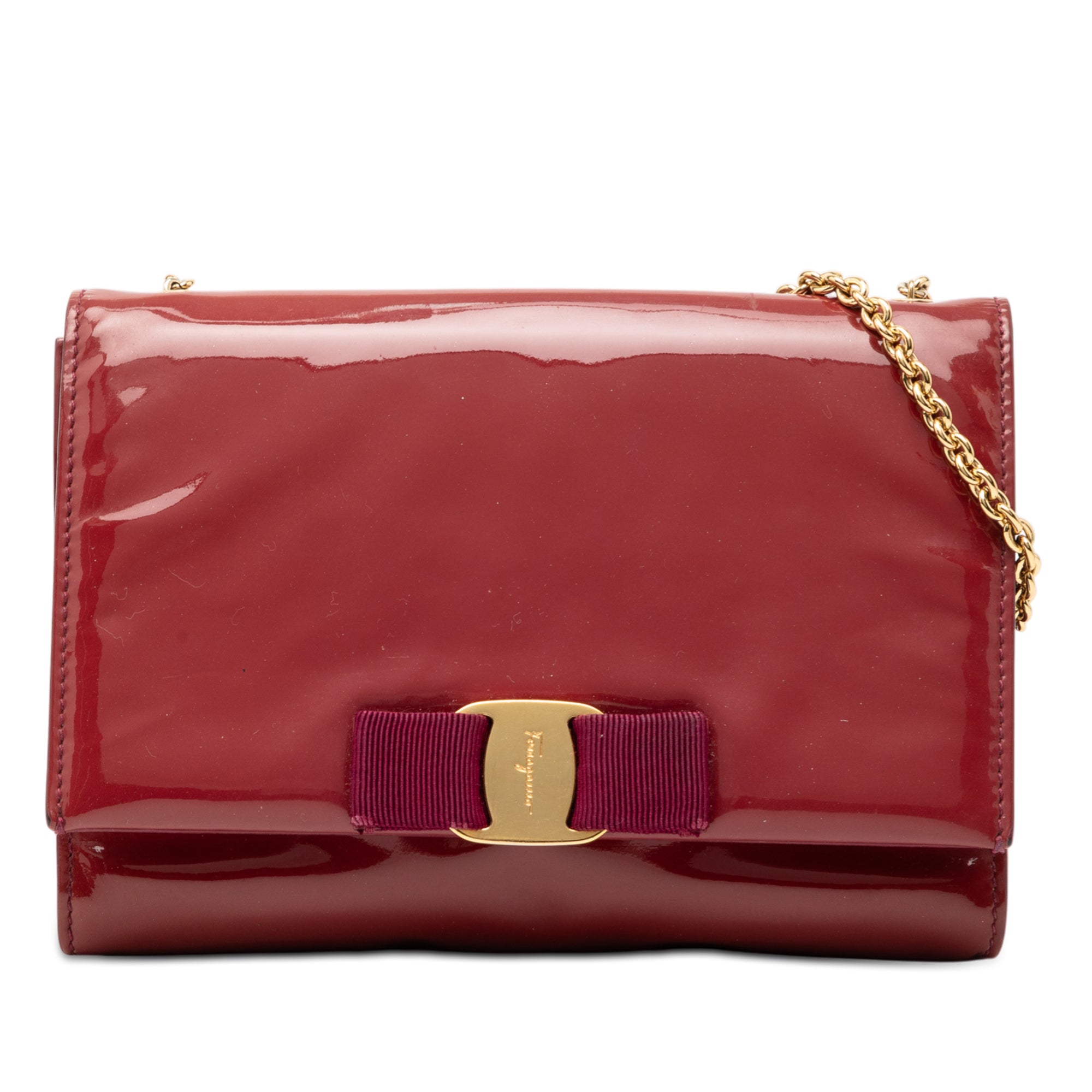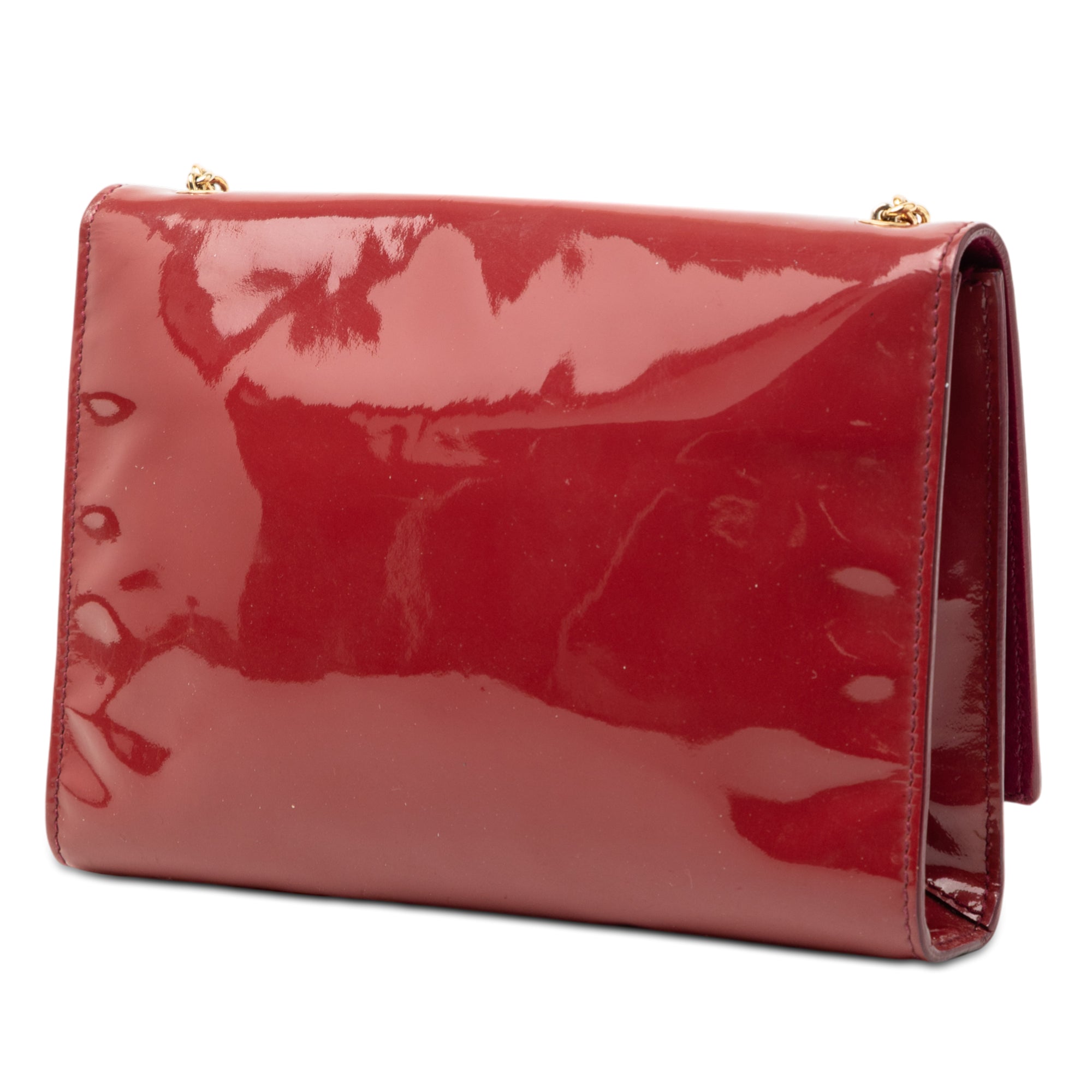 This crossbody bag features a patent leather body, a chain link strap, a flap with bow detail and magnetic snap closure, and interior slip pockets. Retail Price: 700.00