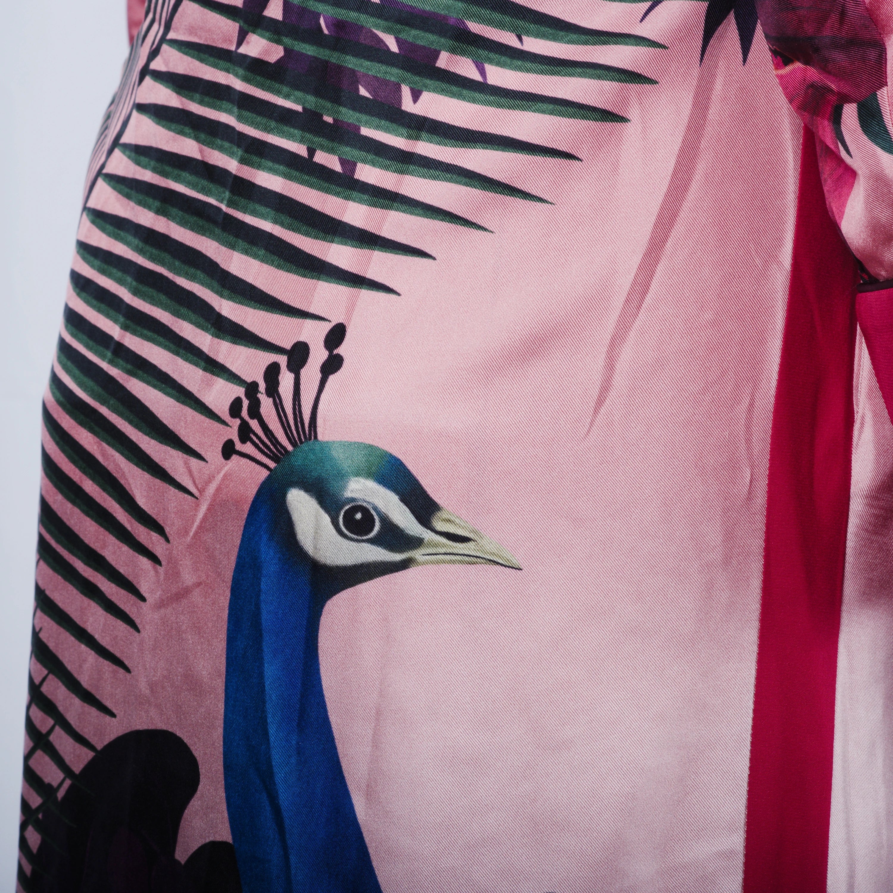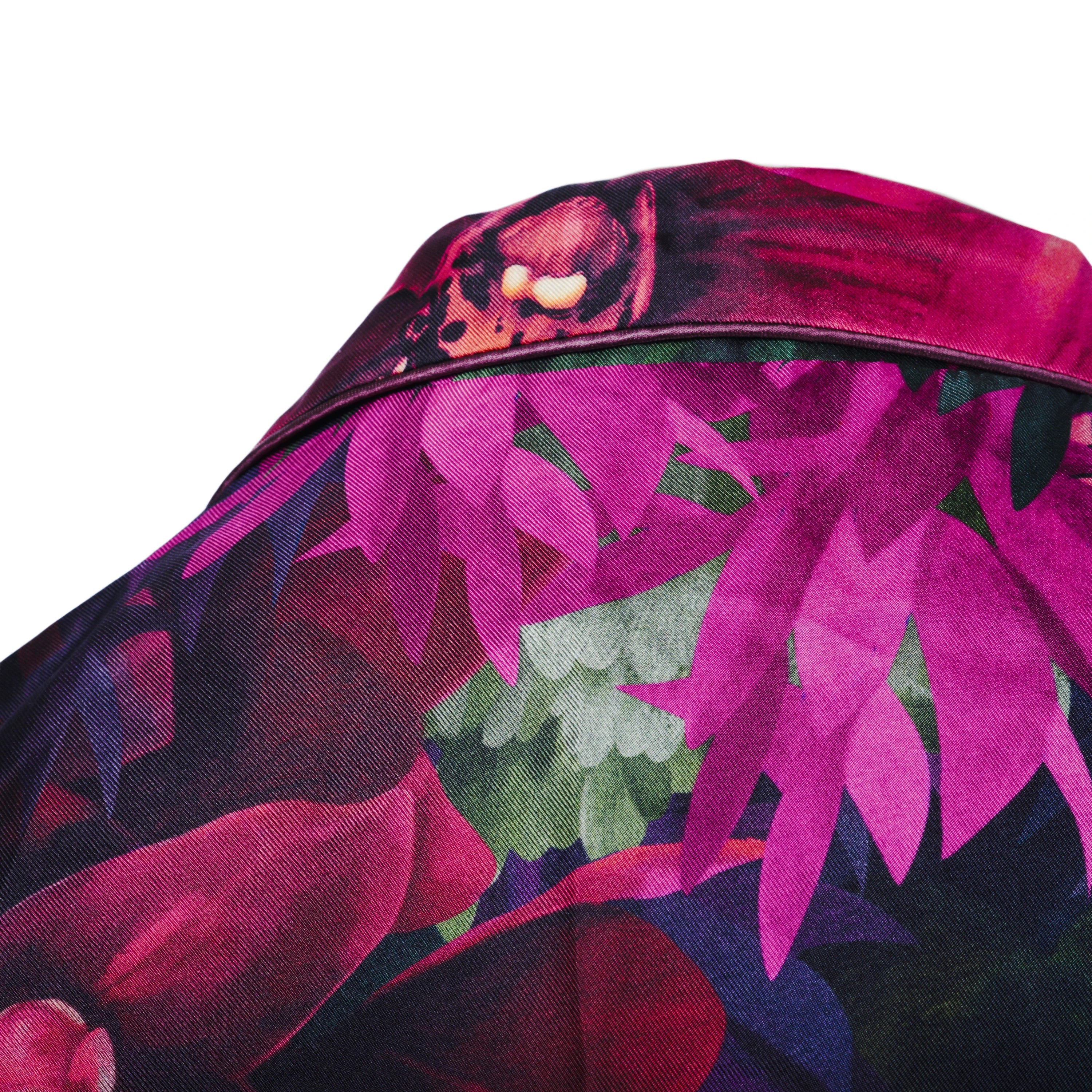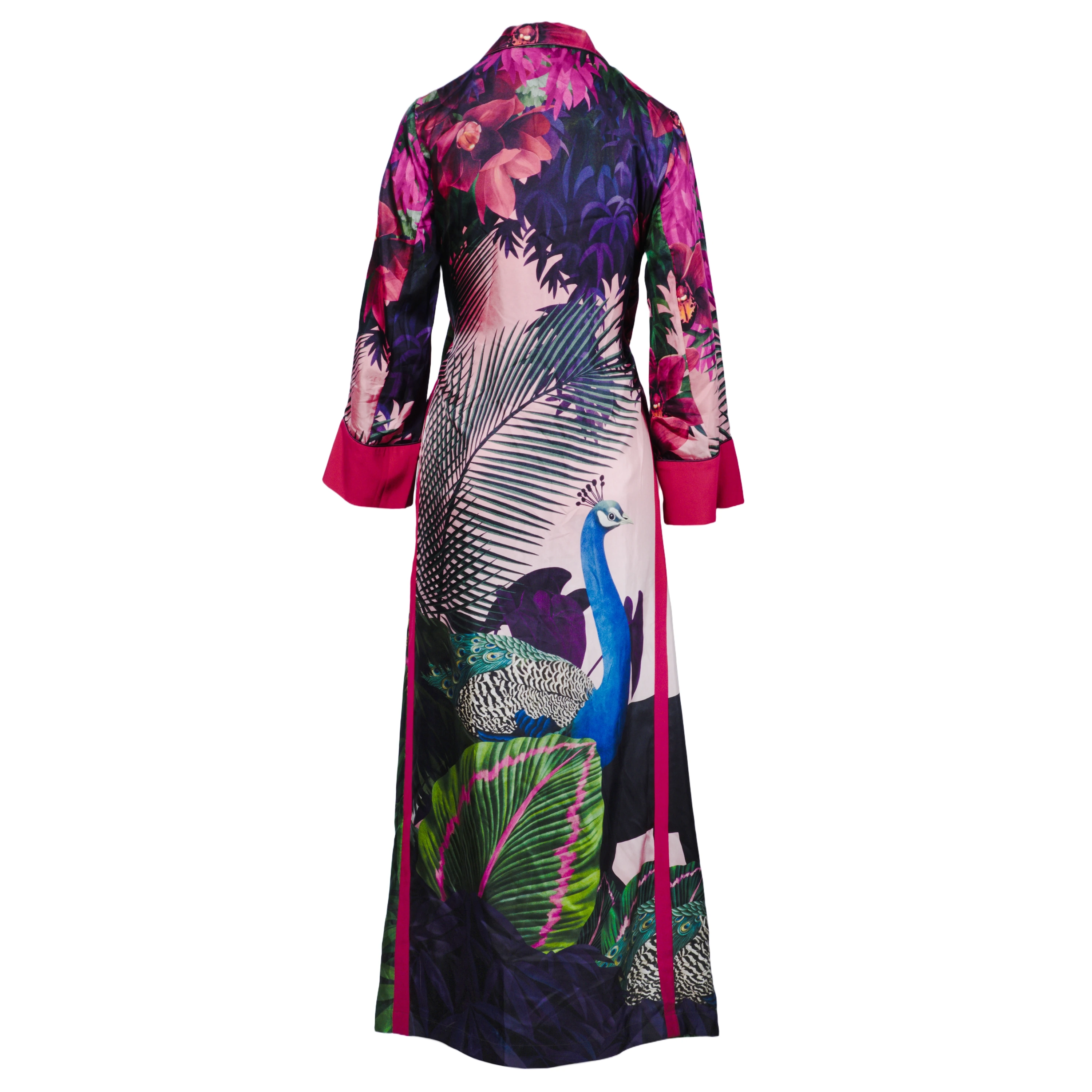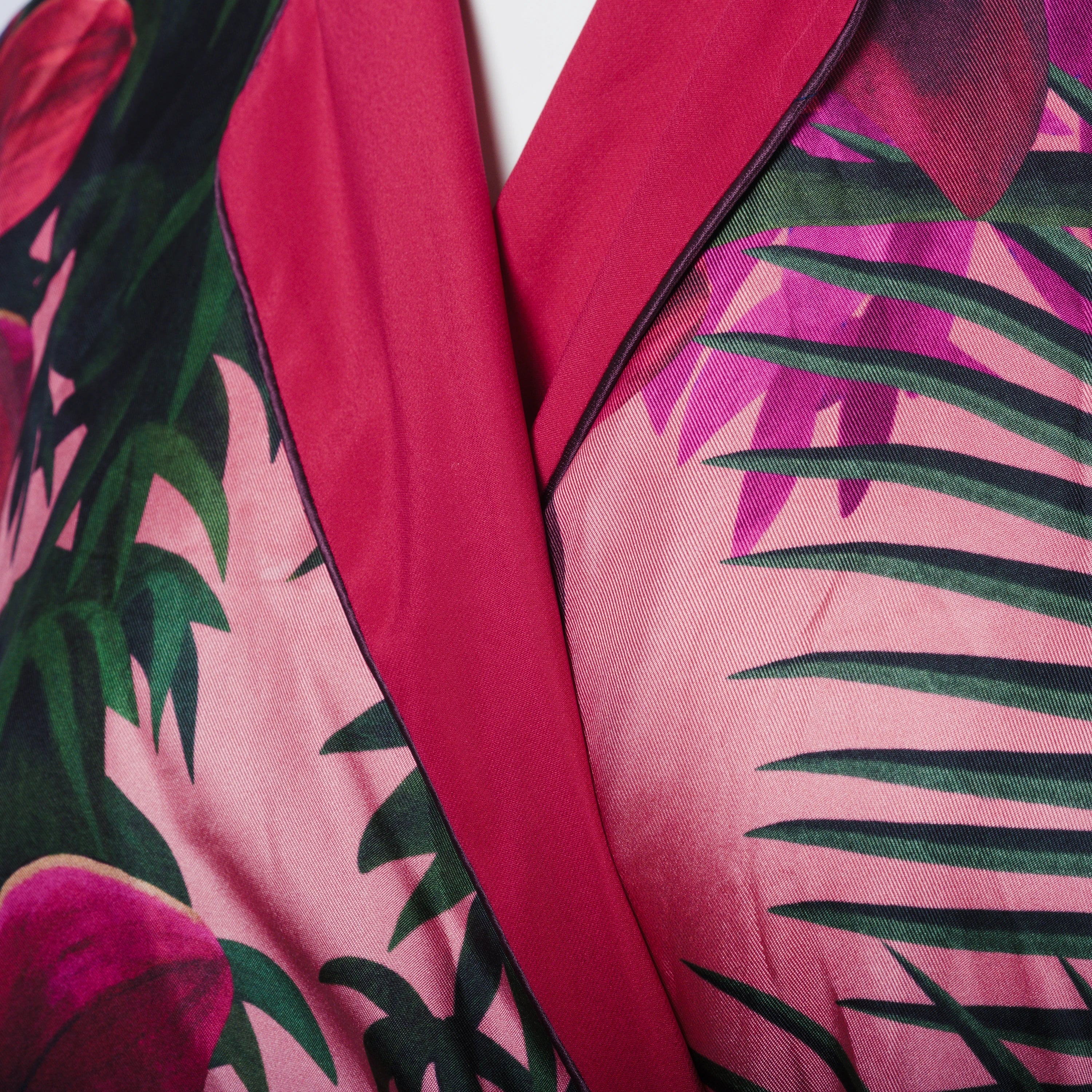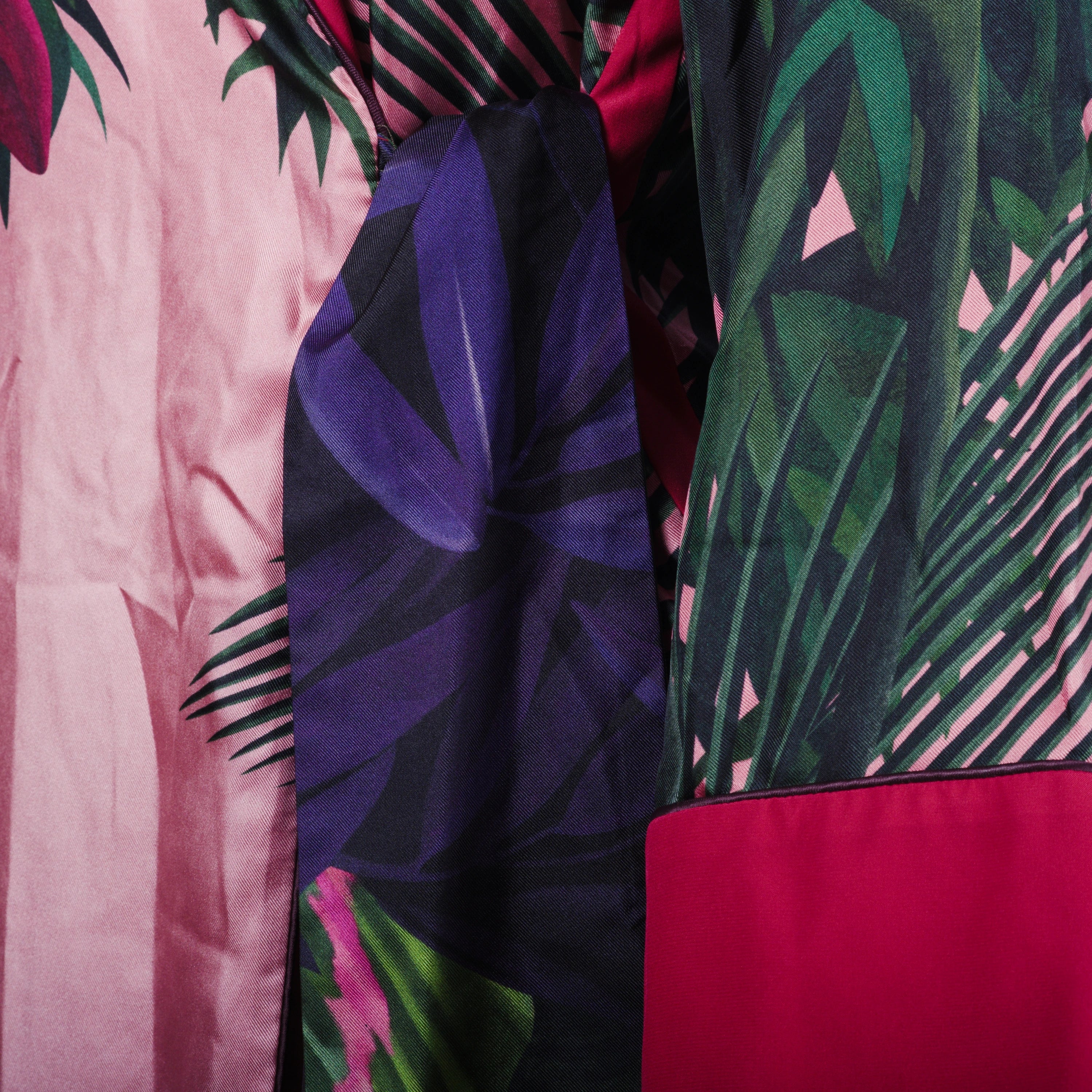 This long silk dress by For Restless Sleepers features a floral print inspired by the Amazon rainforest, with vibrant, natural colors that immediately catch the eye. The lightweight, flowing silk drapes gracefully over the body, creating an elegant and refined look suitable for a variety of occasions.