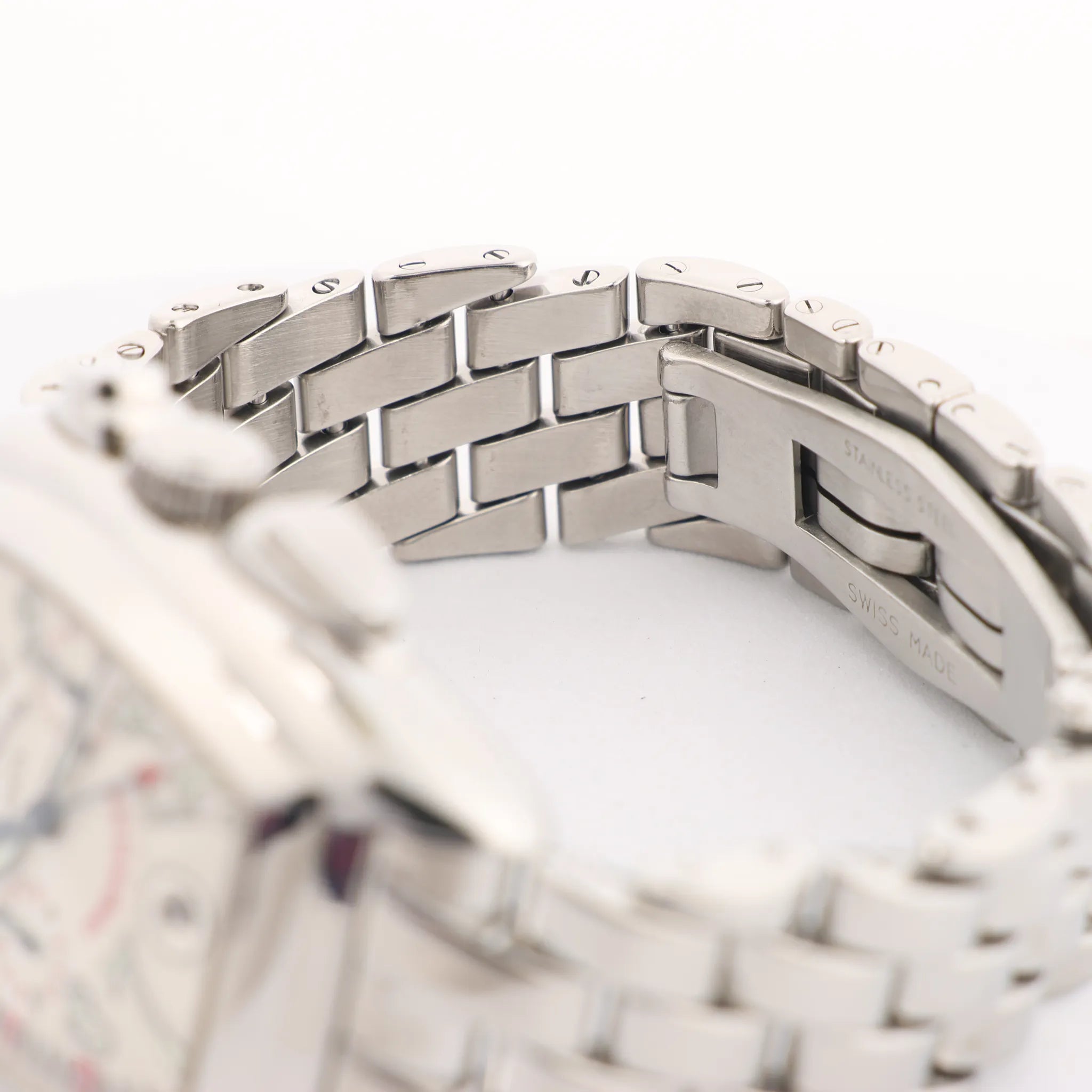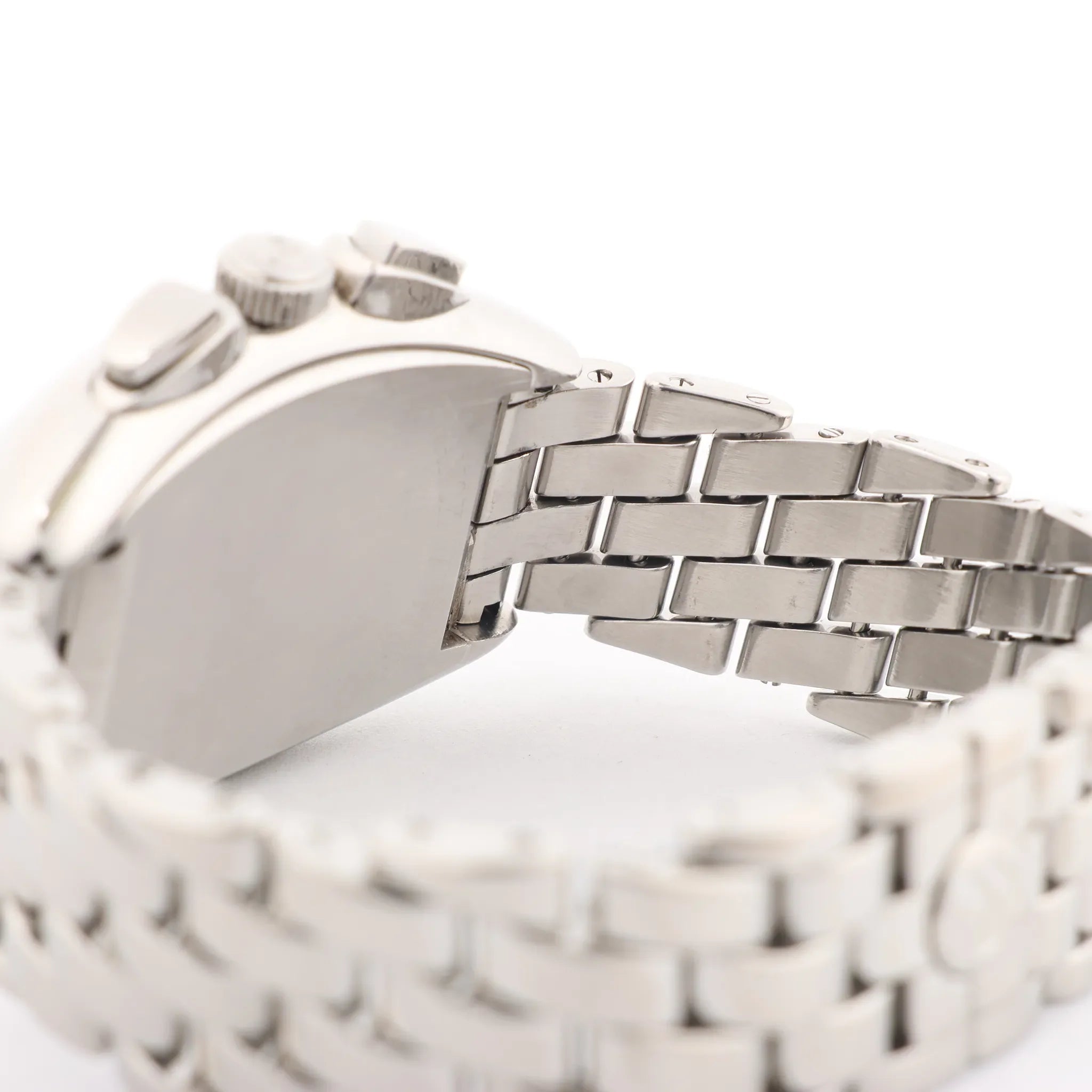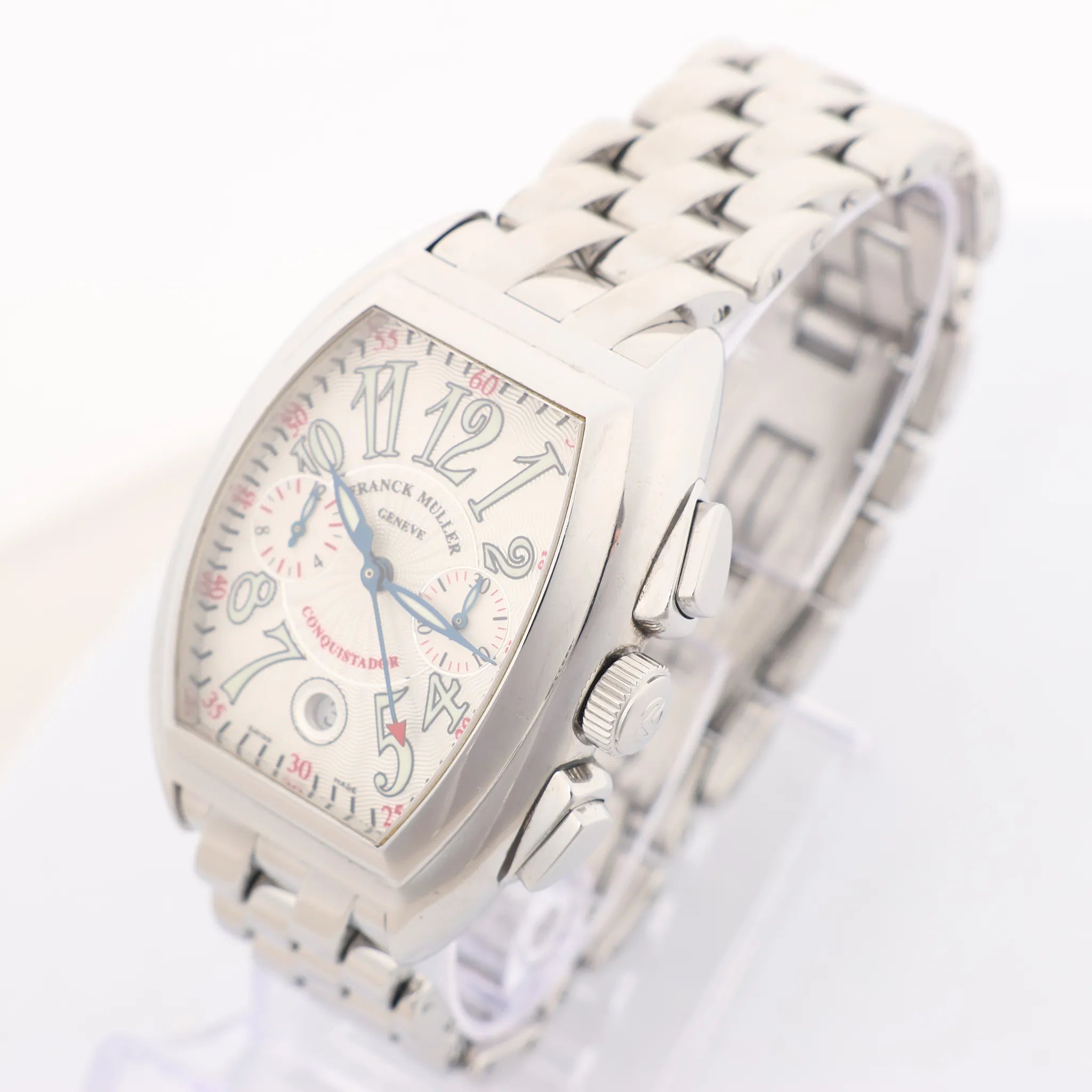 Brand: Franck MullerModel: ConquistadorReference: 8002CCSerial No.: 1138Condition: Excellent Condition Details: Excellent overall condition with almost no visible signs of use. Barely noticeable hairline marks may be present, but they are not visible to the naked eye. Please see photos for details. Dial Colour: BeigeCase Material: Stainless steel Starp Colour: Silver Strap material: Stainless steelMovement: AutomaticClosure: Fold claspDial Diameter: 48 x 35 mmApprox. circumference: 18 cmComes With: Original Box, Document, extra links
