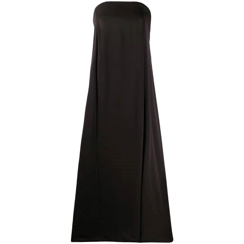 Gianfranco Ferrè black silk long strapless trapeze-line dress with comfort fit, asymmetrical back drape and side slit. Back zip fastening. This item belongs to a deadstock and it has never been worn.