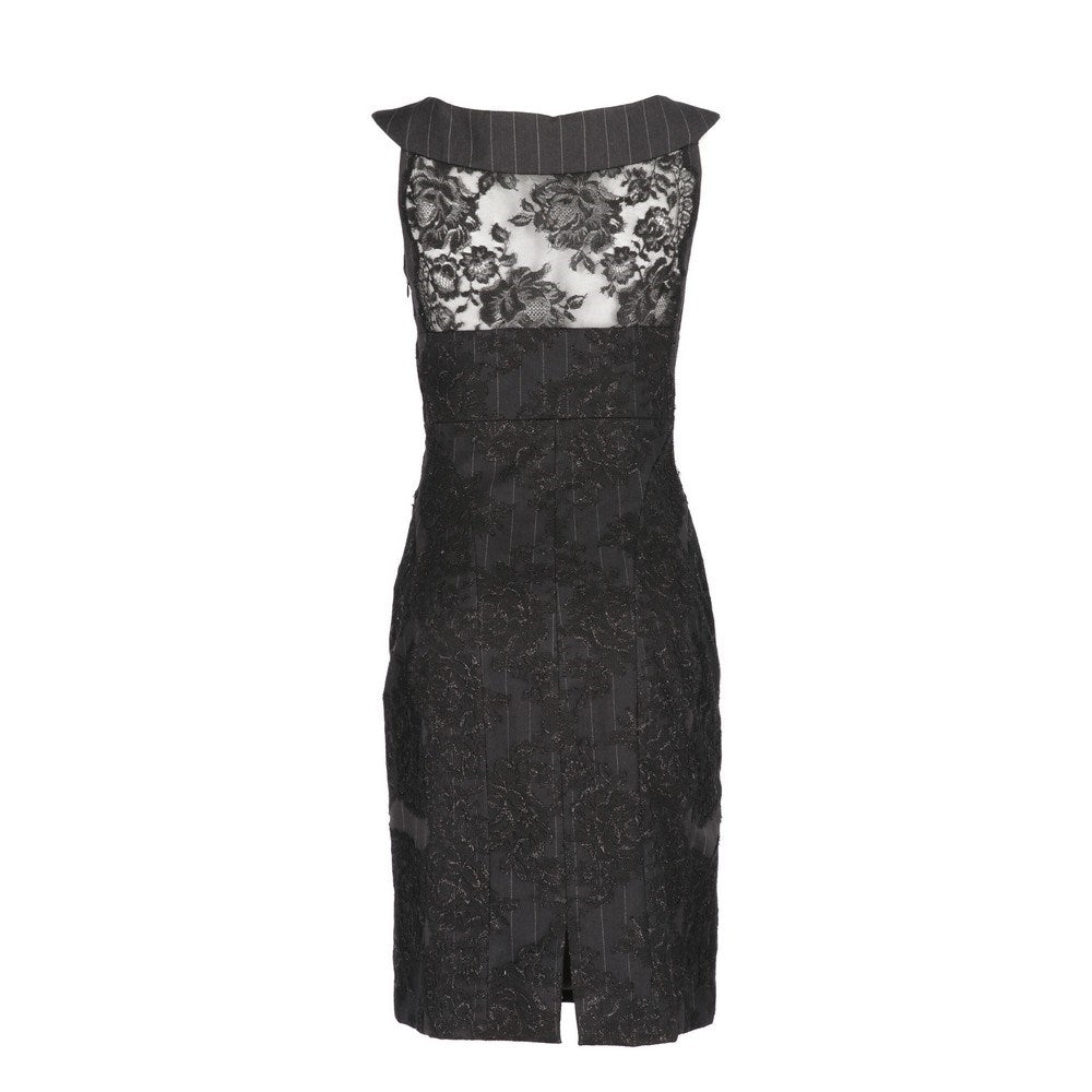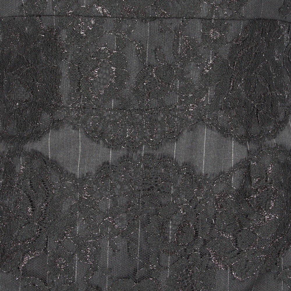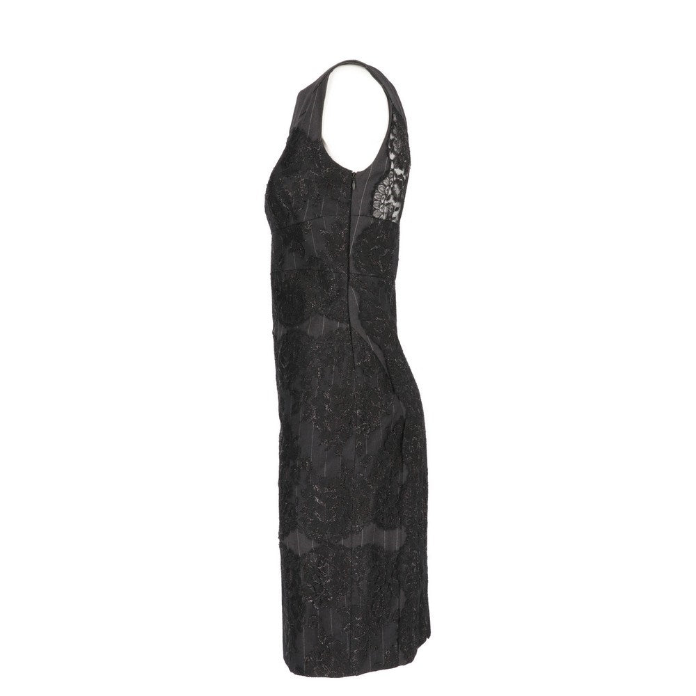 Gianfranco Ferrè sleeveless grey pinstripe cotton dress. Black lace with roses sew on the whole dress. Top back part made by black sheer lace. Knee length, back zip closure. This item belongs to a deadstock, it has never been worn and comes with its original tag.