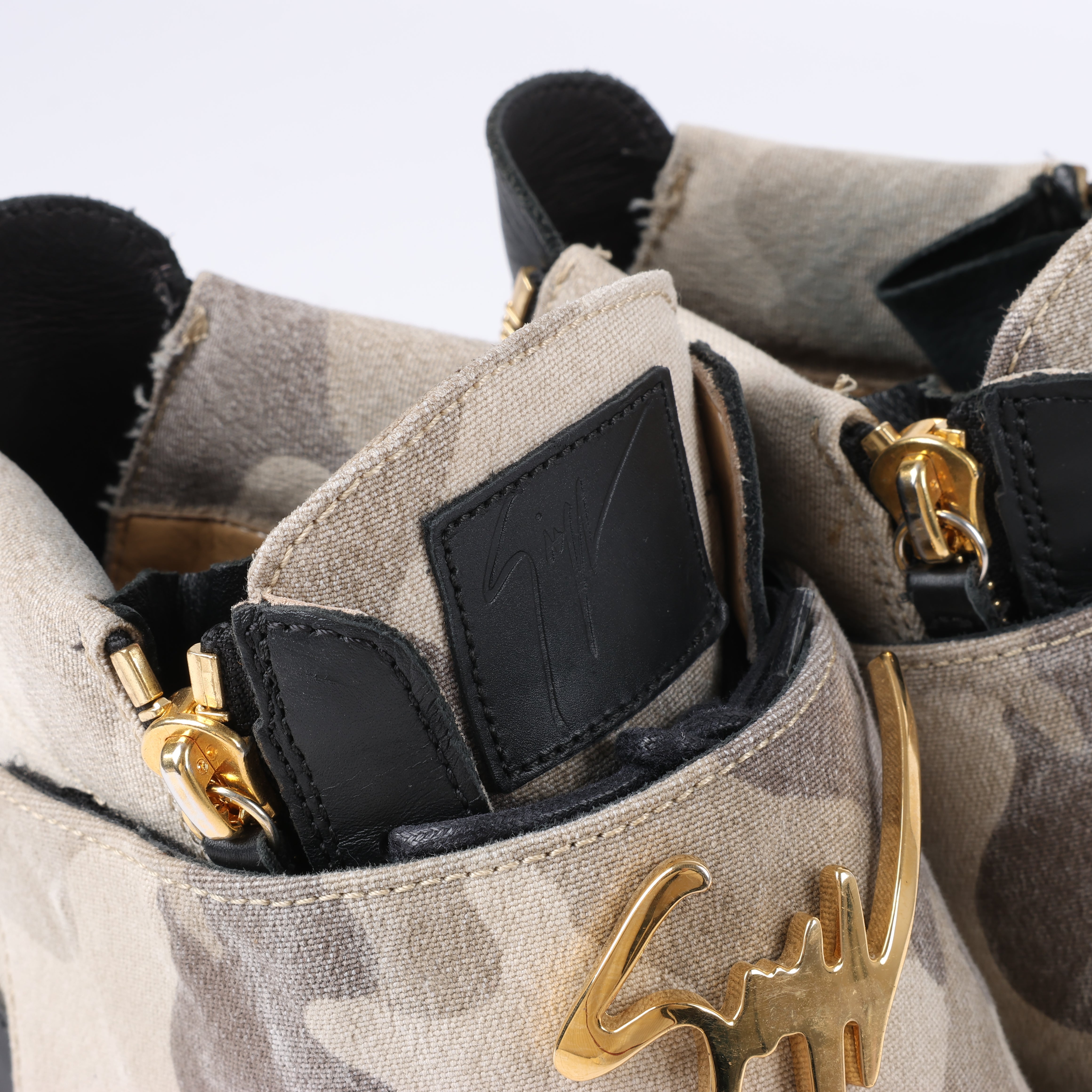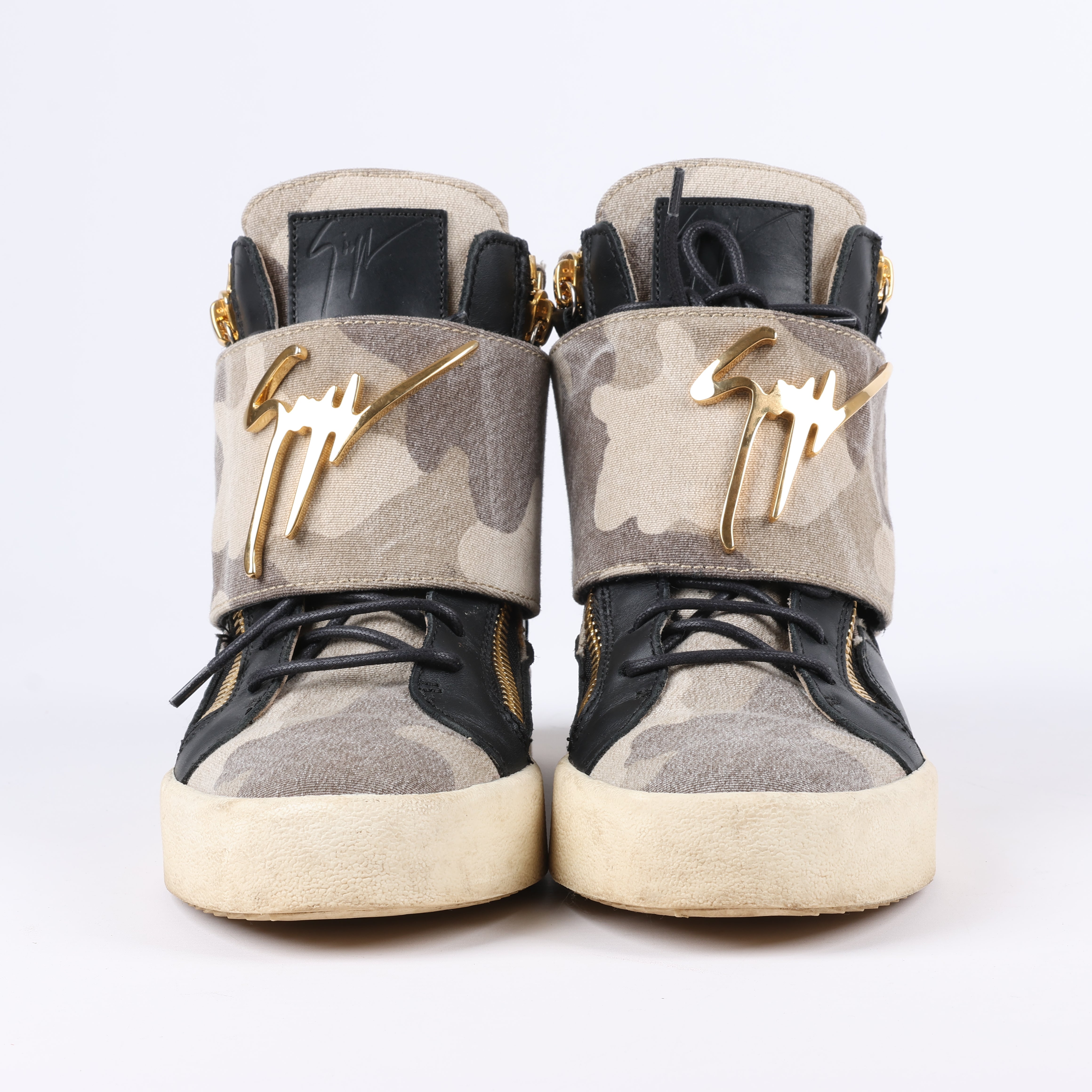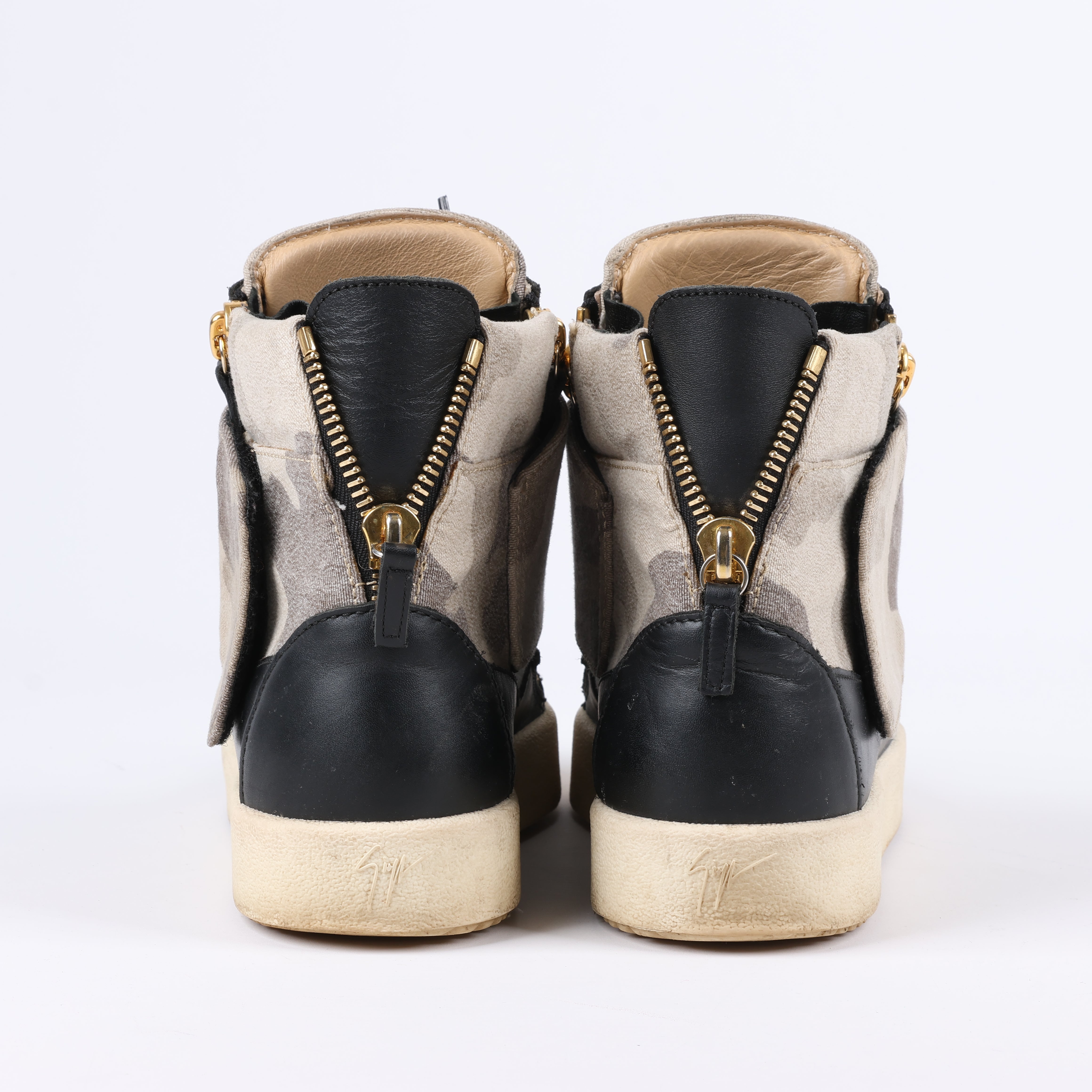 Step into bold luxury with Giuseppe Zanotti high-top sneakers in black leather and camouflage canvas, featuring gold-tone zippers and signature hardware - urban edge meets Italian craftsmanship.Brand: Giuseppe ZanottiSize: 40 EUApprox. inner lenght: 25.5 cmCondition: ExcellentCondition Details: Pre-Owned. Lovingly worn with a lot of life left in them.Colors: Black, GrayMaterials: LeatherComes With: Dustbags