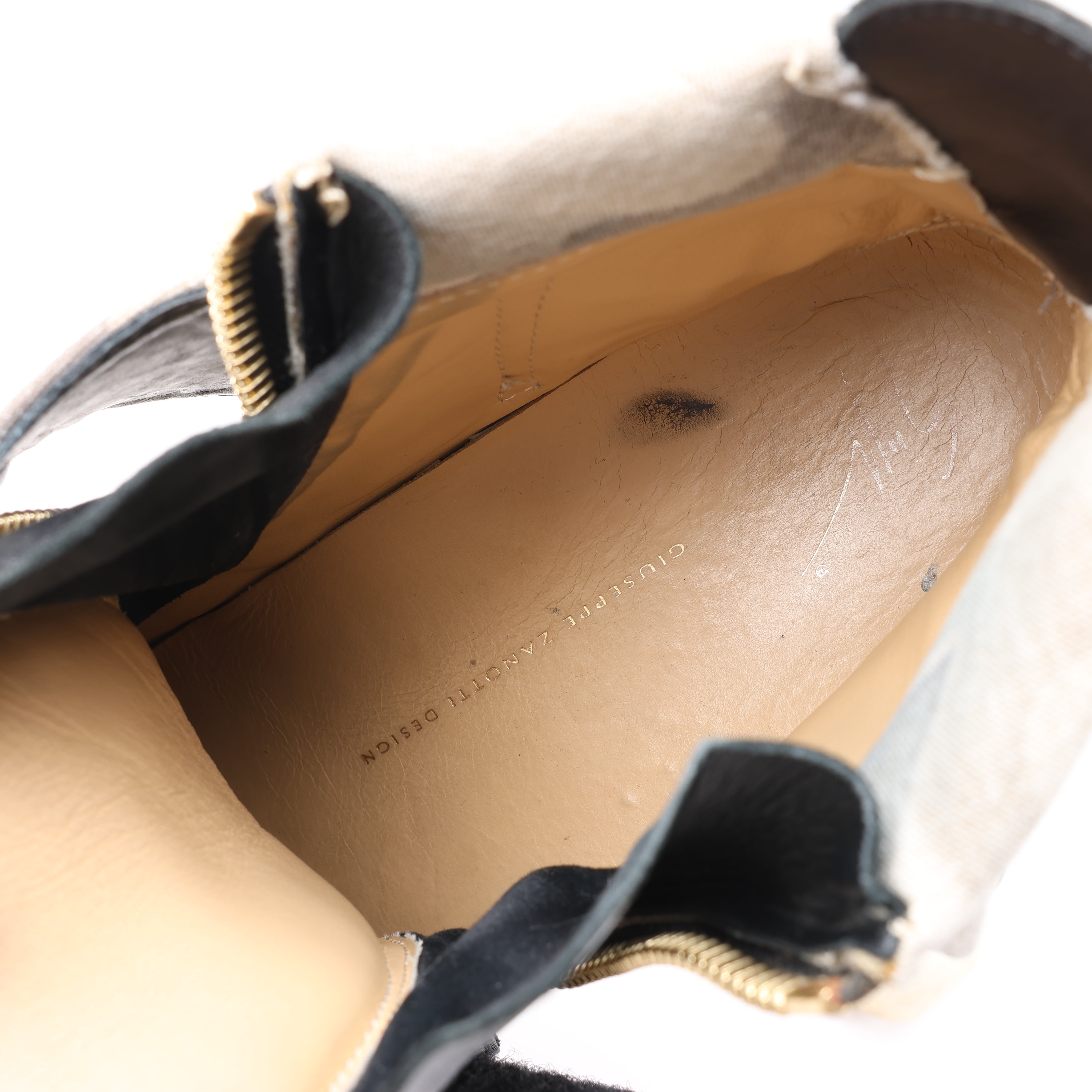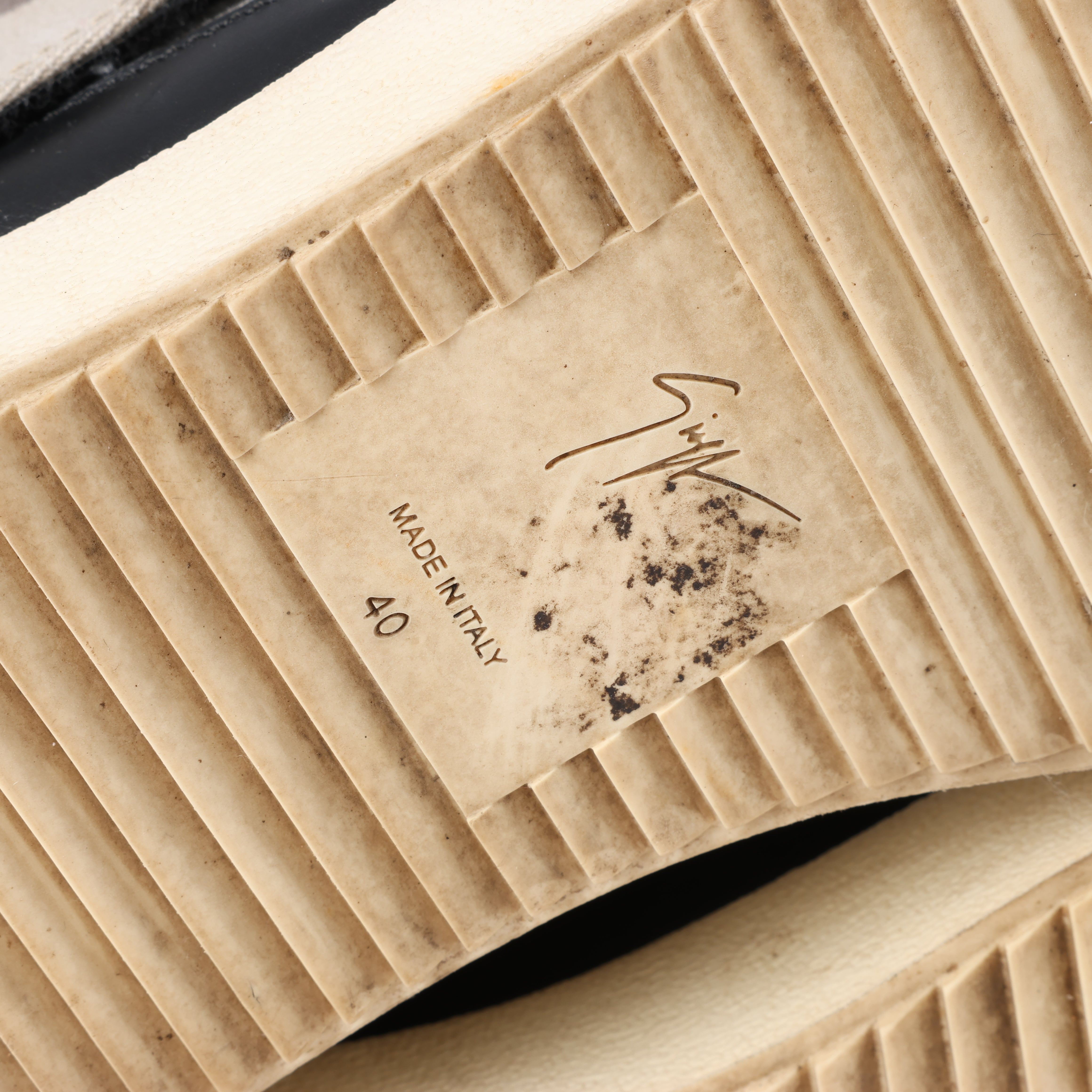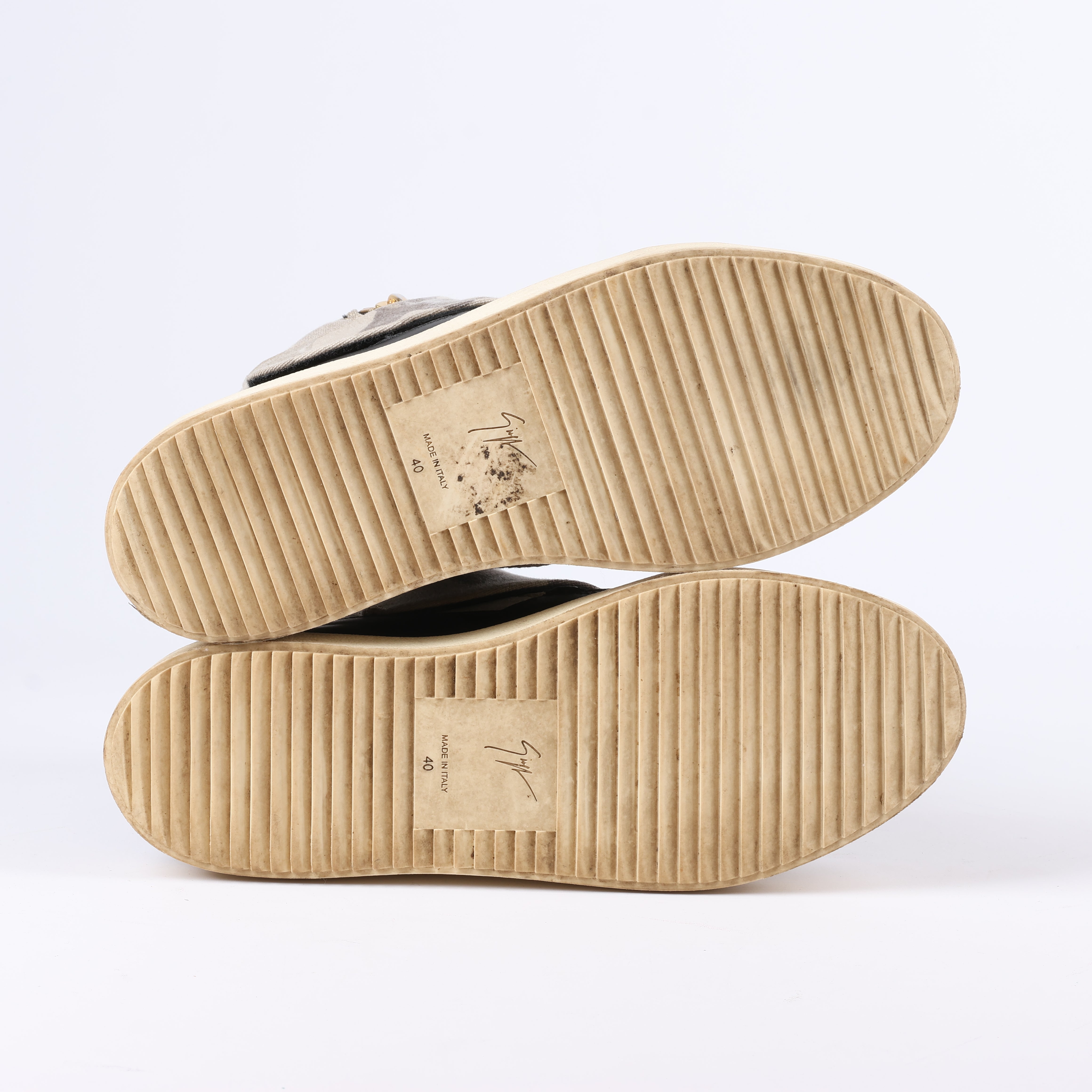 Step into bold luxury with Giuseppe Zanotti high-top sneakers in black leather and camouflage canvas, featuring gold-tone zippers and signature hardware - urban edge meets Italian craftsmanship.Brand: Giuseppe ZanottiSize: 40 EUApprox. inner lenght: 25.5 cmCondition: ExcellentCondition Details: Pre-Owned. Lovingly worn with a lot of life left in them.Colors: Black, GrayMaterials: LeatherComes With: Dustbags
