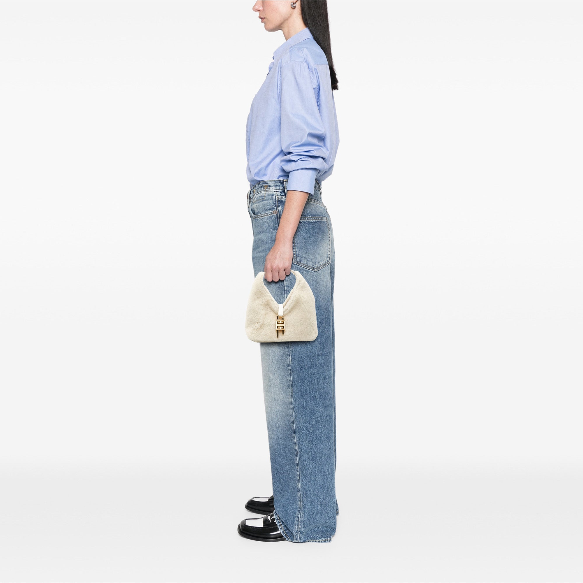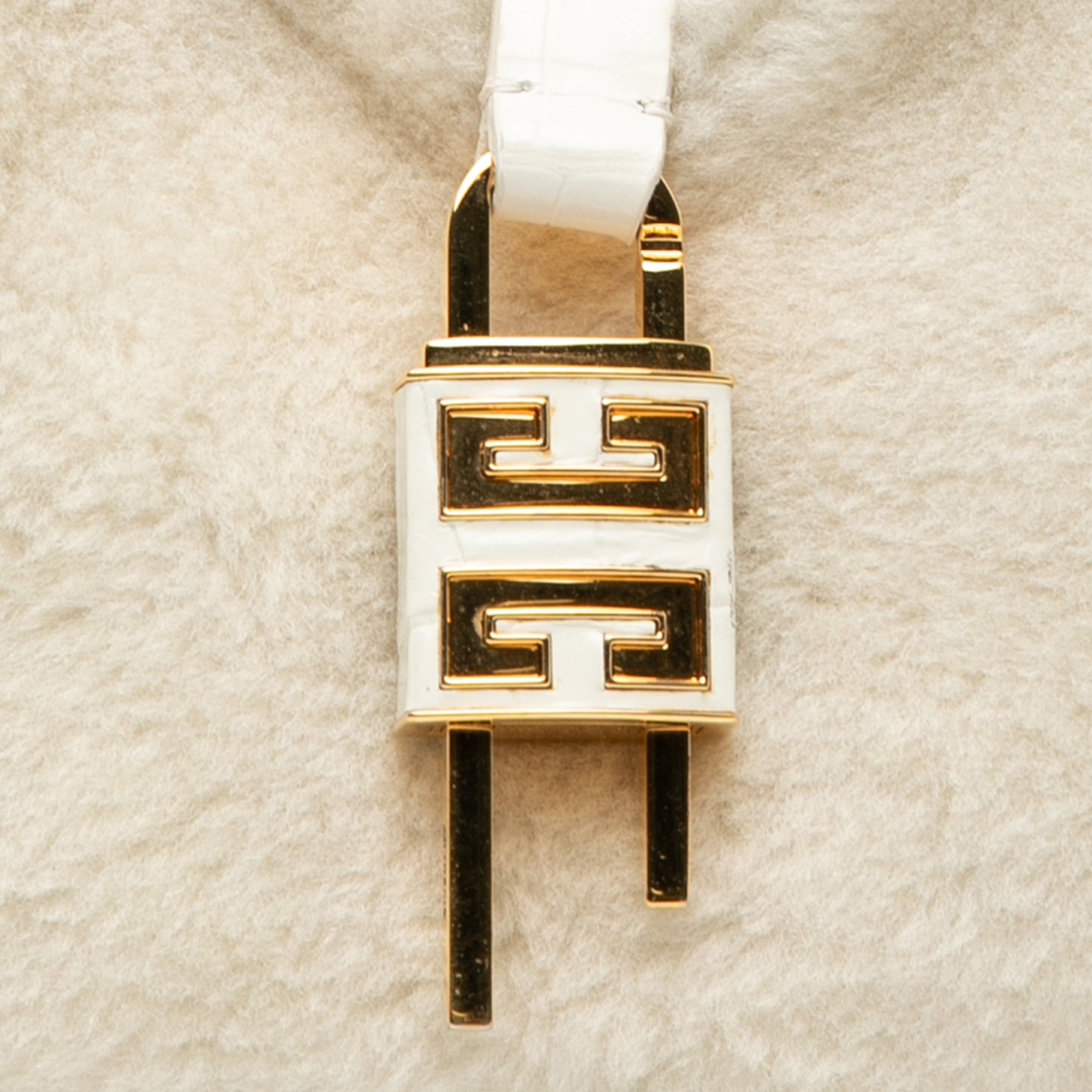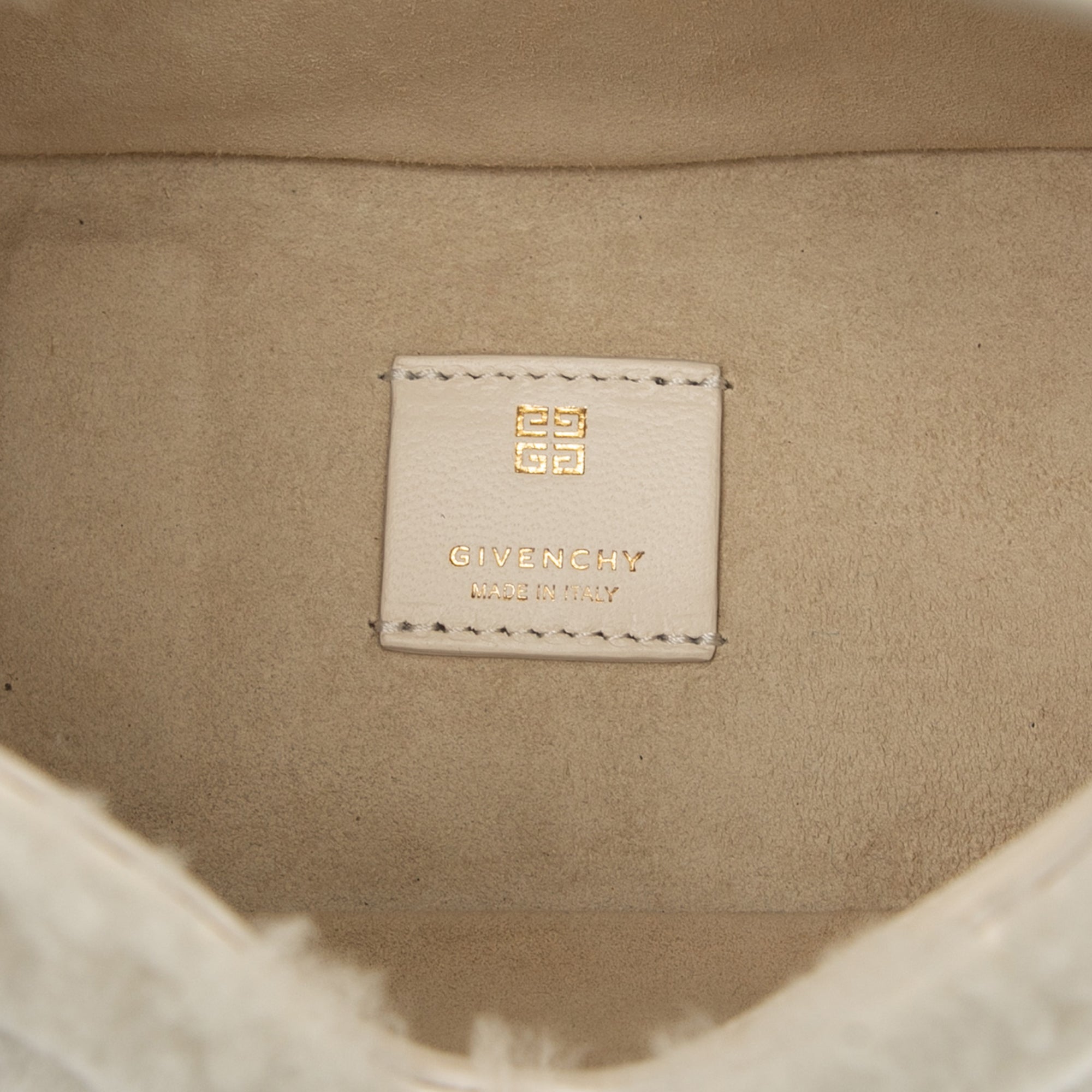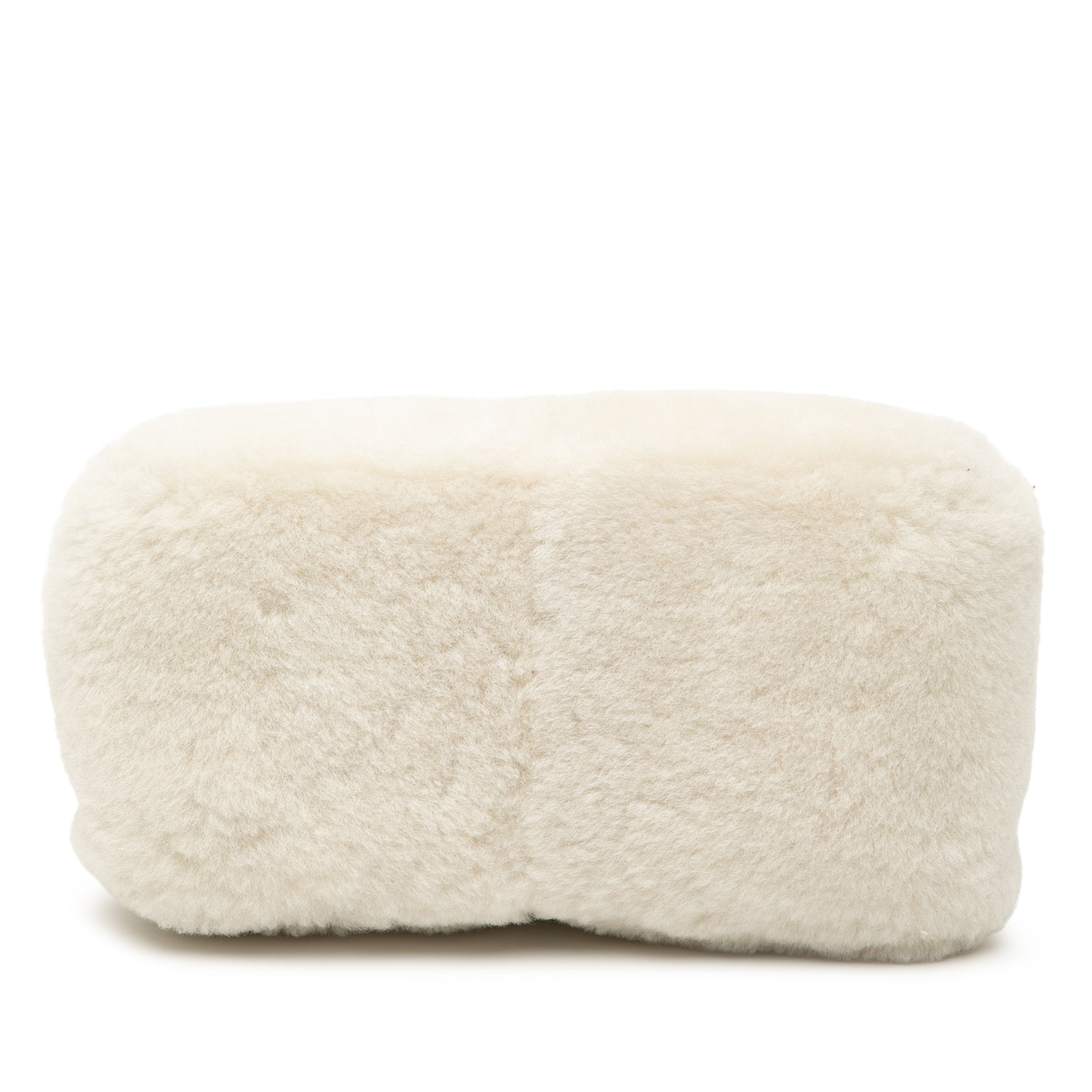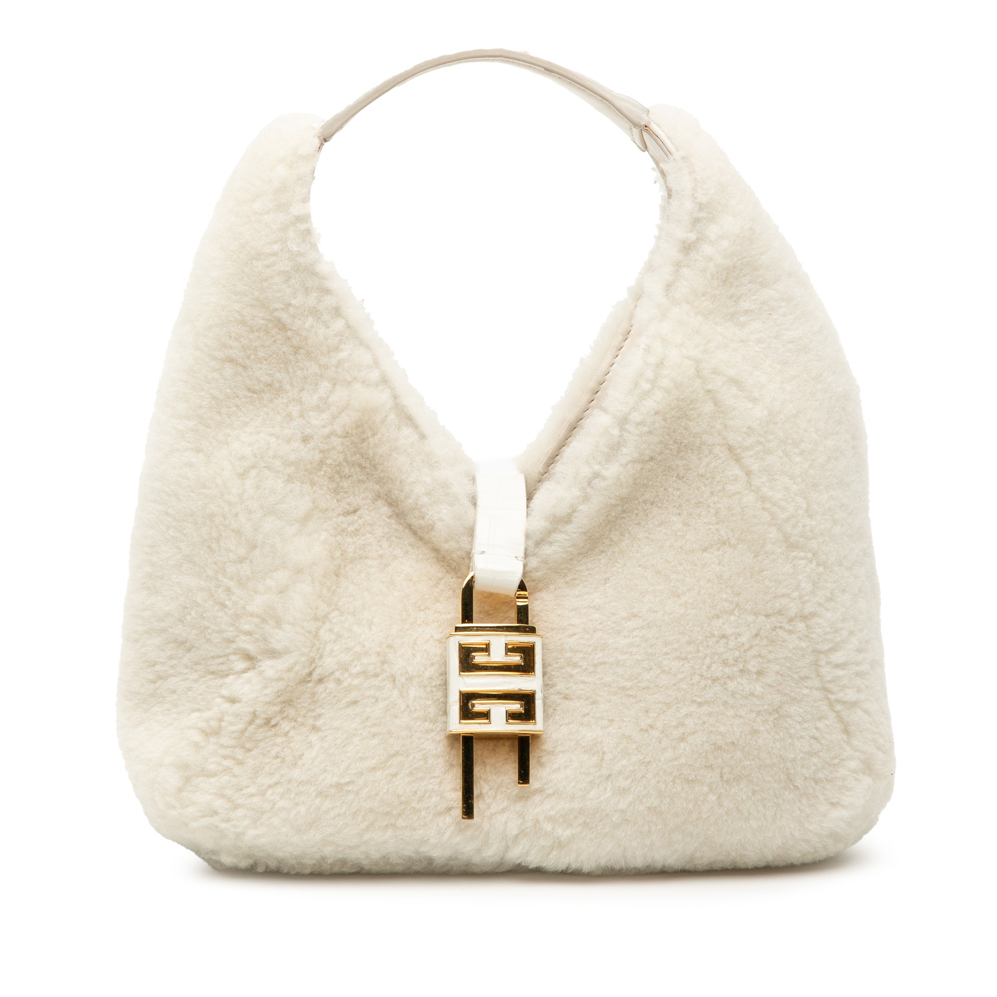 This hobo bag features a natural fur body, a flat leather strap, an open top with leather belt flap, and an interior slip pocket. Retail Price: 2300.00
