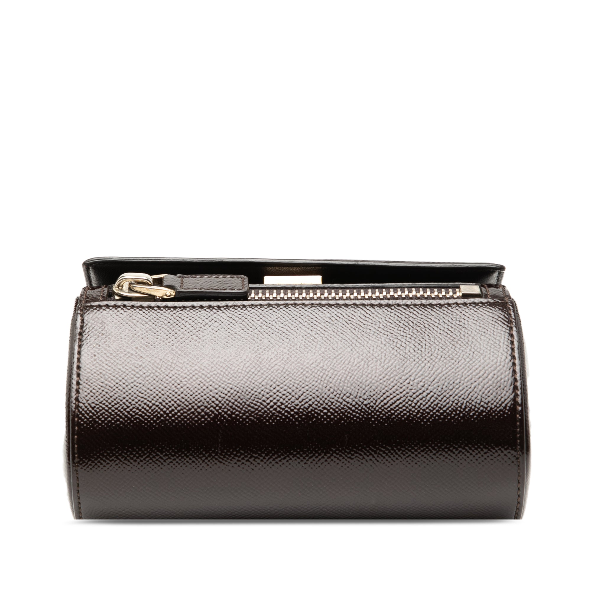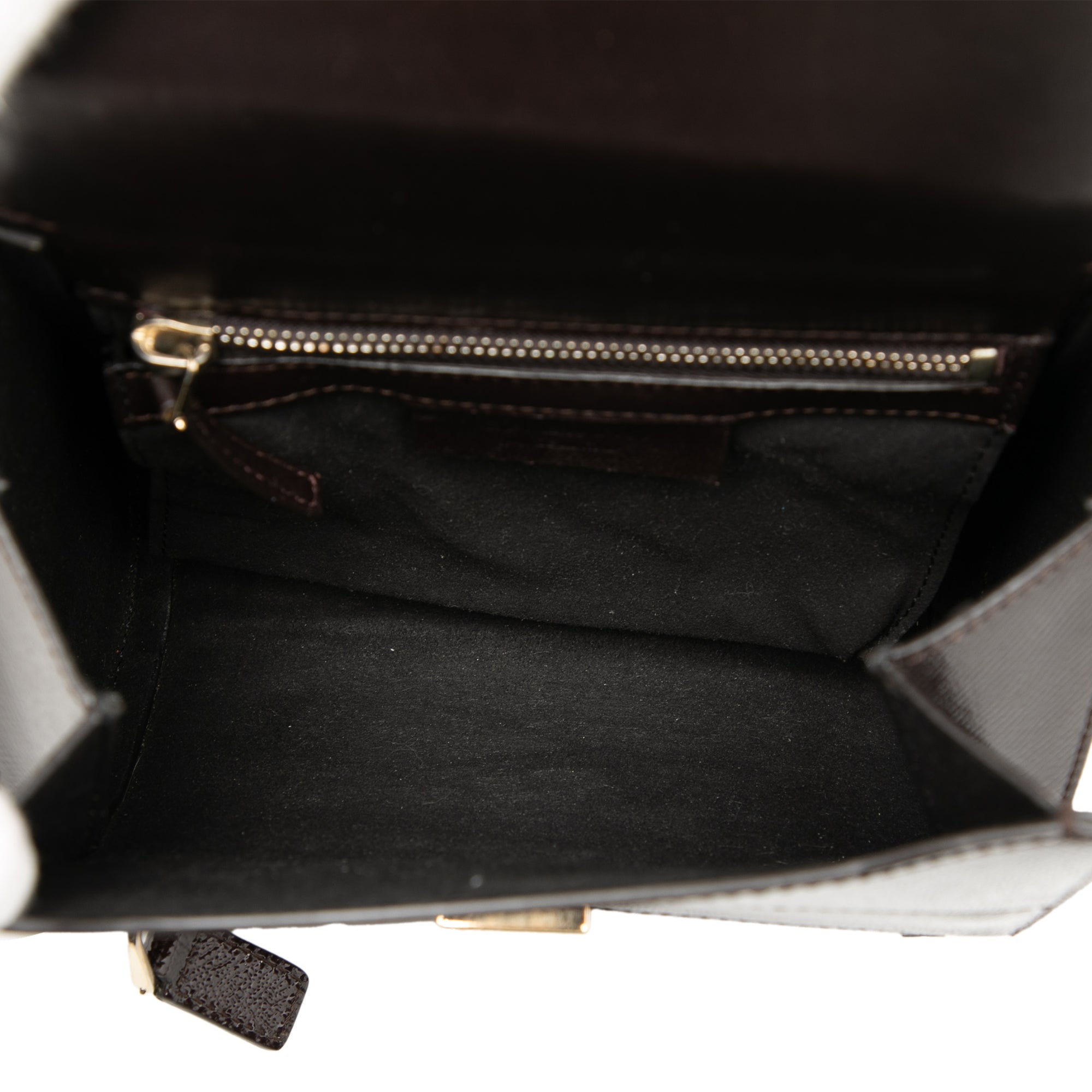 The Pandora Box features a leather body, an adjustable flat strap, a front flap with push lock closure, an exterior zip pocket, and an interior zip pocket. Retail Price: 1950.00