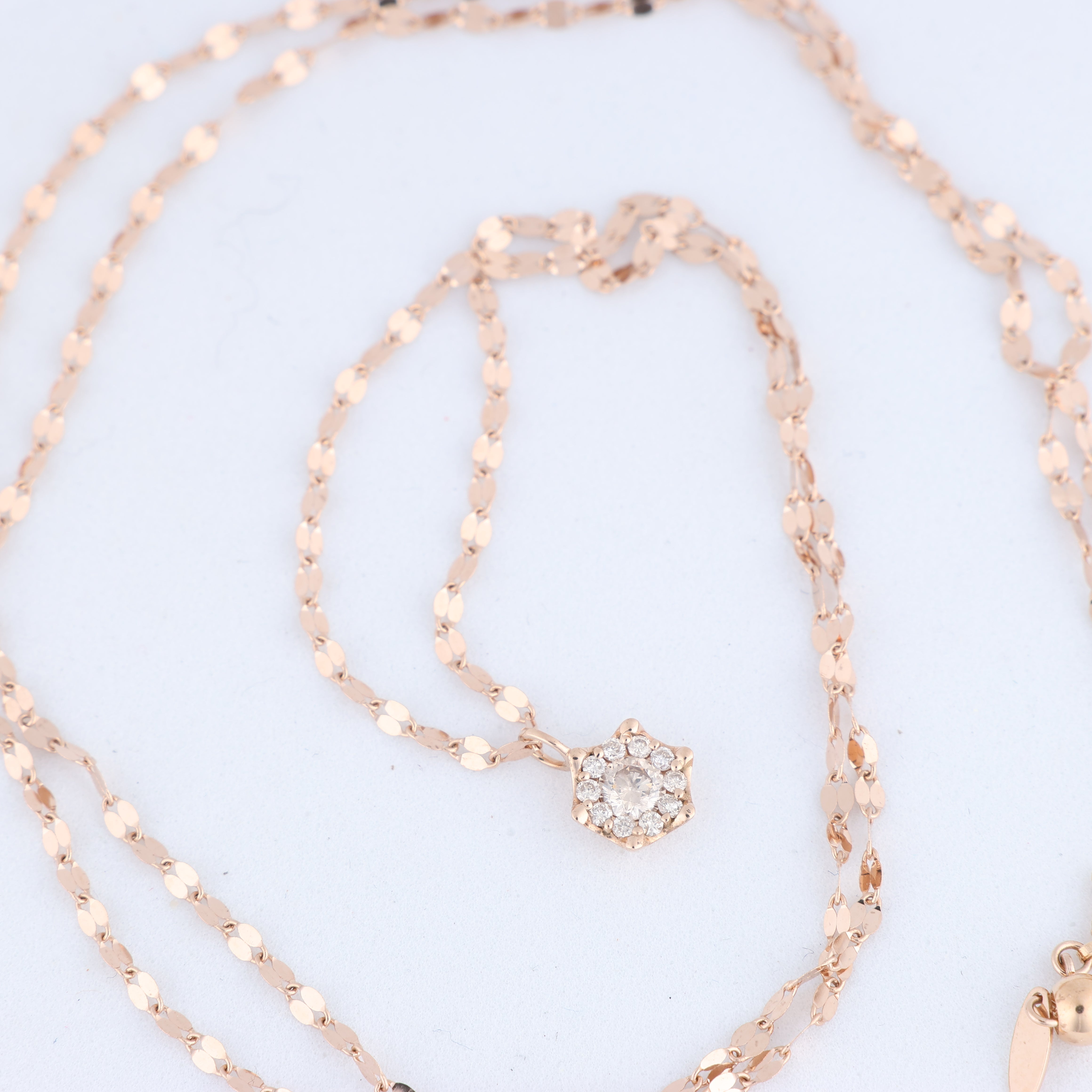 Elegant and timeless, this unsigned 18k rose gold chain features a hexagon pendant set with 11 sparkling natural diamonds. A refined jewelry piece perfect for adding sophistication to any occasion
