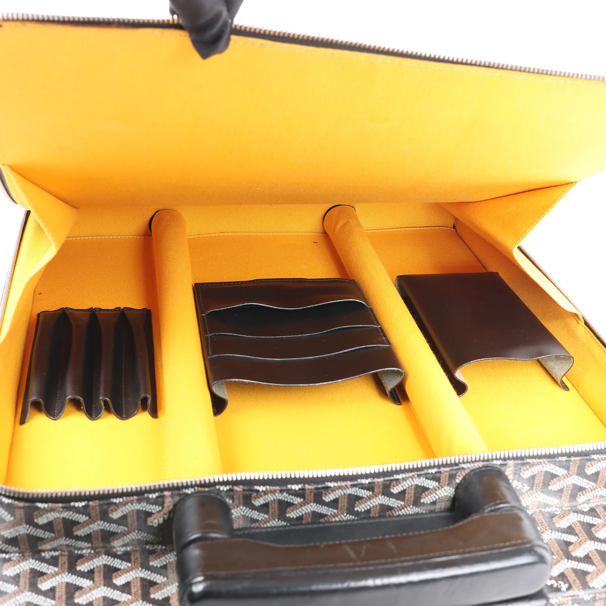 Brand: GoyardModel: TrolleSize: 50Width: 52 cmHeight: 35.5 cmExterior Condition: ExcellentInterior Condition: ExcellentCondition Details: The exterior is clean and beautiful, in excellent condition except some small scratches and rubbings at the edges. The wheels has scratches and some cracks. The hardware is bright and crisp with some hairline scratches. The interior is clean and in excellent condition, except some dust.Colour: Brown, GrayInterior Colour: YellowHardware Colour: SilverMaterial: Leather, PVCComes With: Dustbag, Entrupy authentication certificate