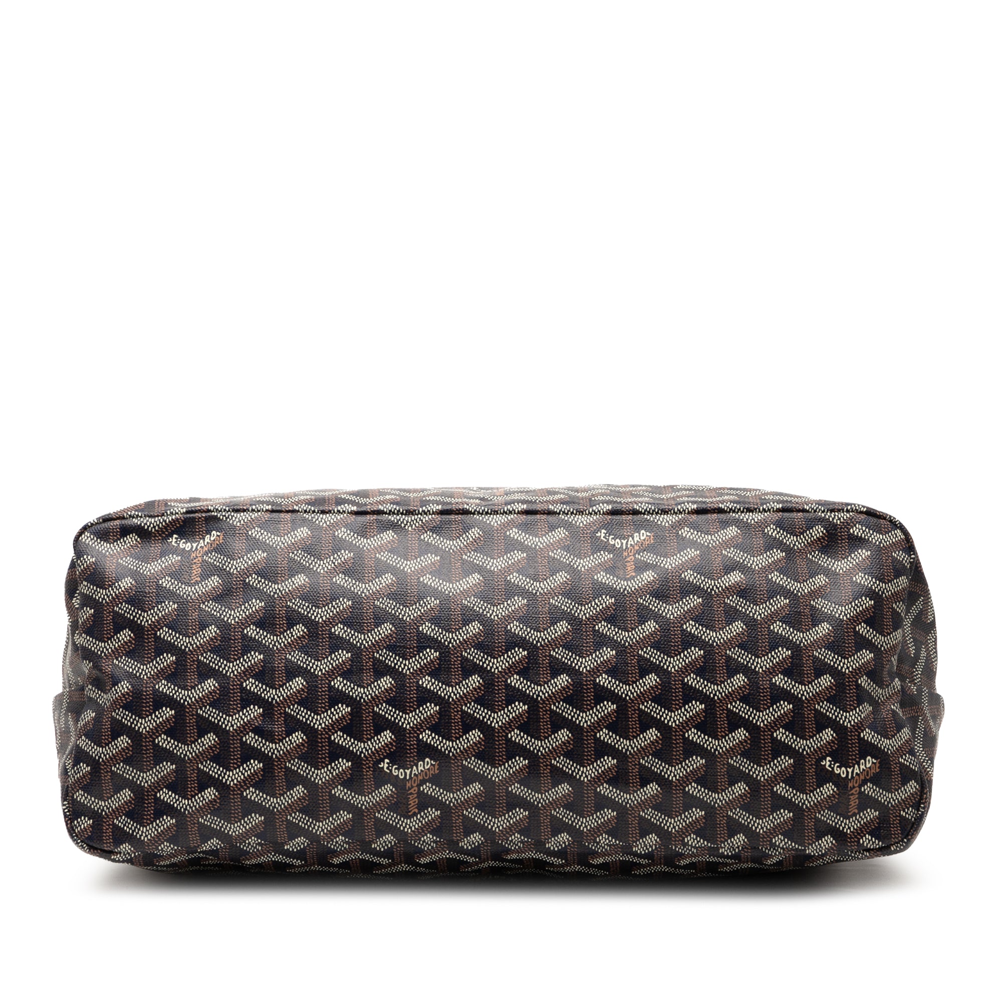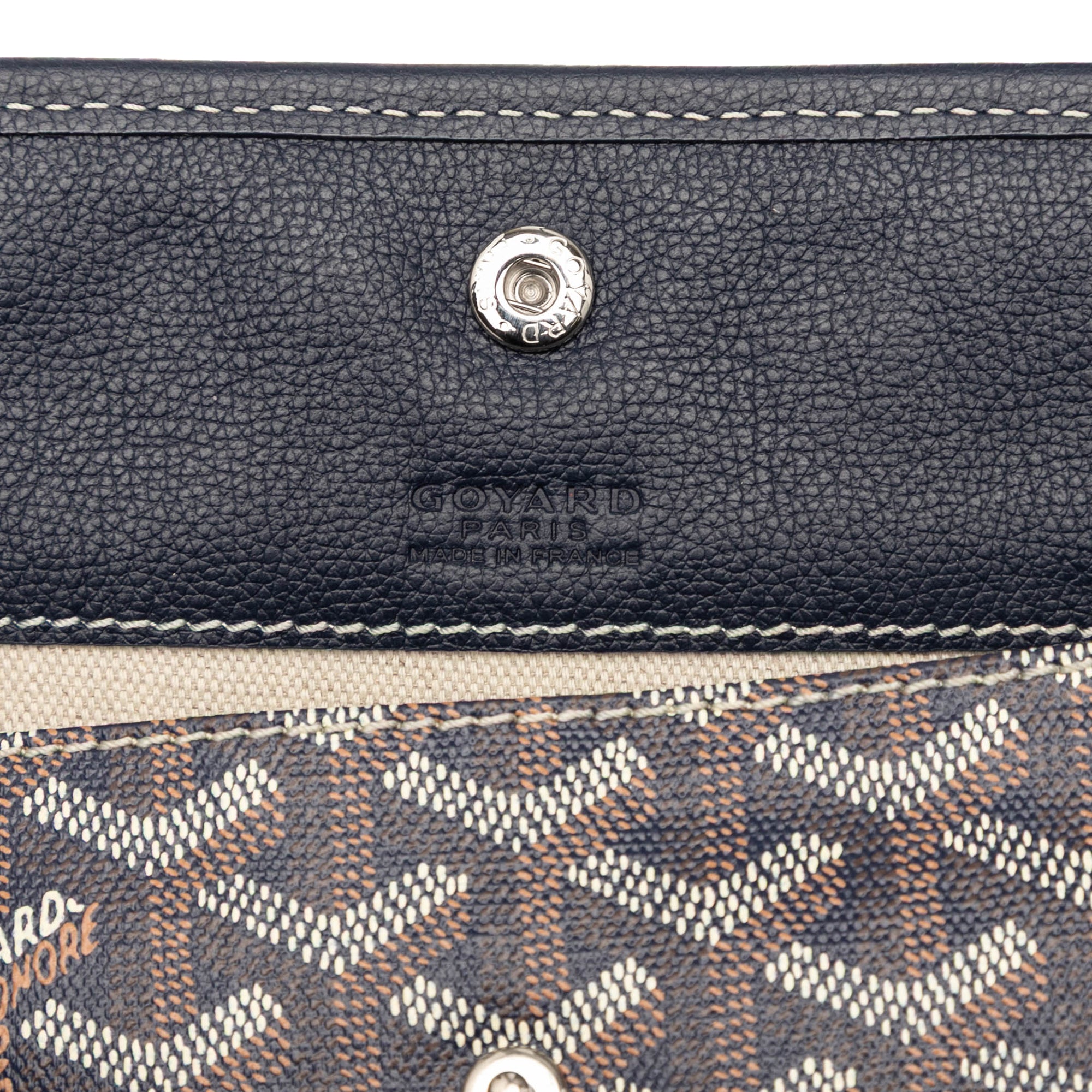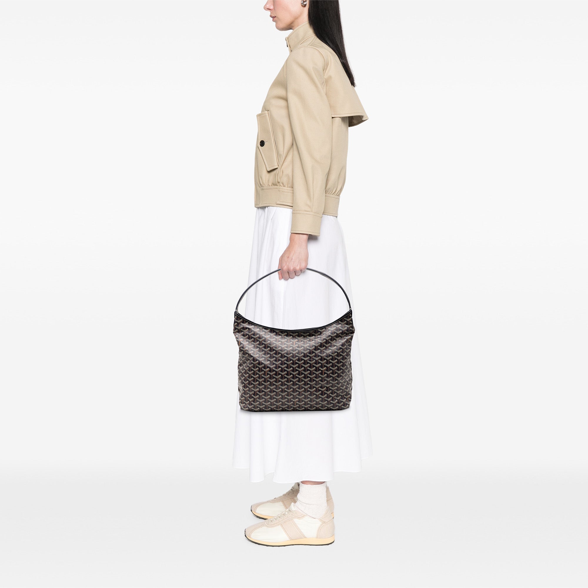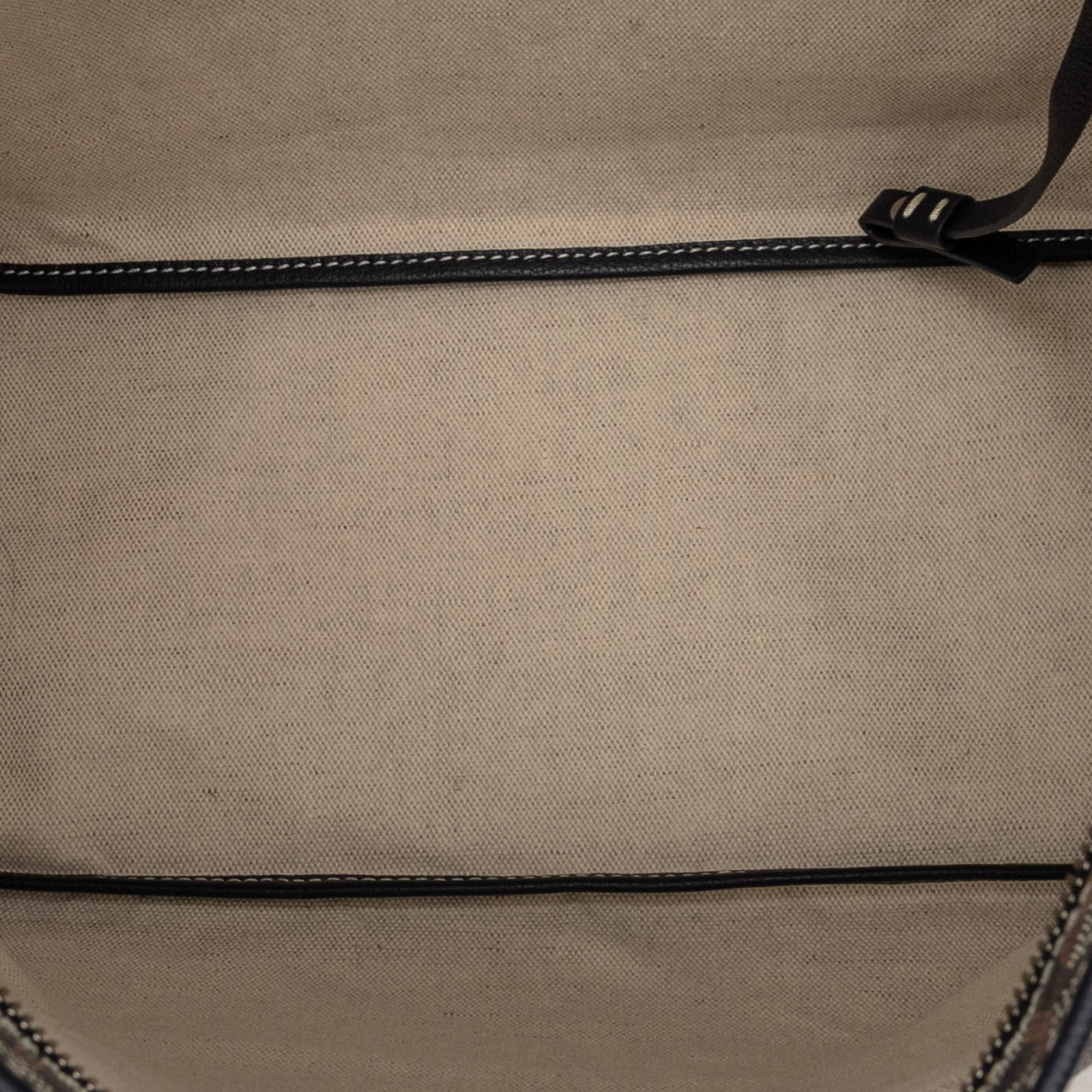 This shoulder bag features a coated canvas body with leather trim, a flat leather strap, a top zip closure, and a pouch inclusion. Retail Price: 4200.00