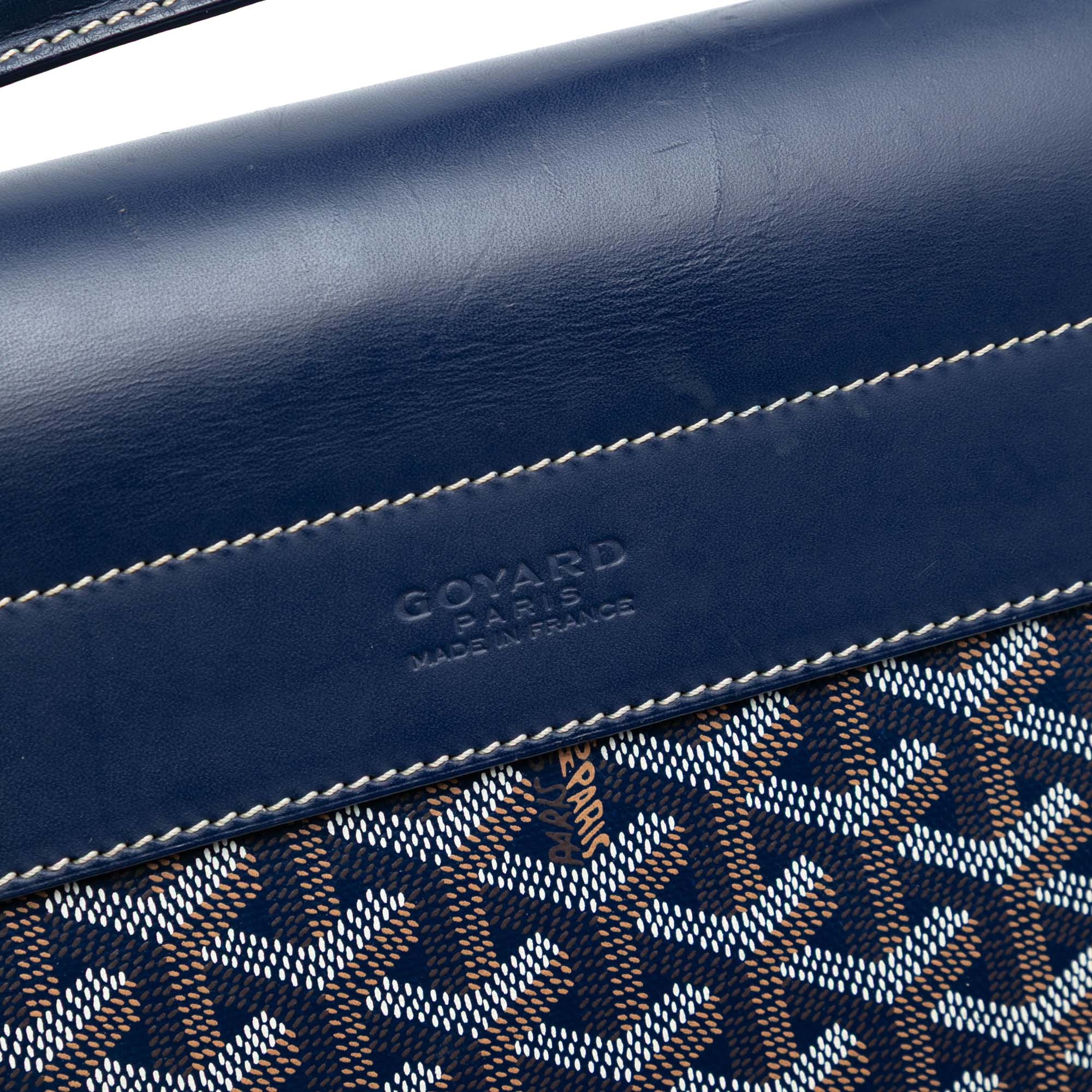 The Goyardine Citadin PM features a coated canvas body with leather trim, a flat leather top handle, a front flap with buckle closures, and interior slip pockets. Retail Price: 2800.00