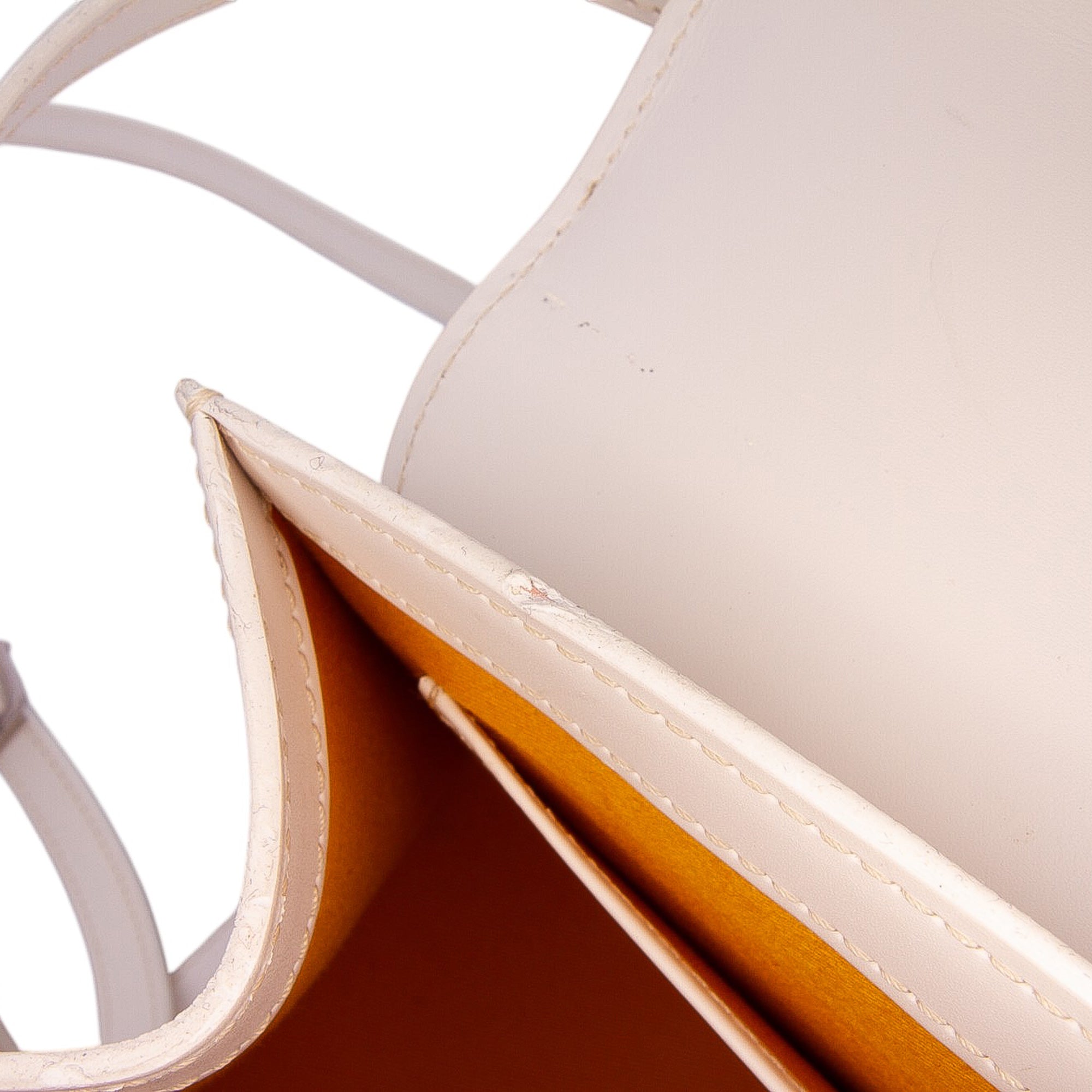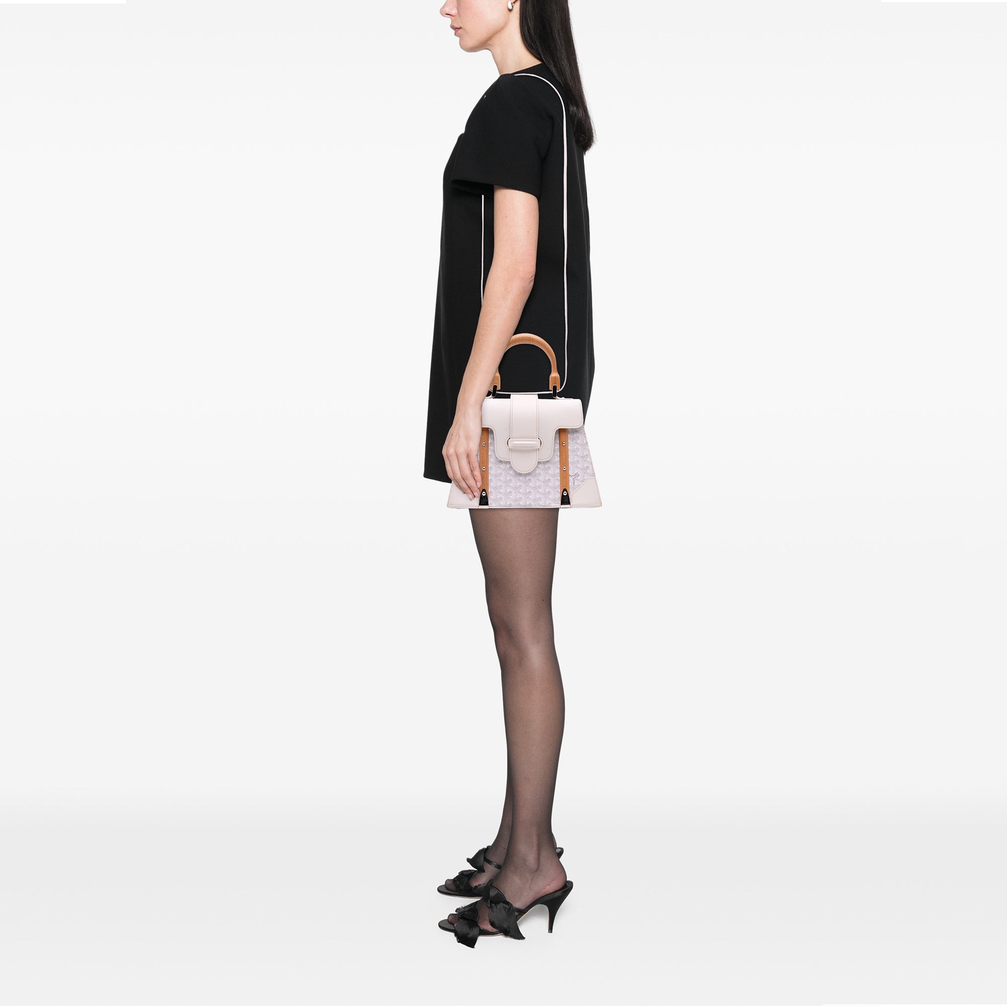 The Saigon PM features a coated canvas body with leather trim, a wooden top handle, a detachable flat leather strap, a front flap with slip-through closure, and an interior zip pocket. Retail Price: 5590.00
