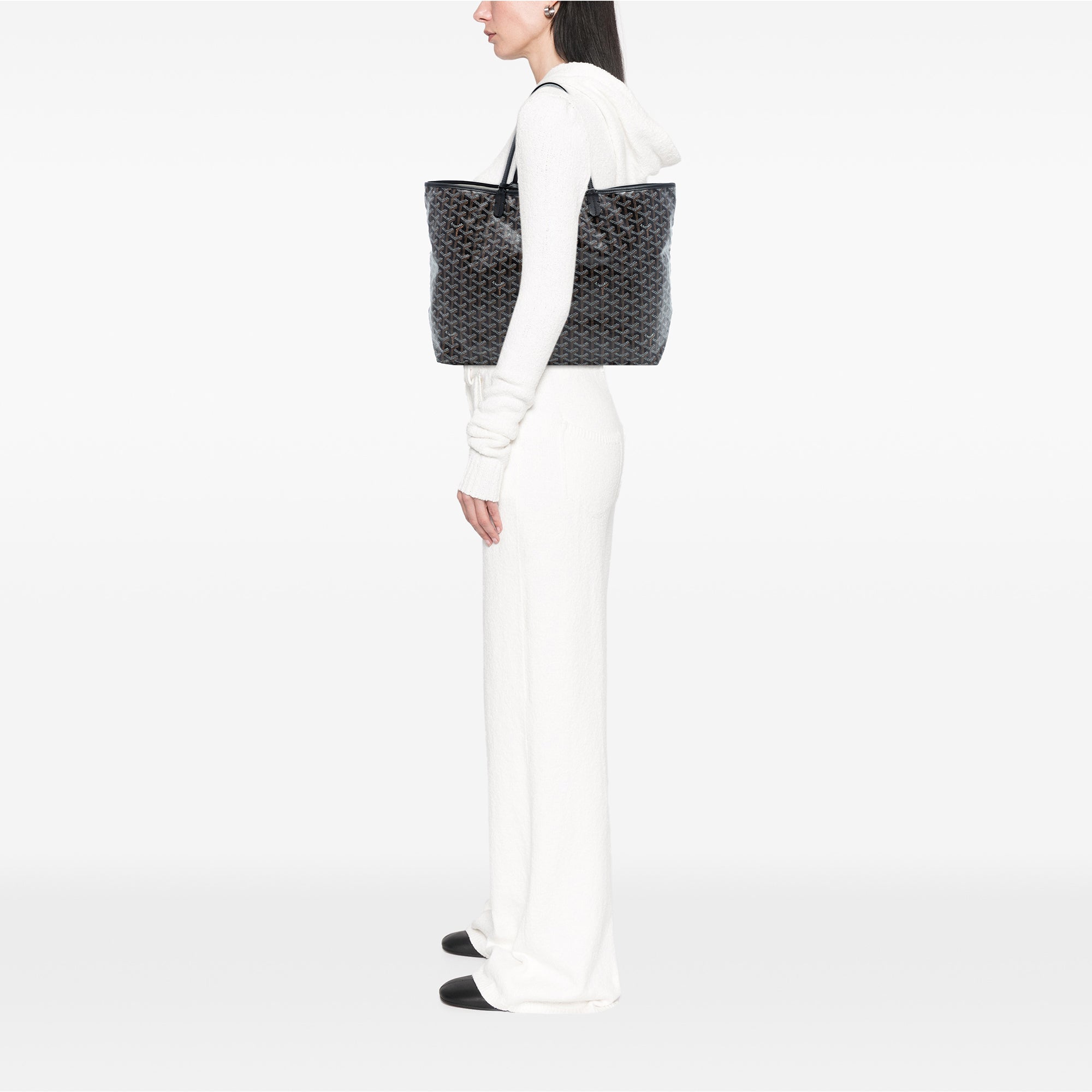 The Saint Louis GM features a coated canvas body with leather trim, flat leather handles, an open top, and a pouch inclusion. Retail Price: 3500.00