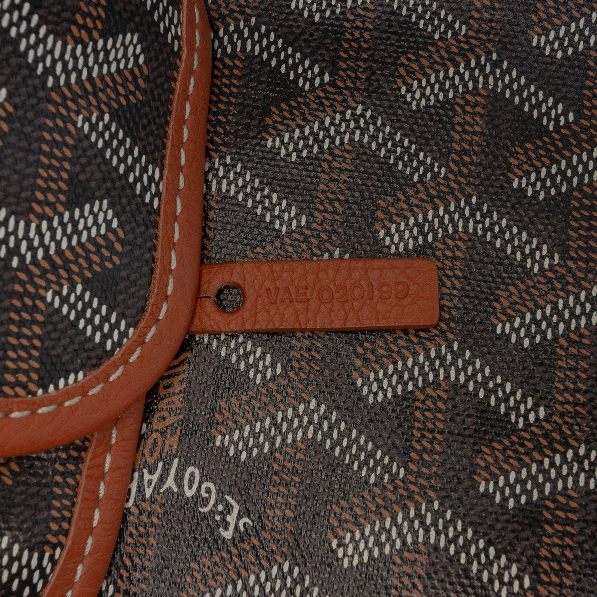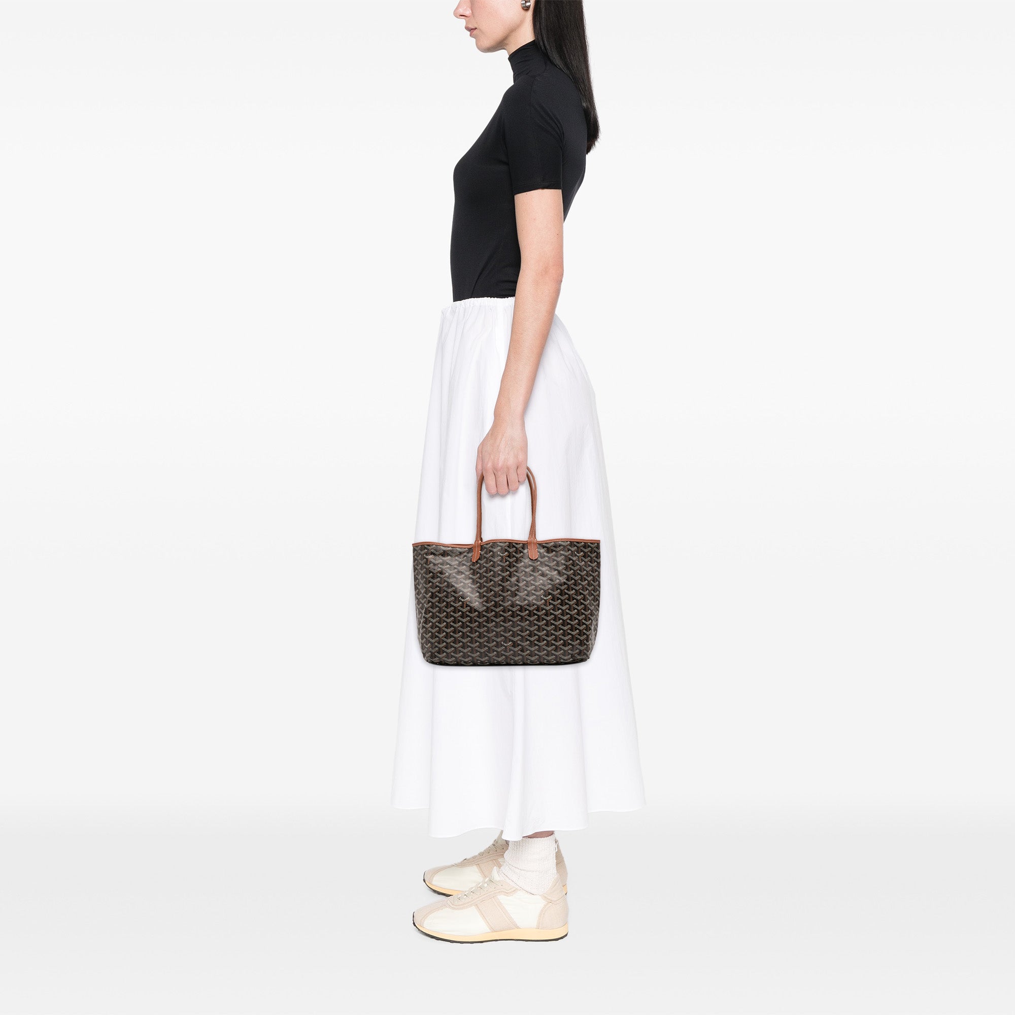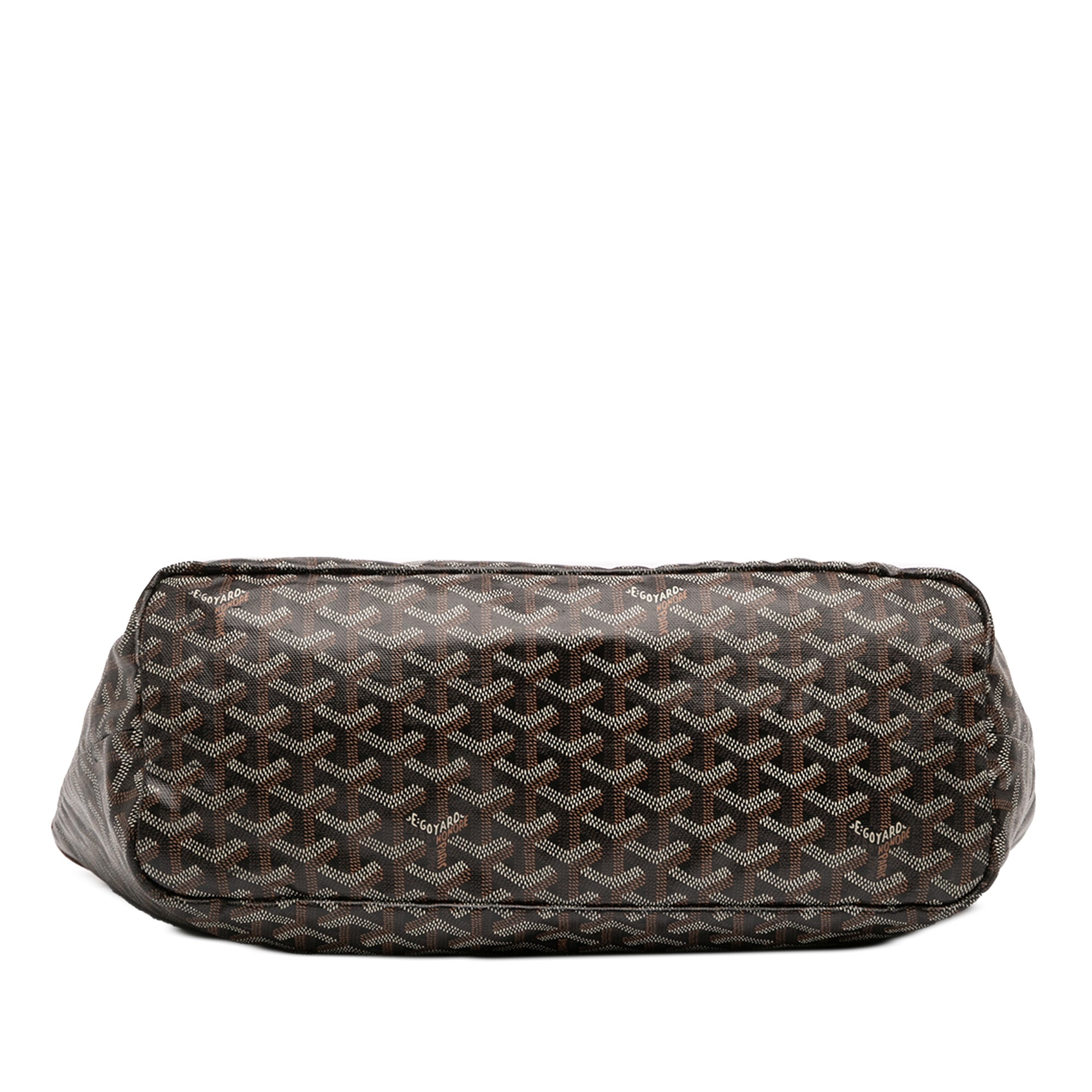 The Saint Louis PM features a coated canvas body with leather trim, flat leather shoulder straps, and an open top and a detachable pouch inclusion. Retail Price: 3355.00