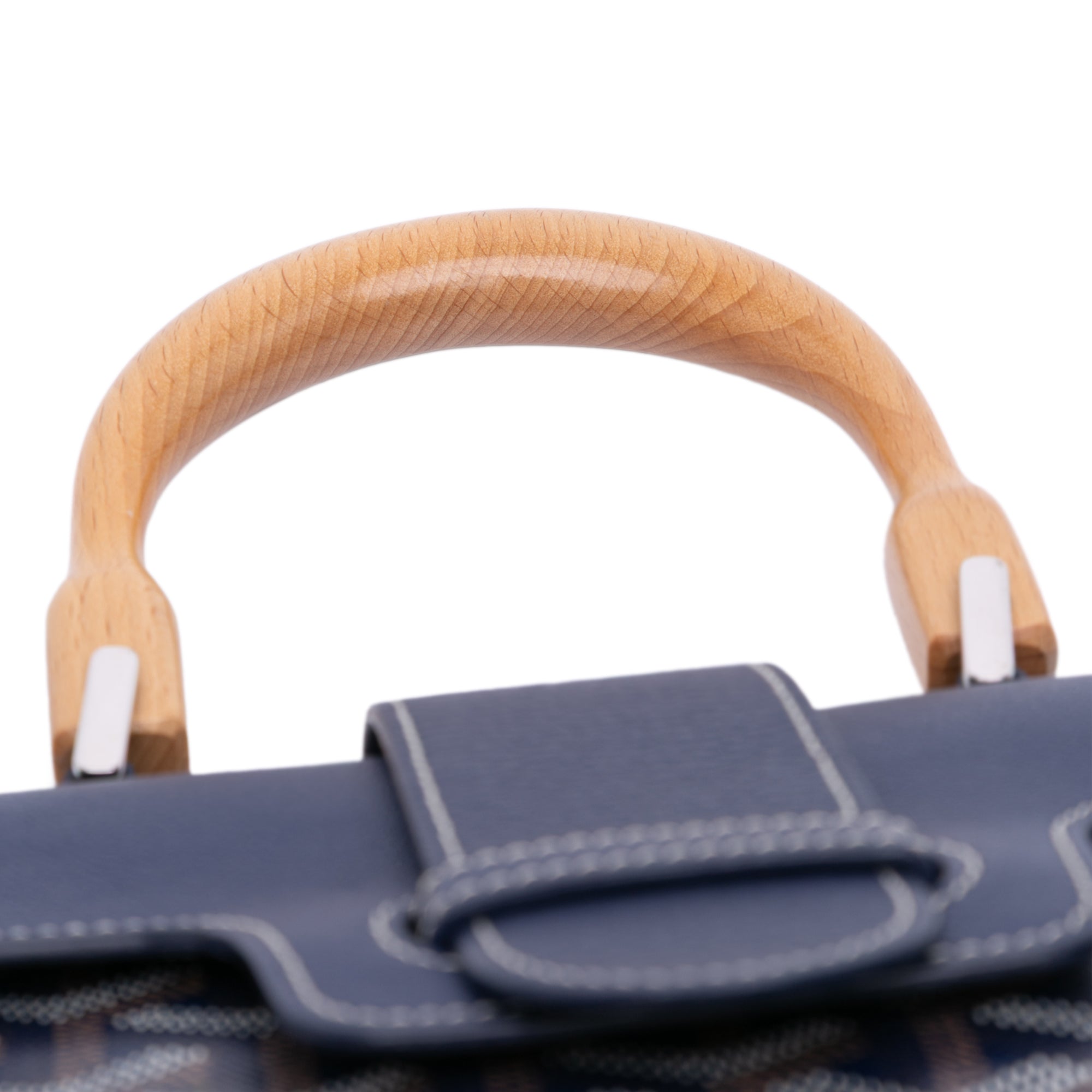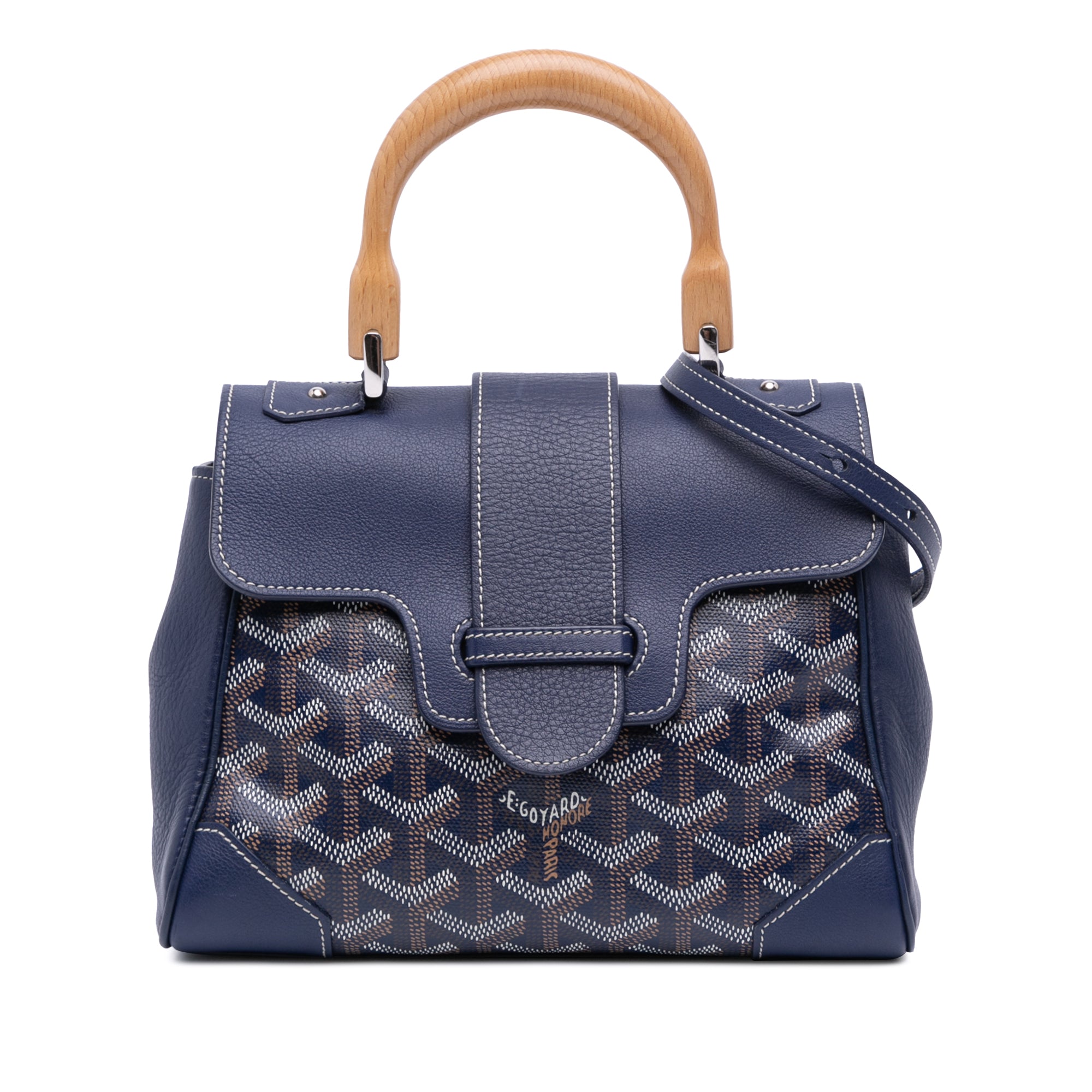 The Mini Saigon features a coated canvas body with leather trim, a wooden top handle, a removable flat leather strap, a front flap with slip-through closure, and an interior slip pocket. Retail Price: 3670.00