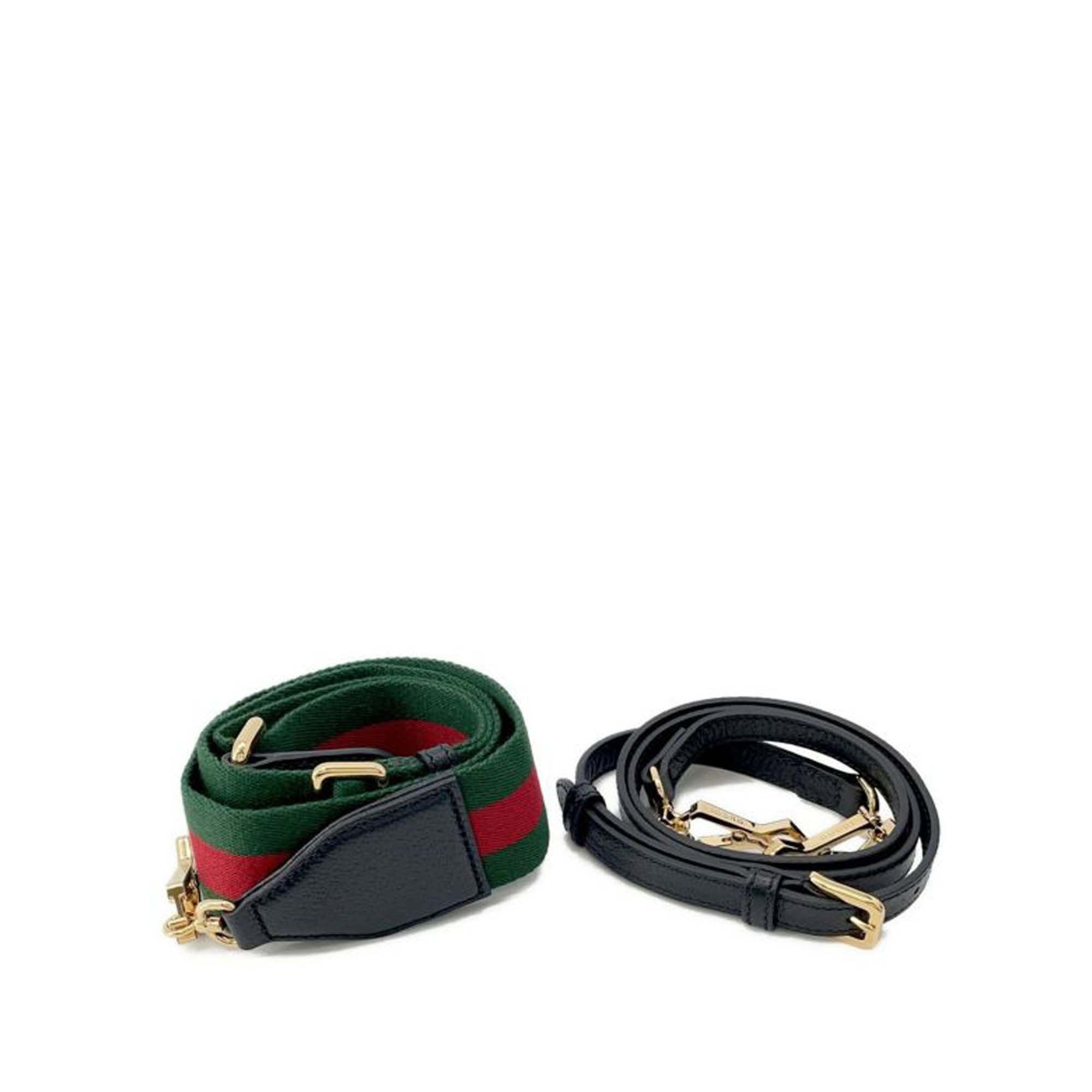 The Horsebit 1955 satchel features a printed leather body, rolled leather handles, detachable leather and canvas web straps, a zip-around closure, and an interior slip pocket. Retail Price: 3000.00