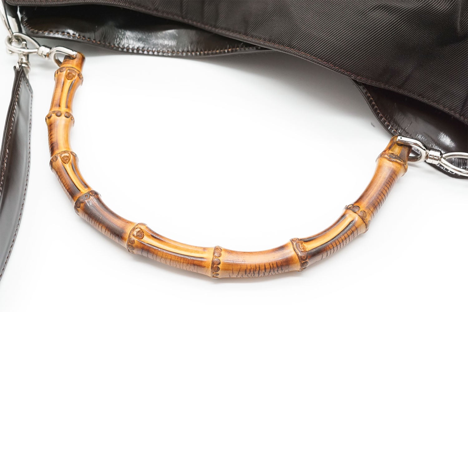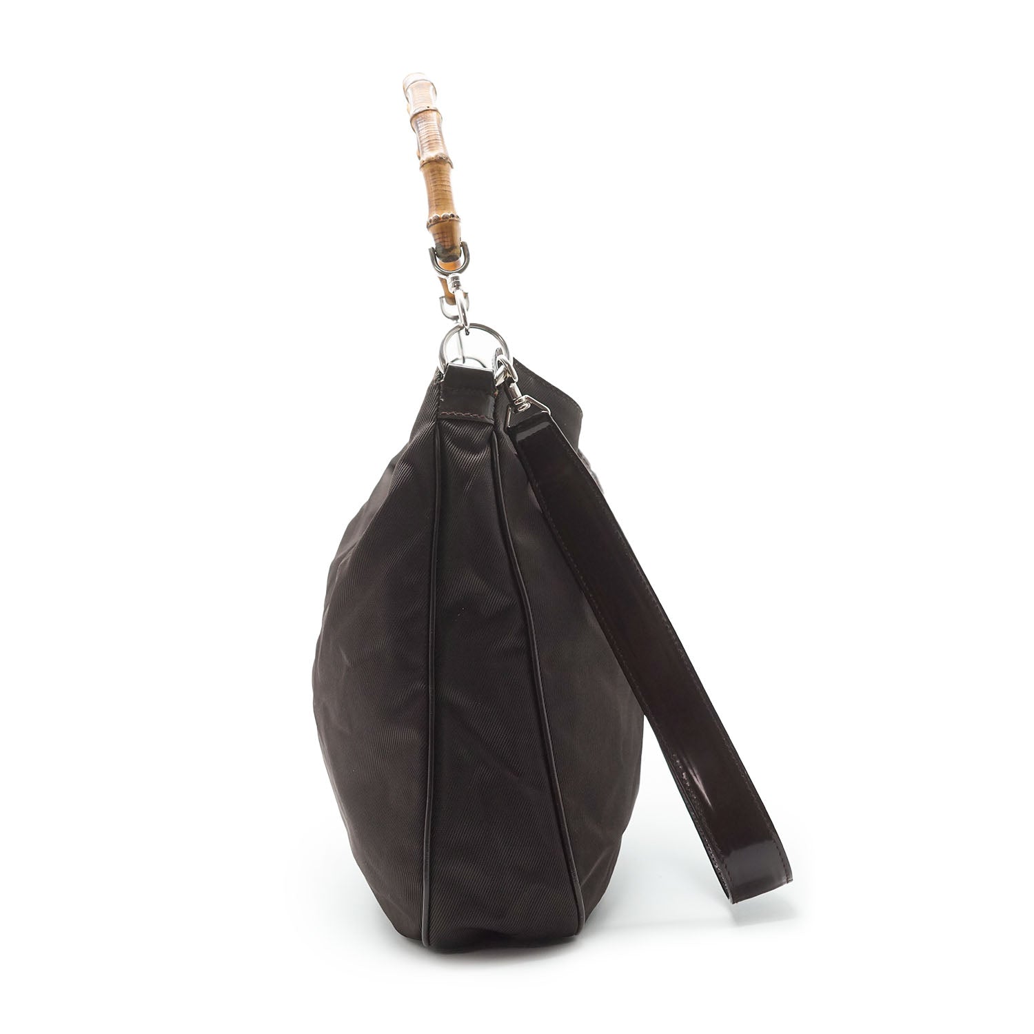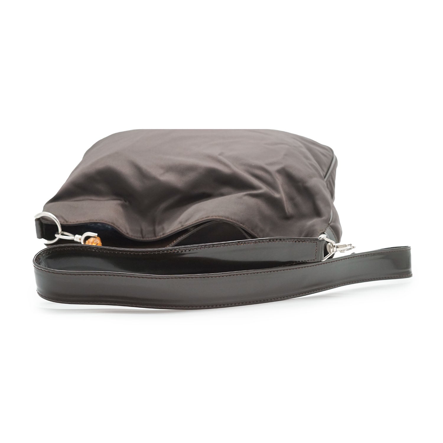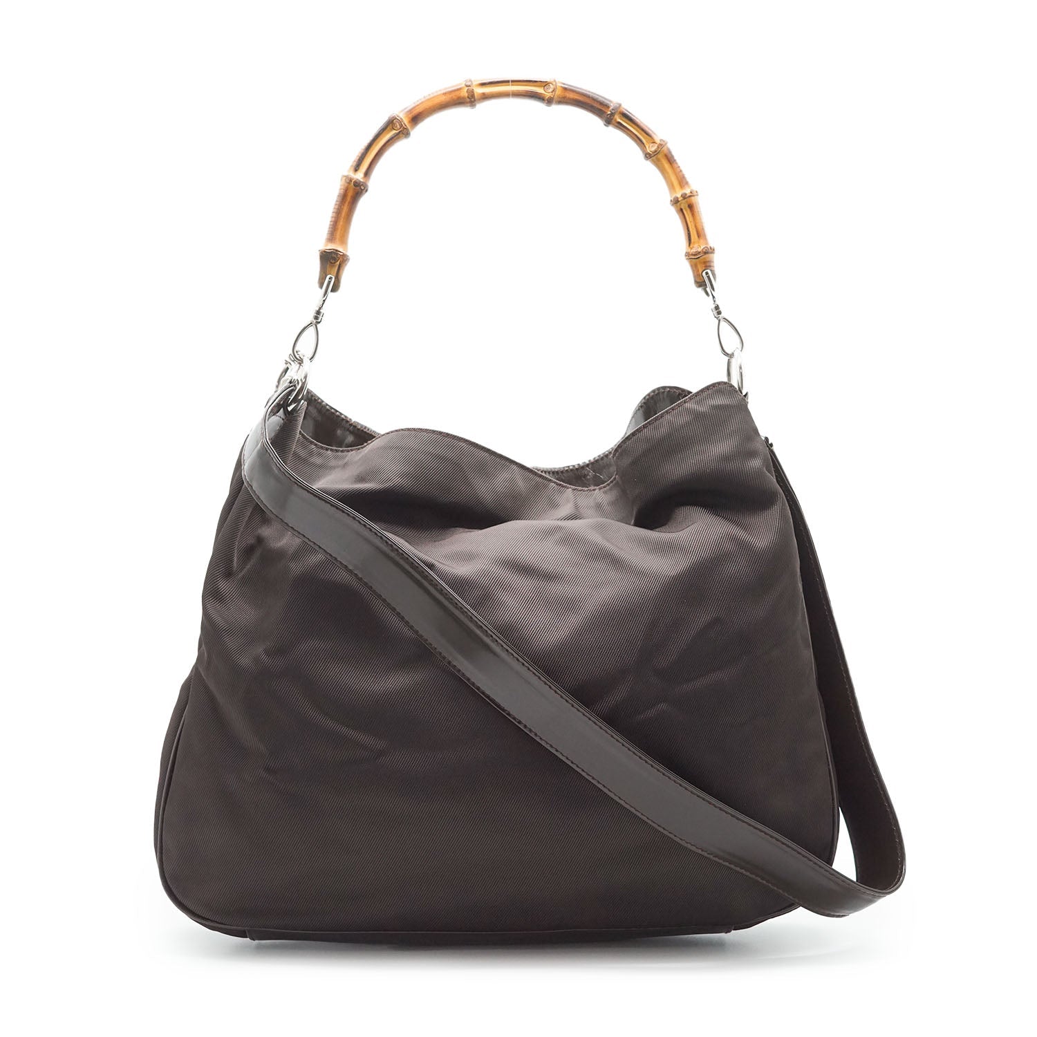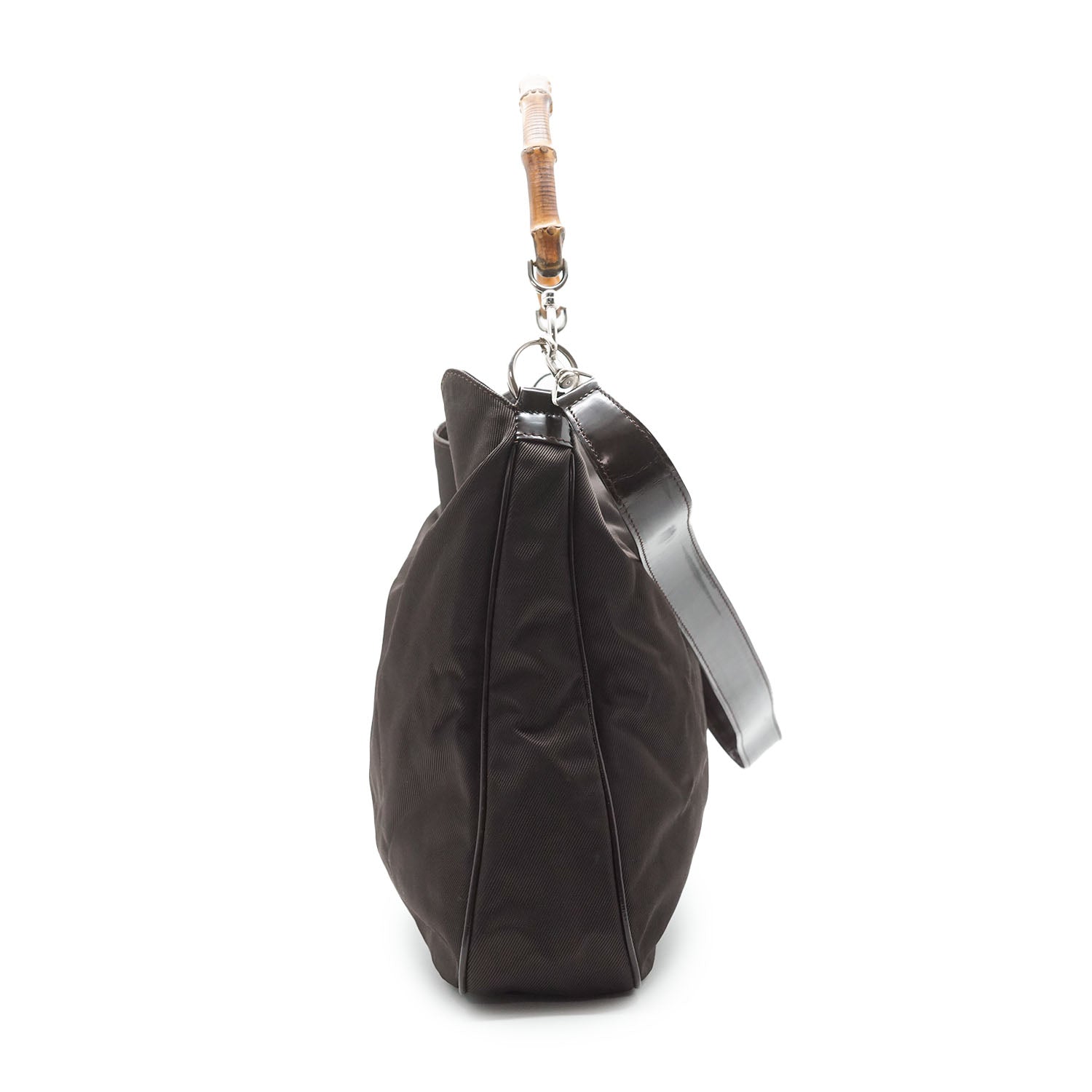 Bamboo Nylon 2way Shoulder Bag Brown Nylon, Patent leatherDepth: 10.5cmHeight: 32cmWidth: 38cmShoulder Drop: 40cmHand Drop: 14.5cmOutside Rank: BInside Rank: BStain: Faint white spots on the outer nylonScratch: Minor scratches/indentation marks at the bottom (patent leather part)Peeling: Some leather cracking on the shoulder strap, some creasing throughout the inside fabric, small leather crack on one sideInclude: Leather shoulder strapSerial code: 001.2123.1577