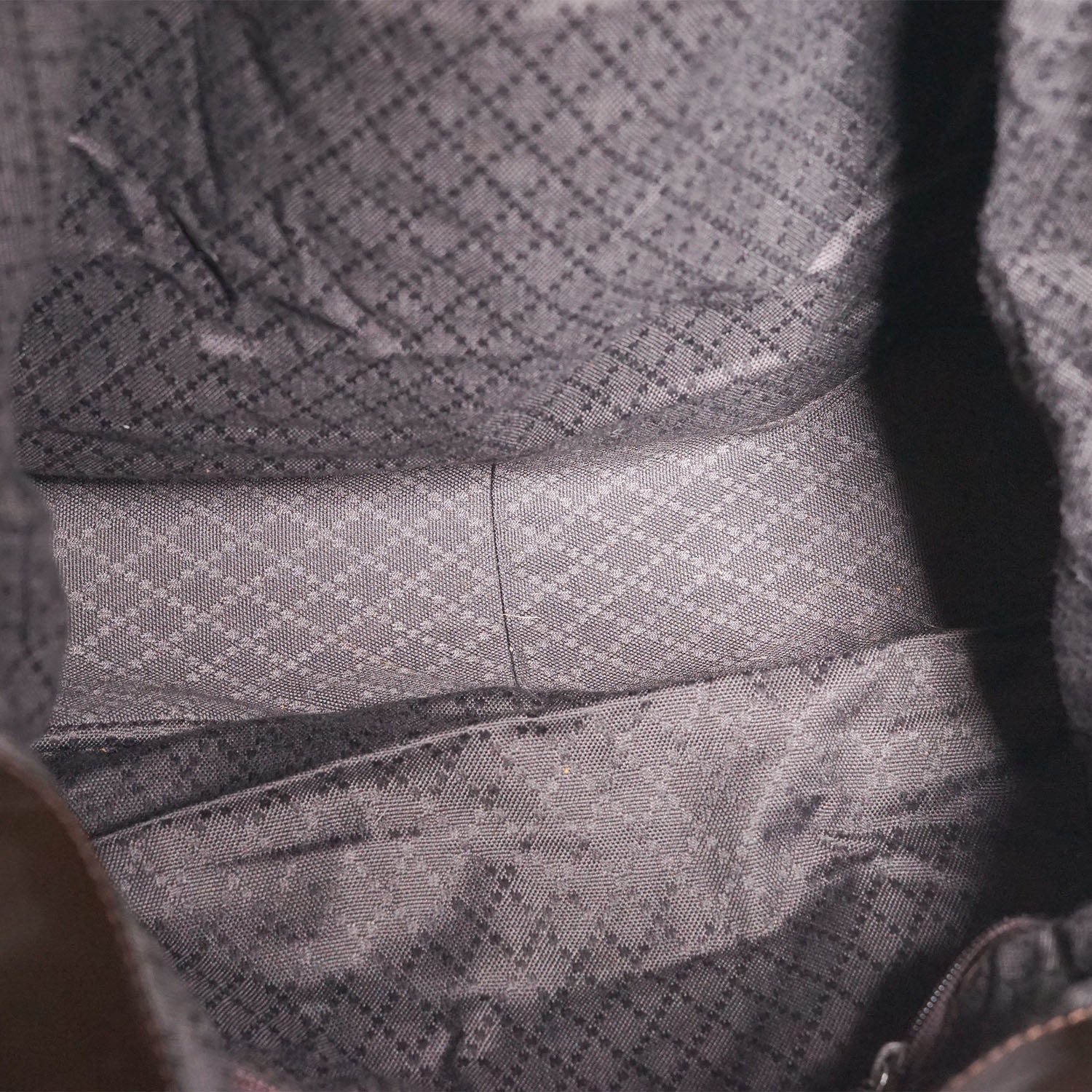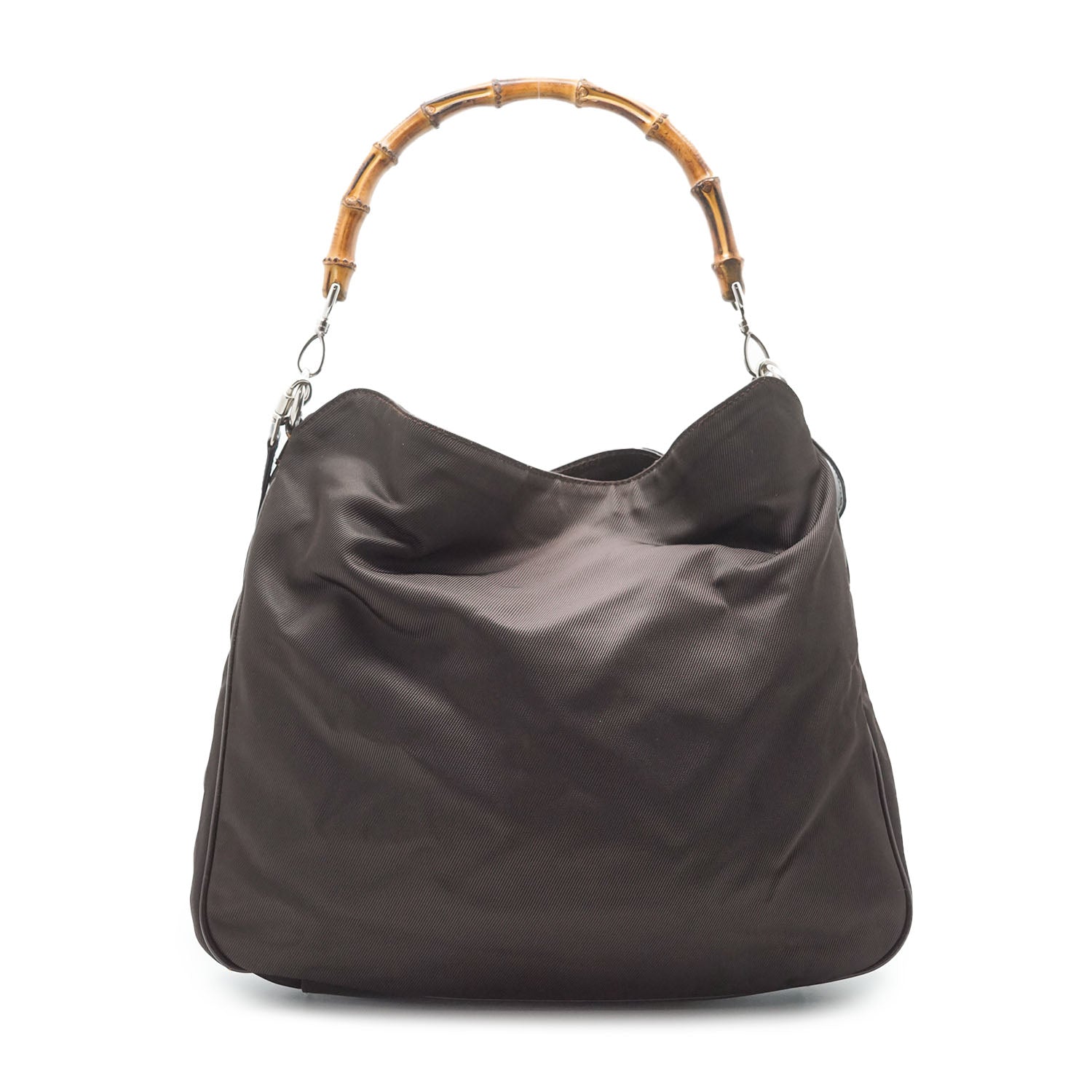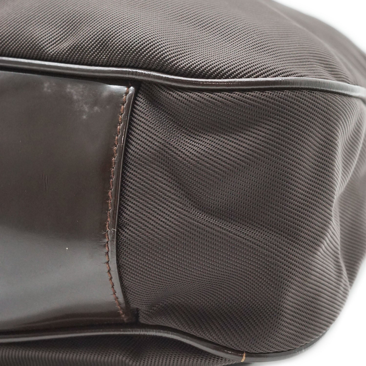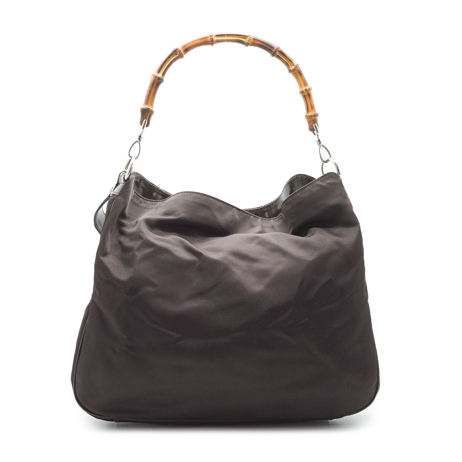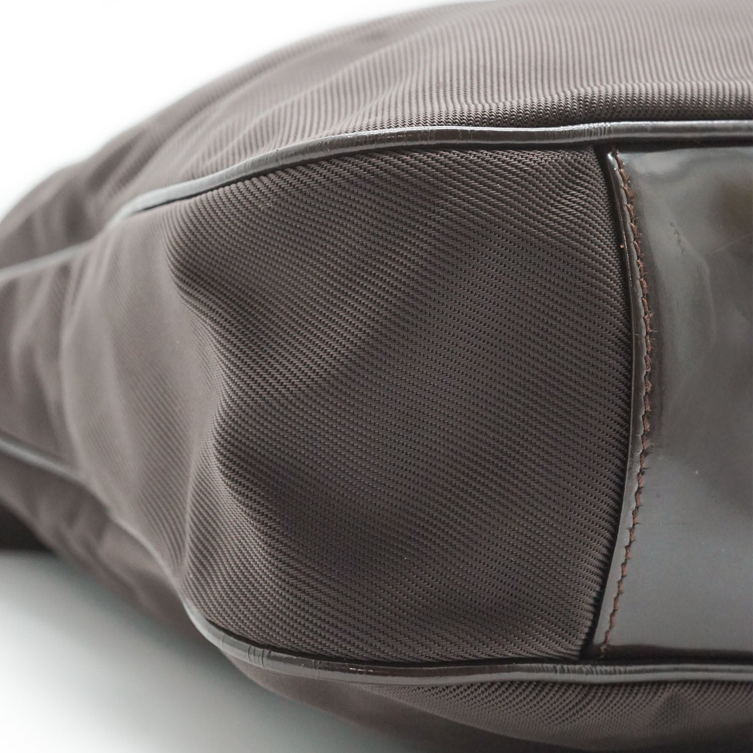 Bamboo Nylon 2way Shoulder Bag Brown Nylon, Patent leatherDepth: 10.5cmHeight: 32cmWidth: 38cmShoulder Drop: 40cmHand Drop: 14.5cmOutside Rank: BInside Rank: BStain: Faint white spots on the outer nylonScratch: Minor scratches/indentation marks at the bottom (patent leather part)Peeling: Some leather cracking on the shoulder strap, some creasing throughout the inside fabric, small leather crack on one sideInclude: Leather shoulder strapSerial code: 001.2123.1577