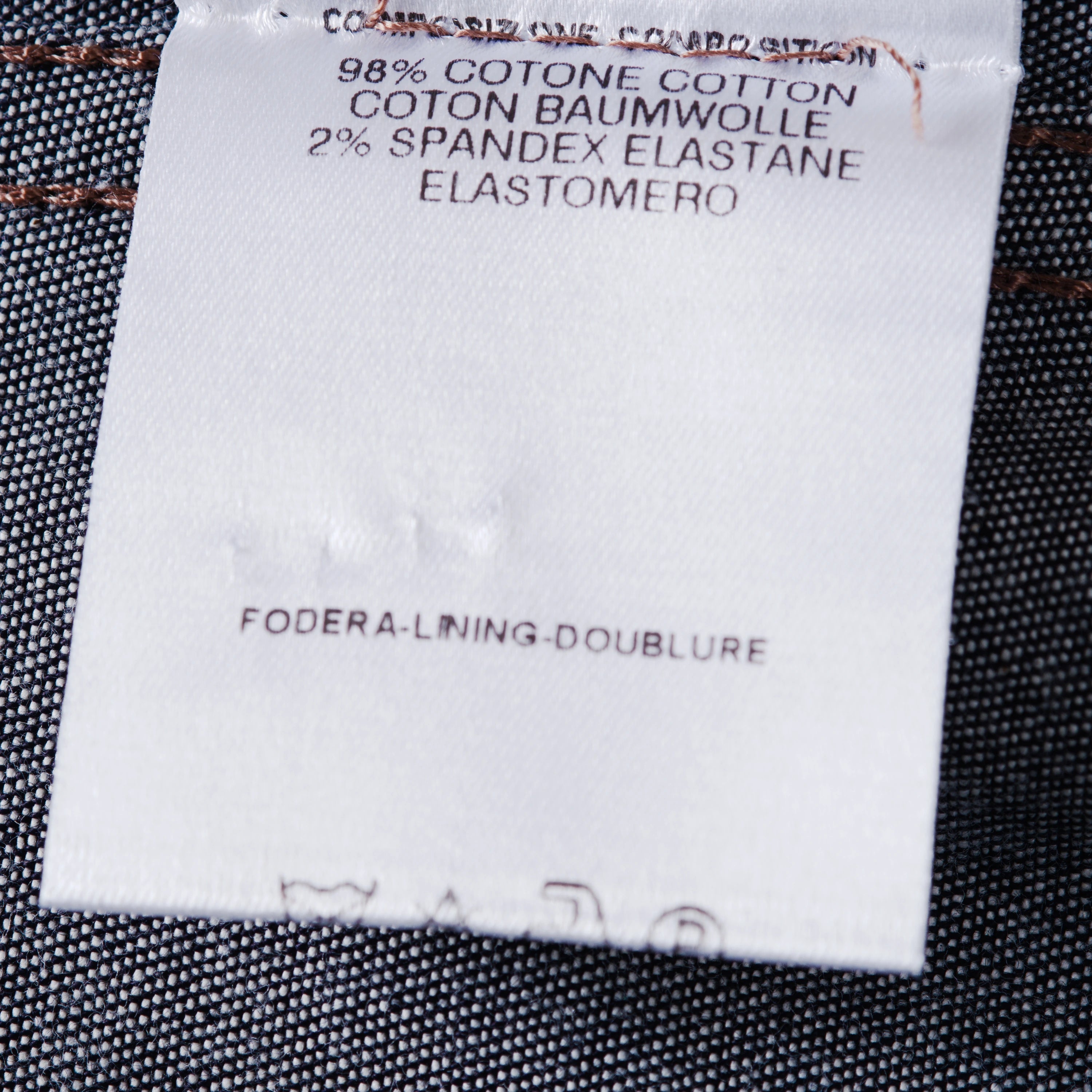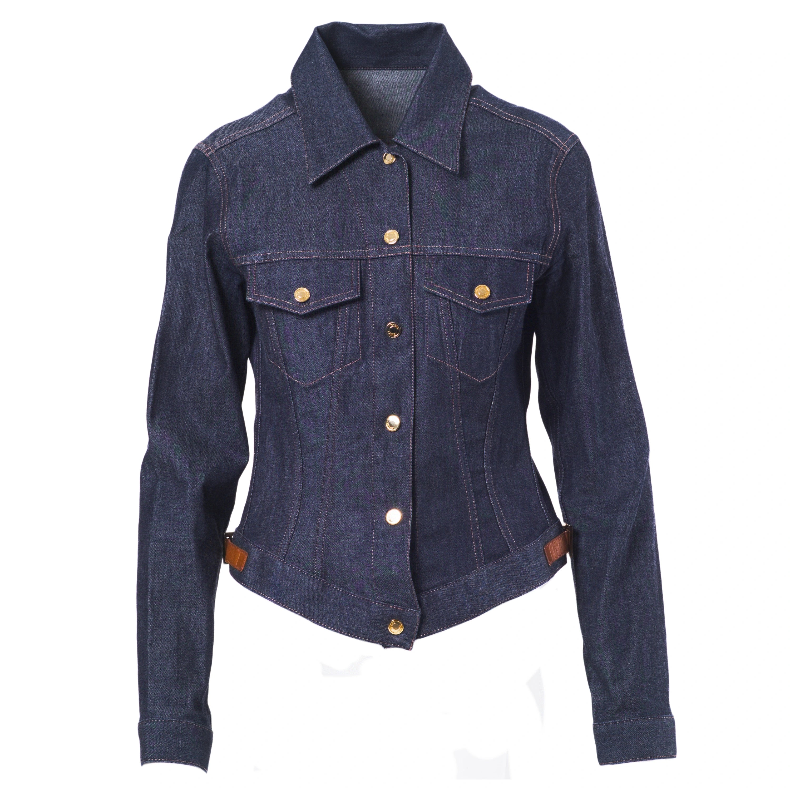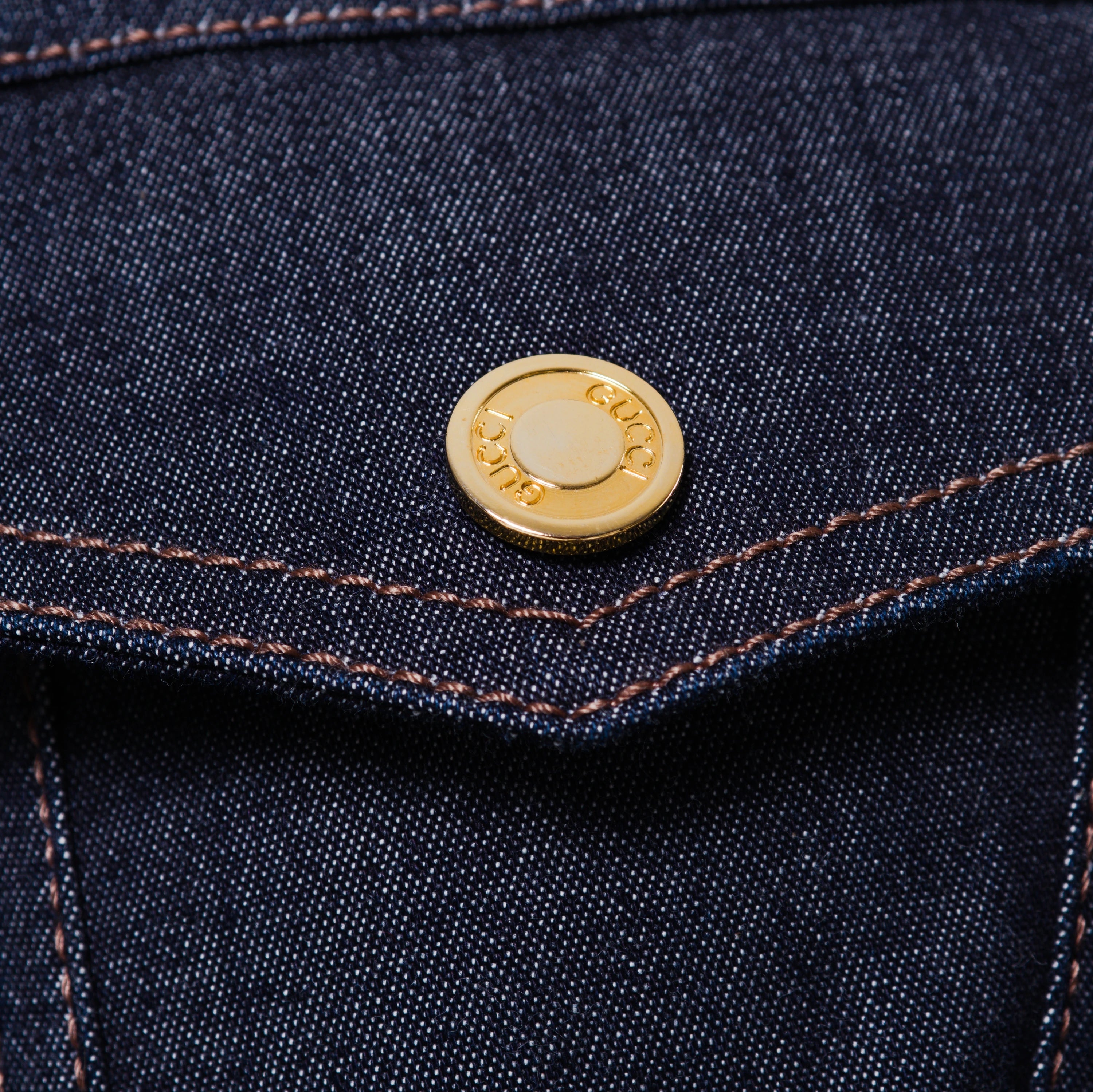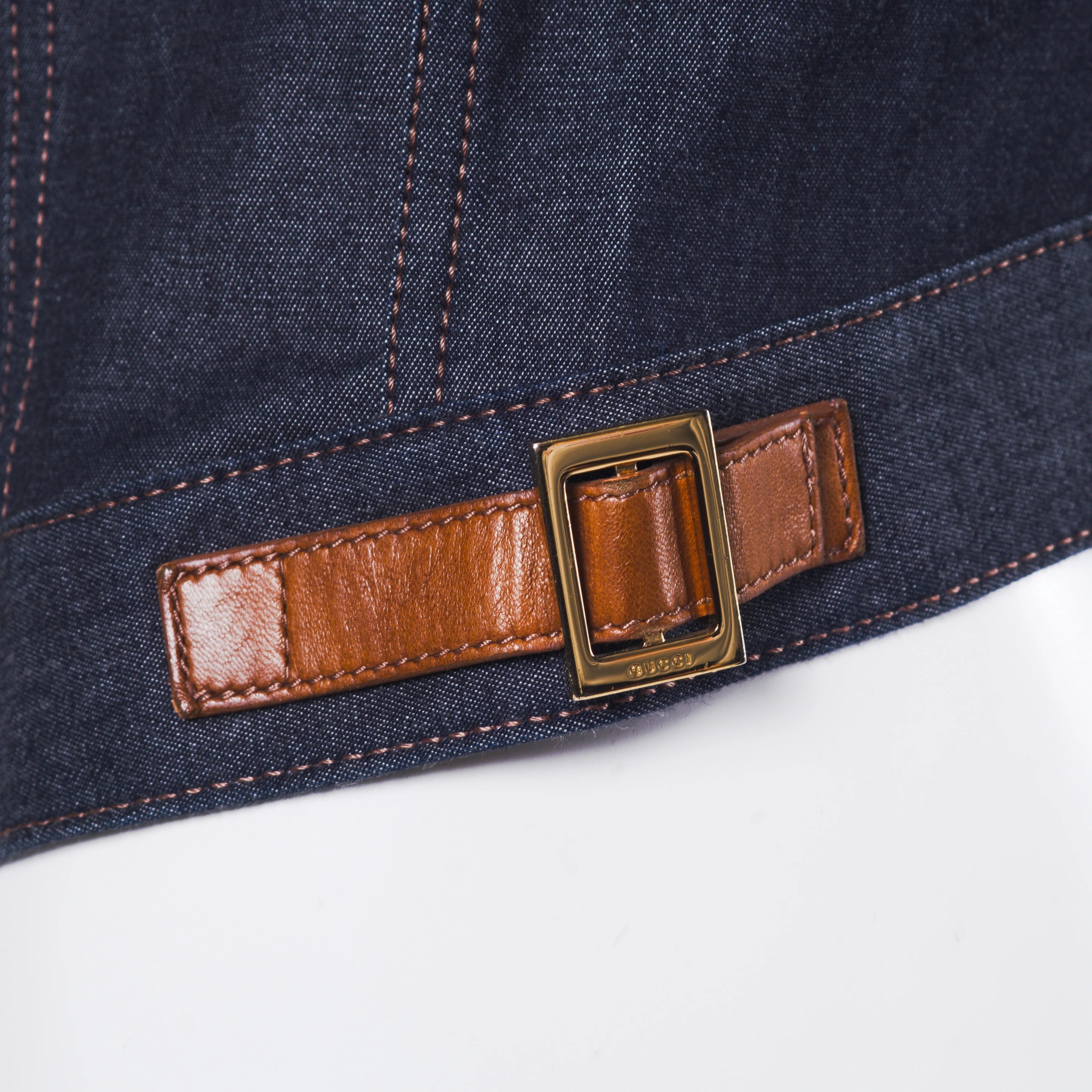 Rare denim jacket designed by Tom Ford for Gucci and presented in Milan for Spring/Summer 1999. Crafted in dark indigo stretch denim with a sculpted, fitted silhouette, it features gold-tone Gucci-stamped buttons, two front flap pockets, and signature leather side fasteners with gold-plated logo buckles. An iconic and highly collectible piece from Gucci’s most influential era.