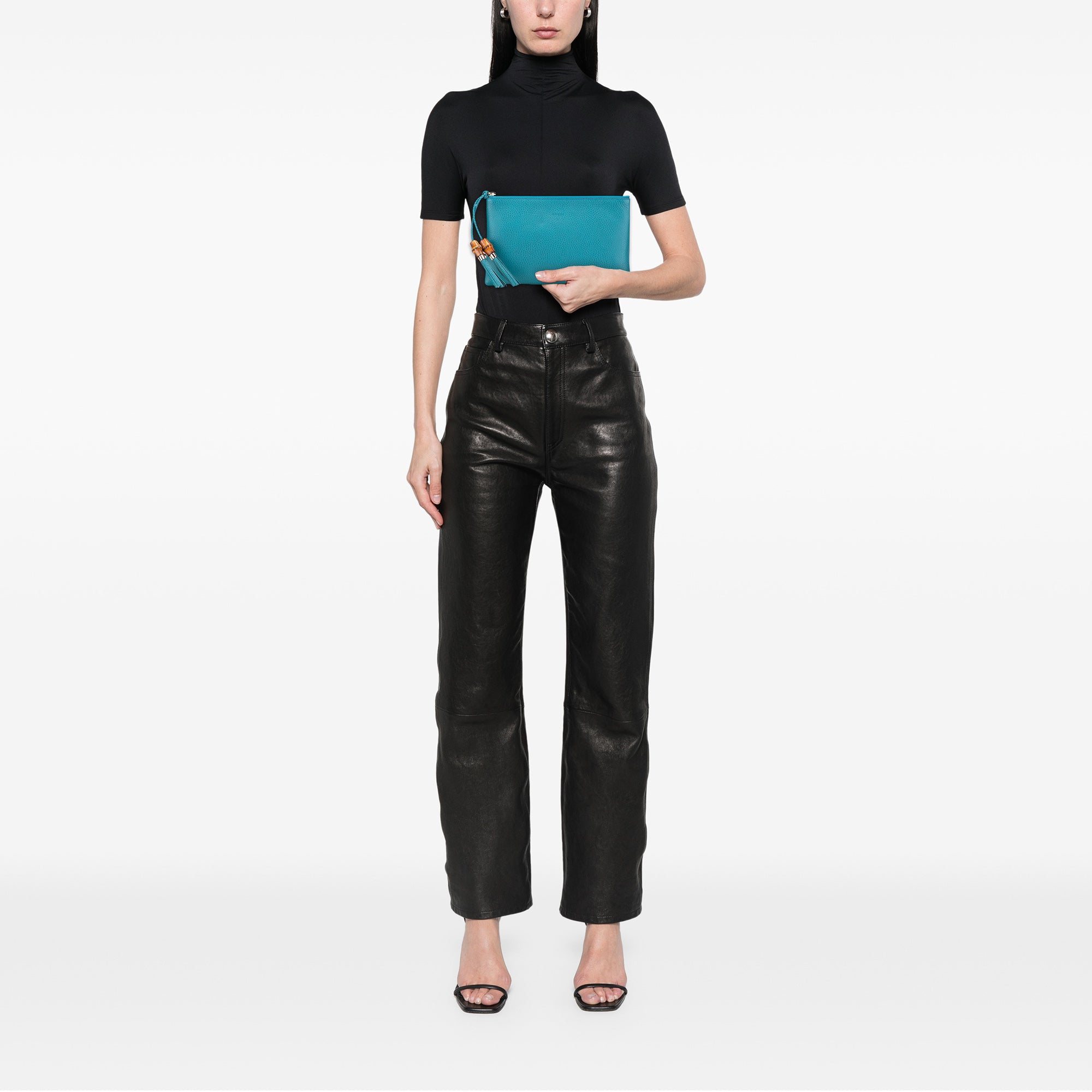 This clutch bag features a leather body, a top zip closure with bamboo and tassel details, and an interior slip pocket. Inclusion: Dust bag. Retail Price: 600.00