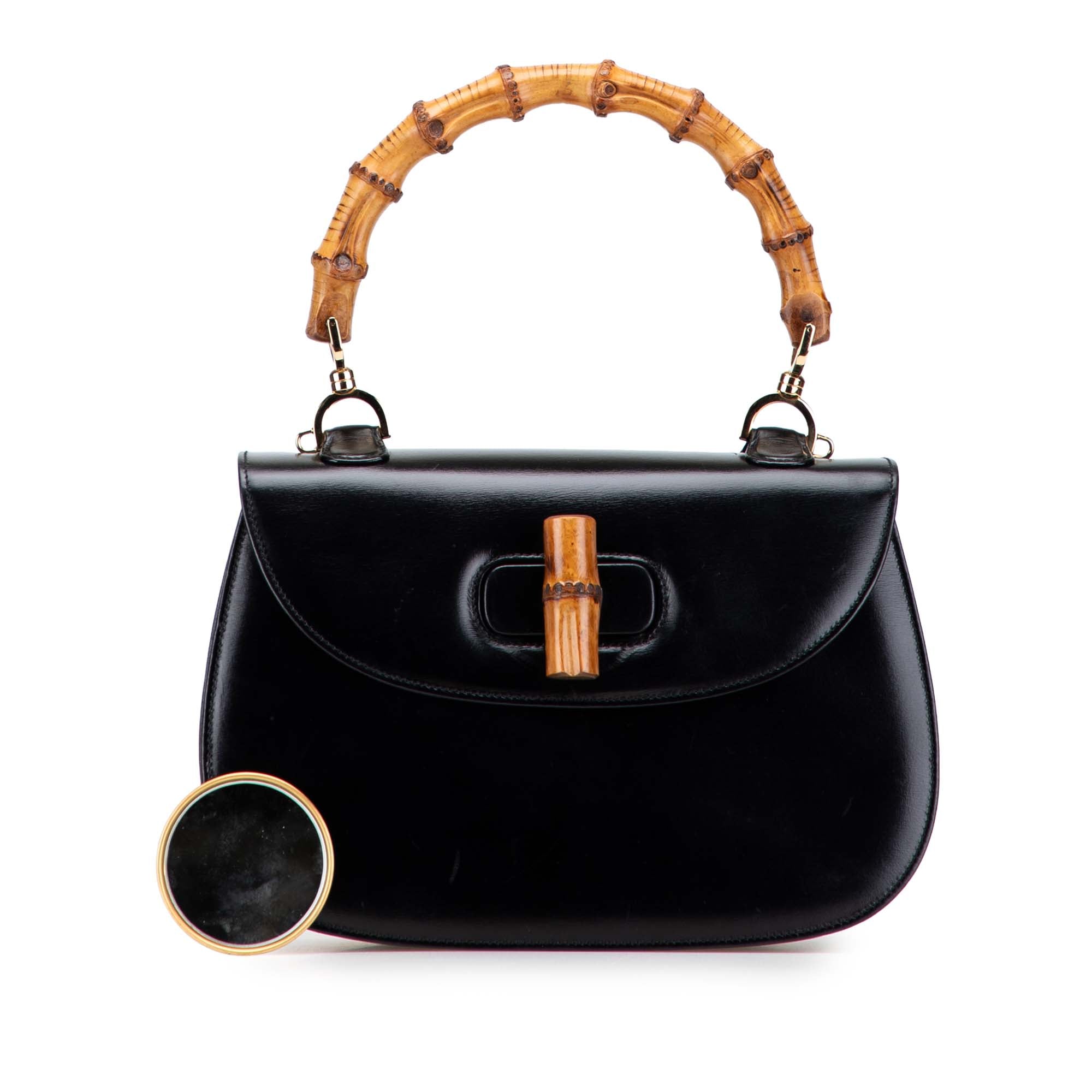 The Bamboo Night features a leather body, a bamboo top handle, a flap with bamboo turn lock closure, interior zip and slip pockets, and a mirror inclusion. Retail Price: 5000.00