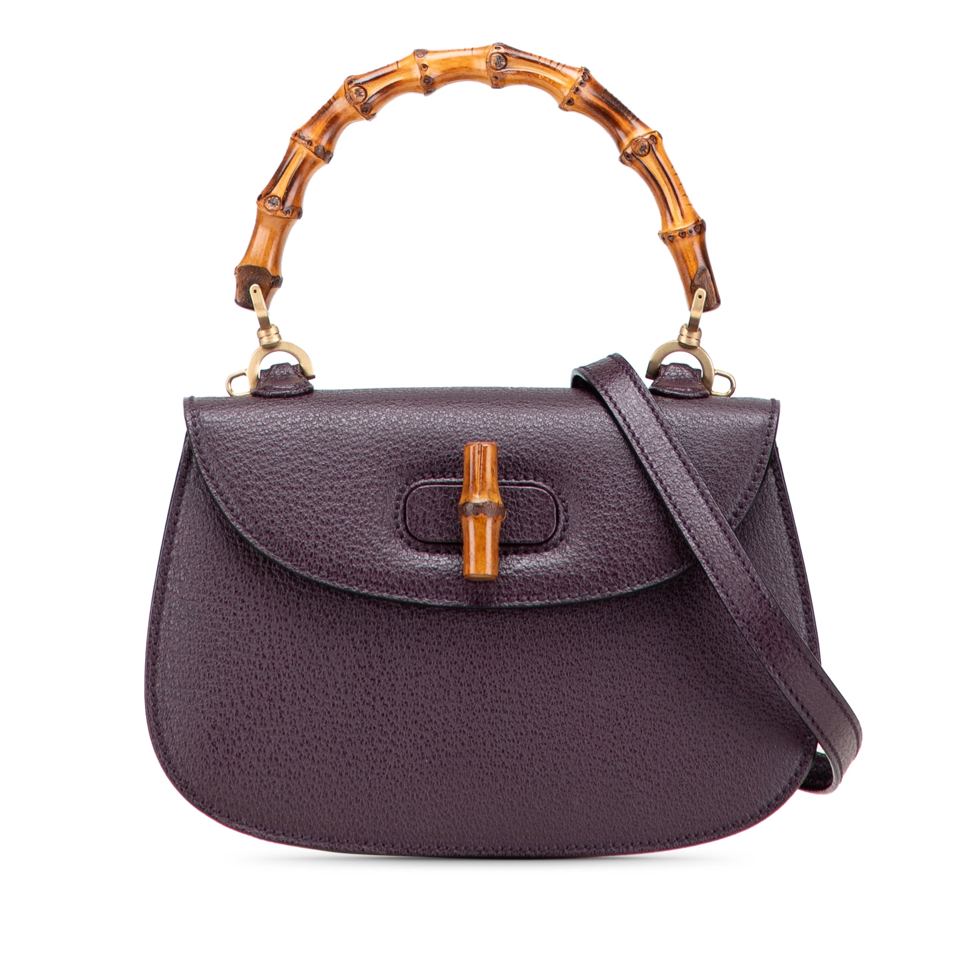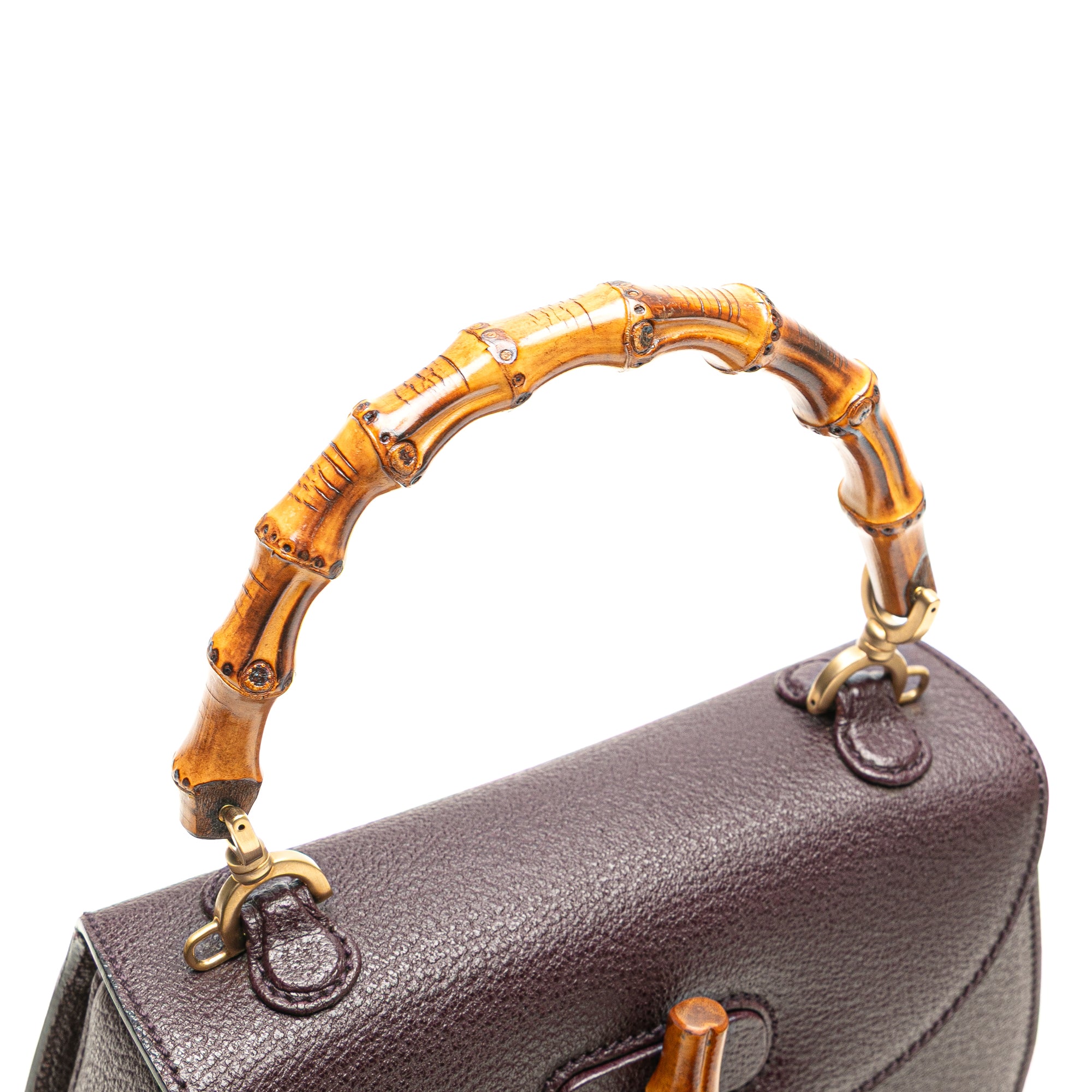 The Bamboo Night features a leather body, a bamboo top handle, a front flap with a bamboo twist lock closure, and interior zip and slip pockets. Retail Price: 1800.00
