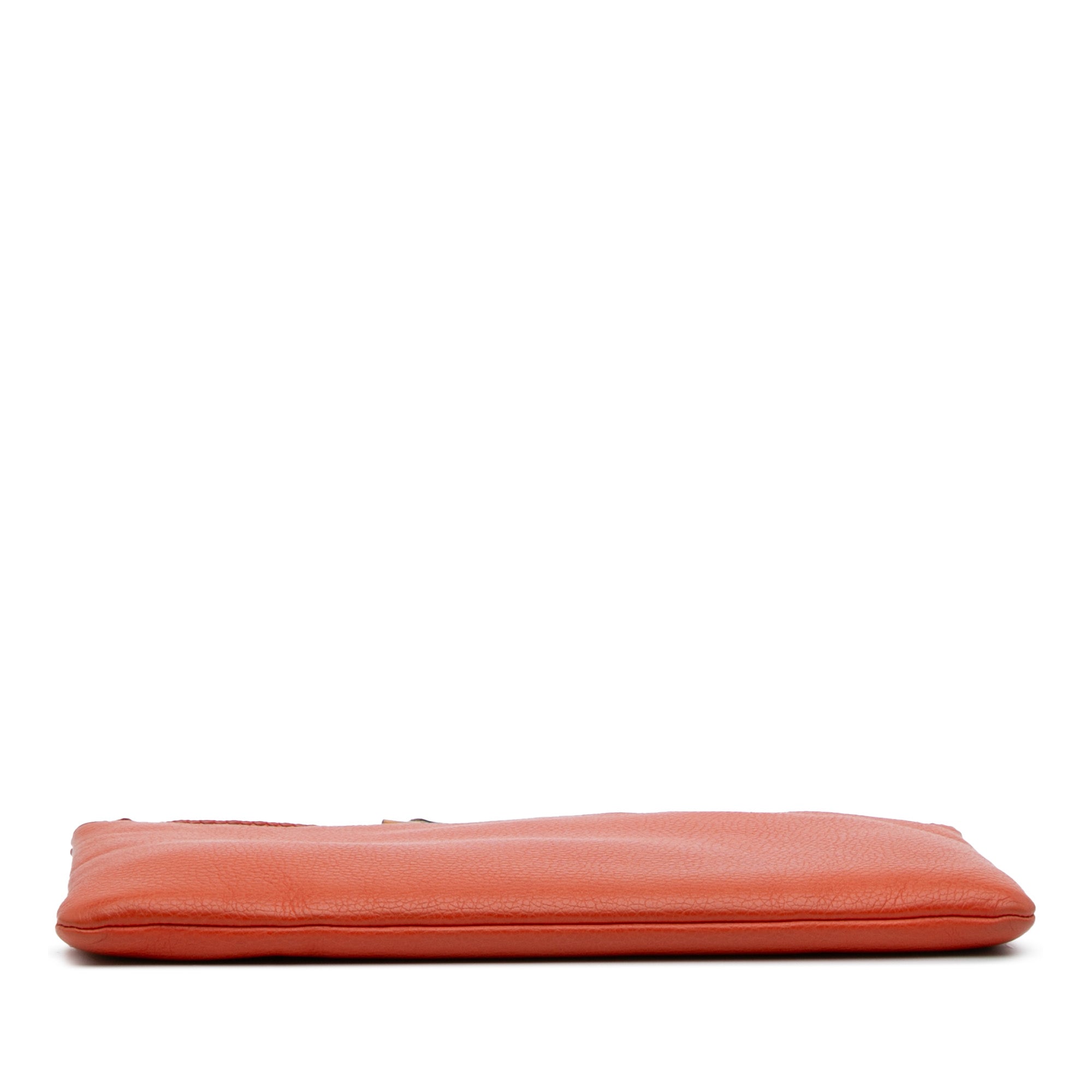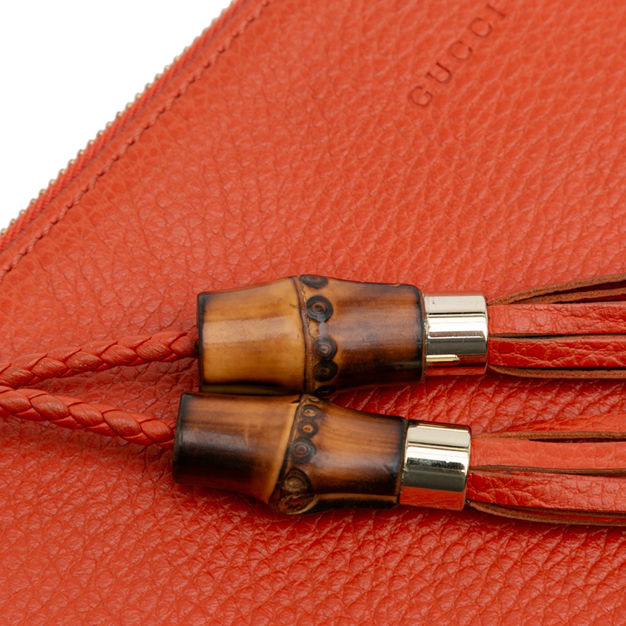This clutch bag features a leather body, a top zip closure with a bamboo tassel zipper pull, and an interior slip pocket. Retail Price: 600.00