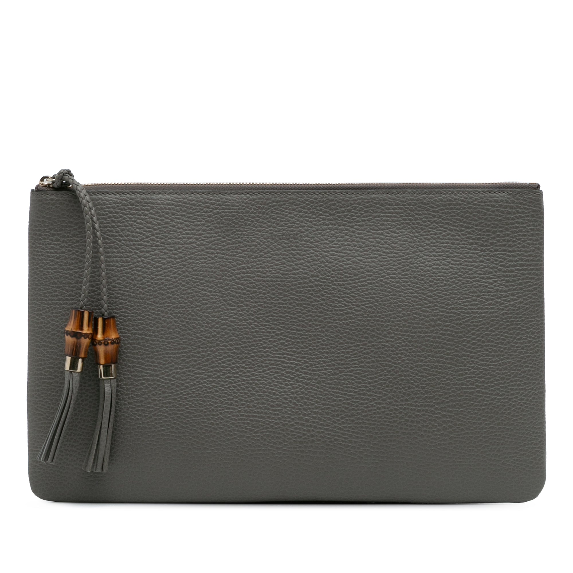This clutch bag features a leather body, a top zip closure with a bamboo tassel zipper pull, and an interior slip pocket. Retail Price: 600.00