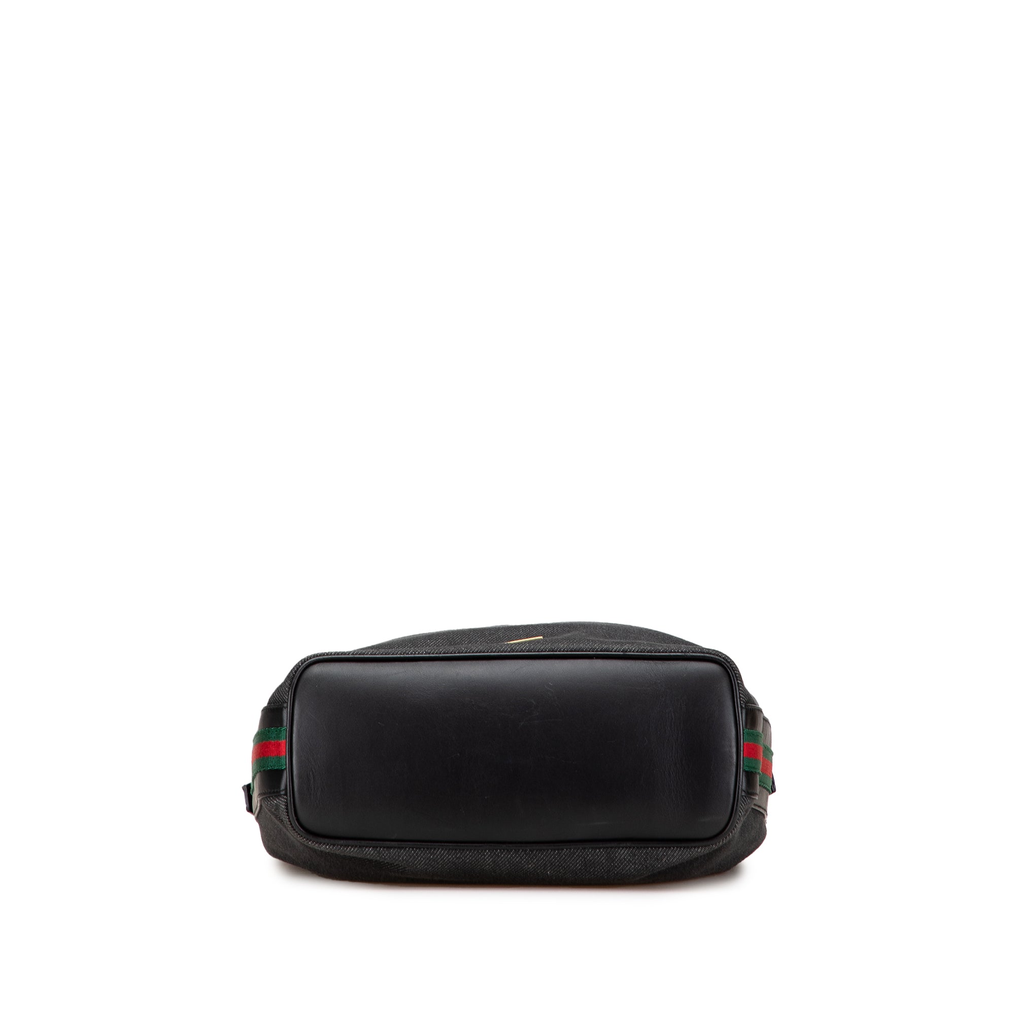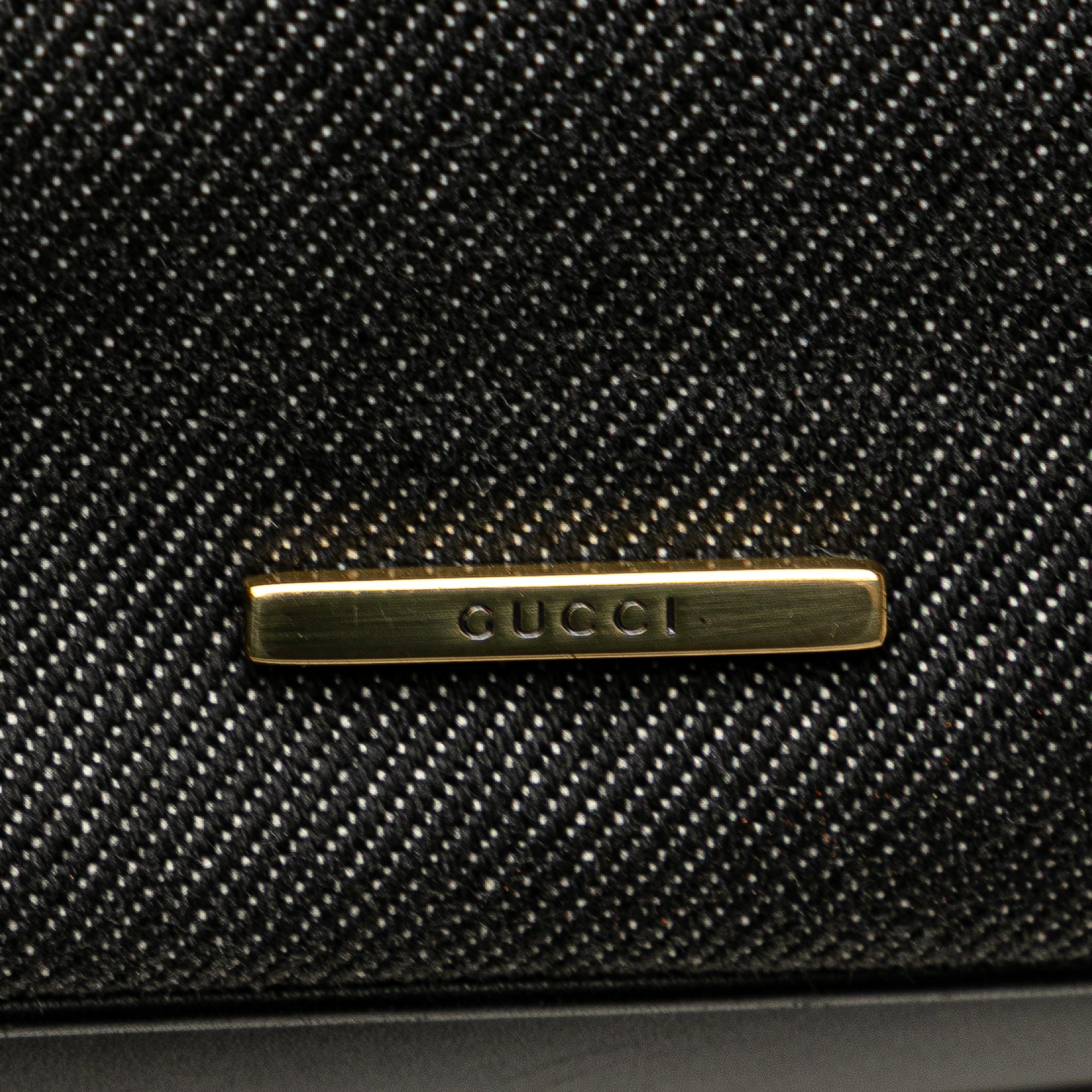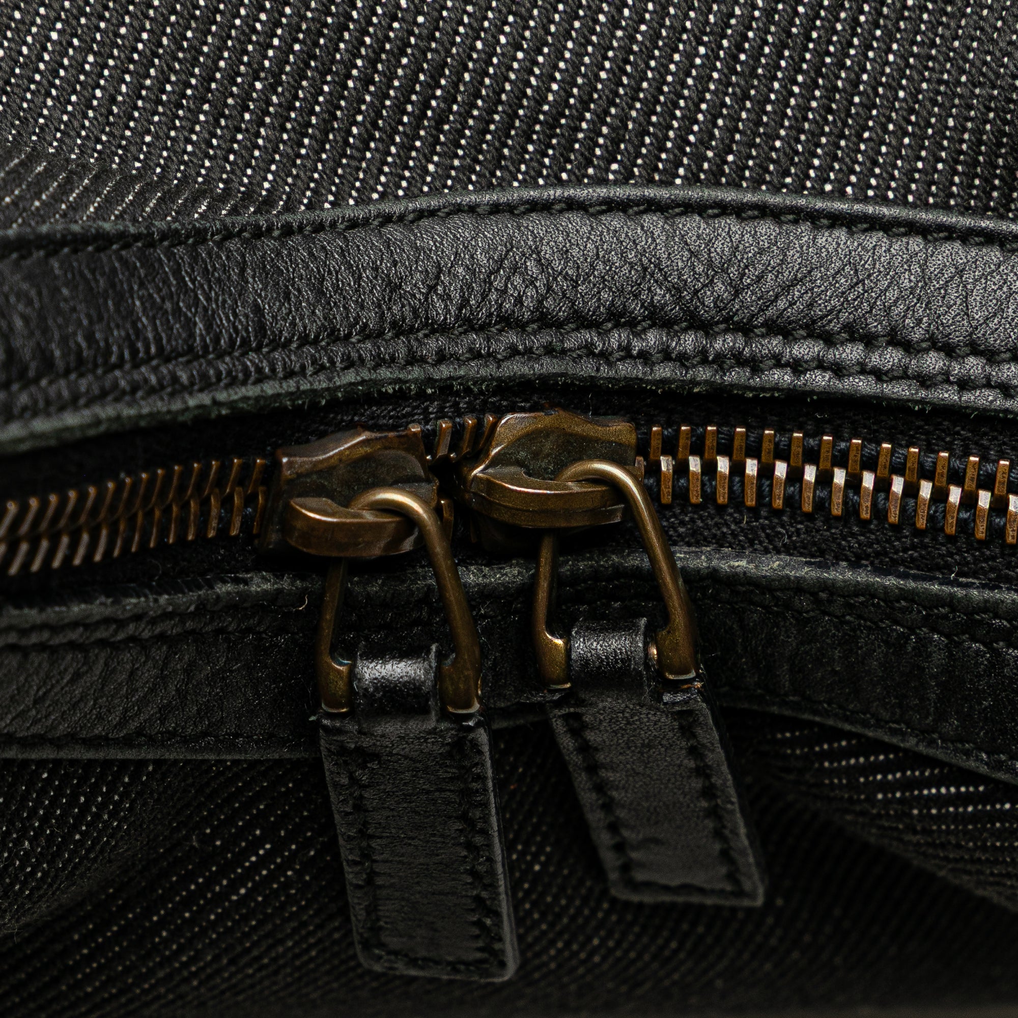 This shoulder bag features a denim body with leather trim, a flat leather shoulder strap, a top zip closure, and an interior zip pocket. Retail Price: 650.00