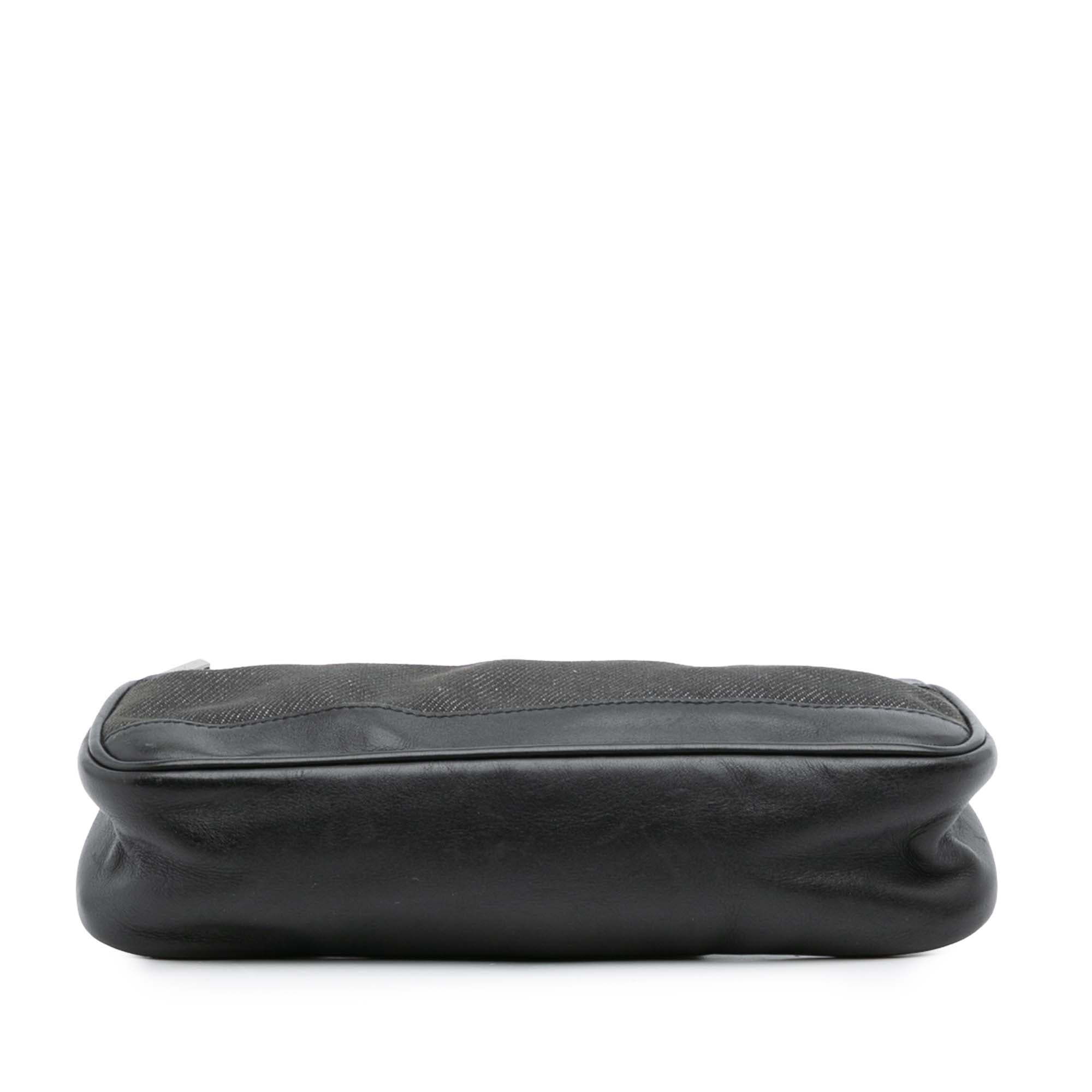 This shoulder bag features a denim body with leather trim, an adjustable flat canvas strap with web detail, and a top zip closure. Retail Price: 600.00
