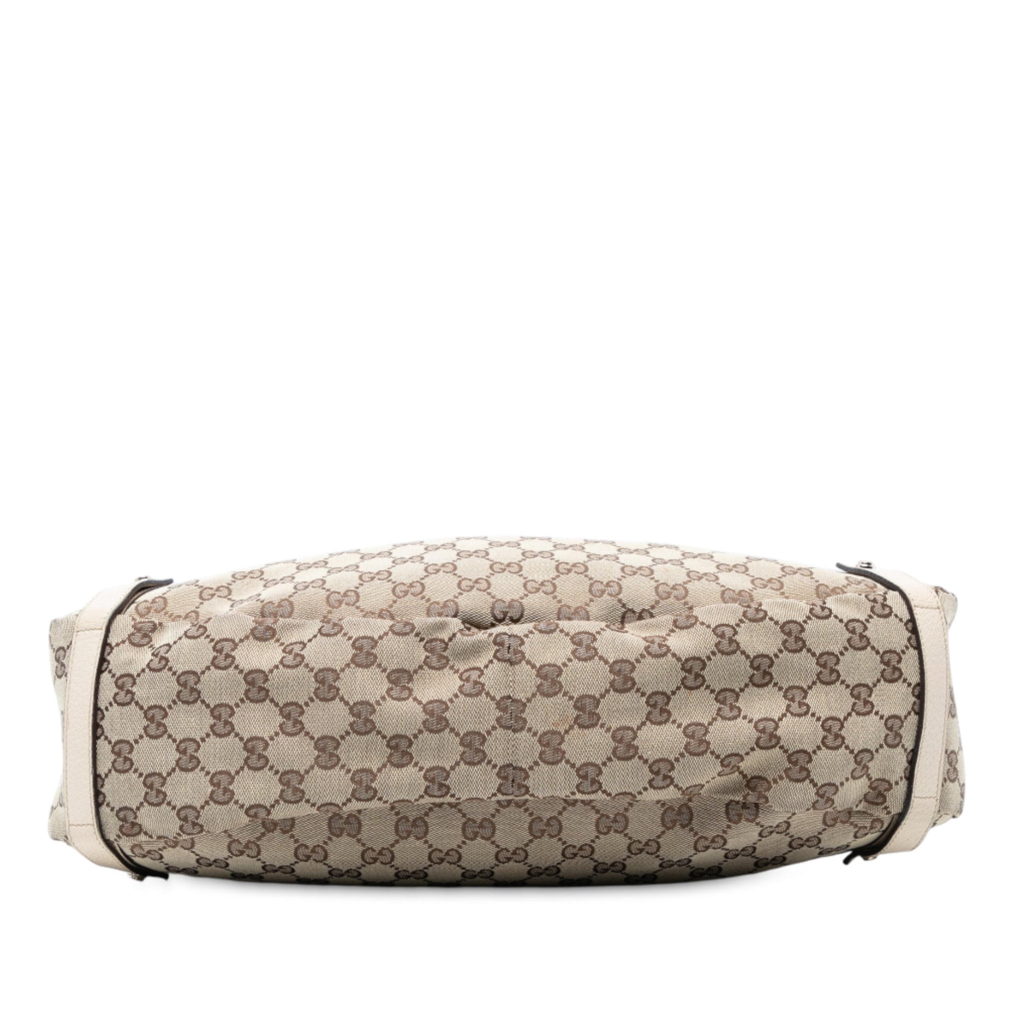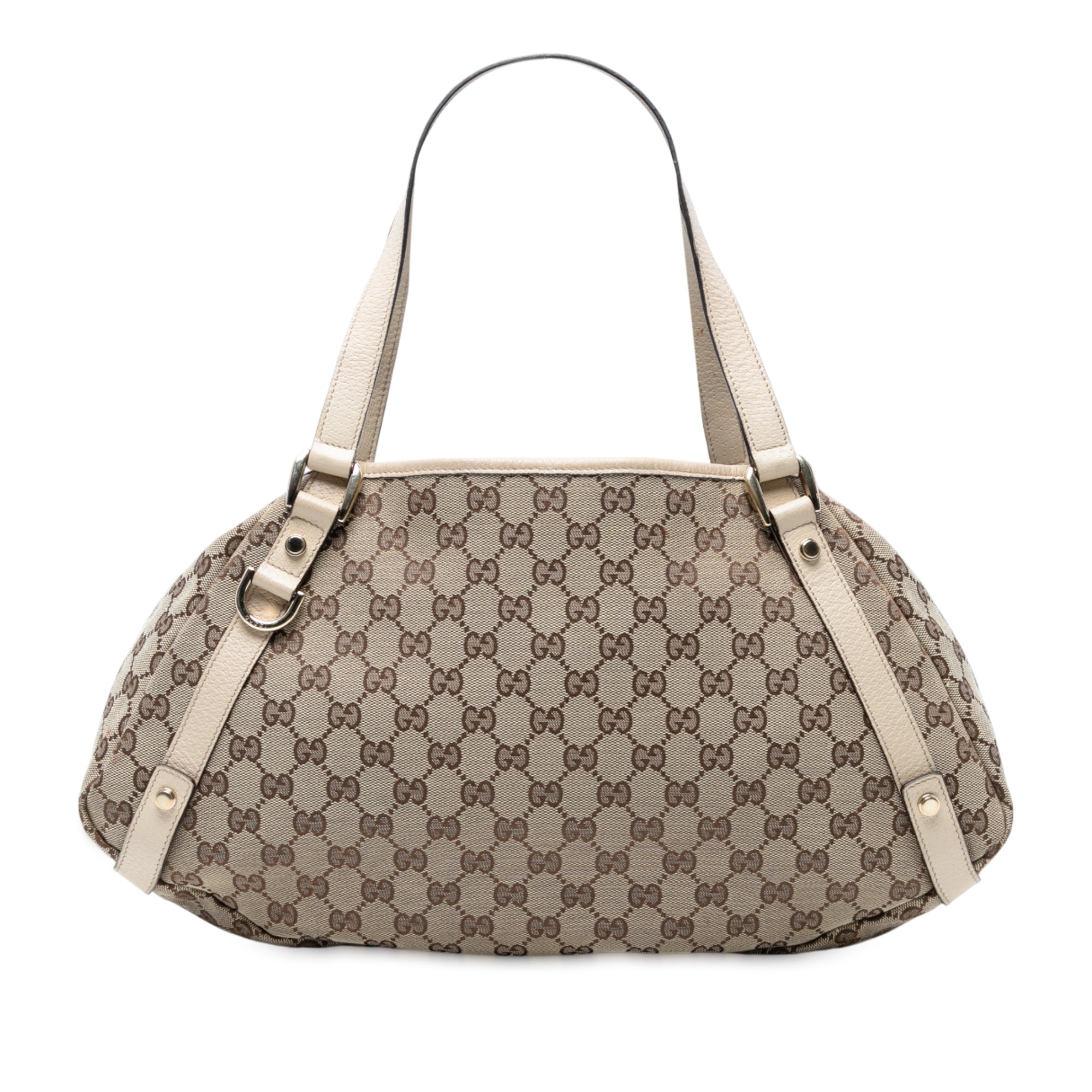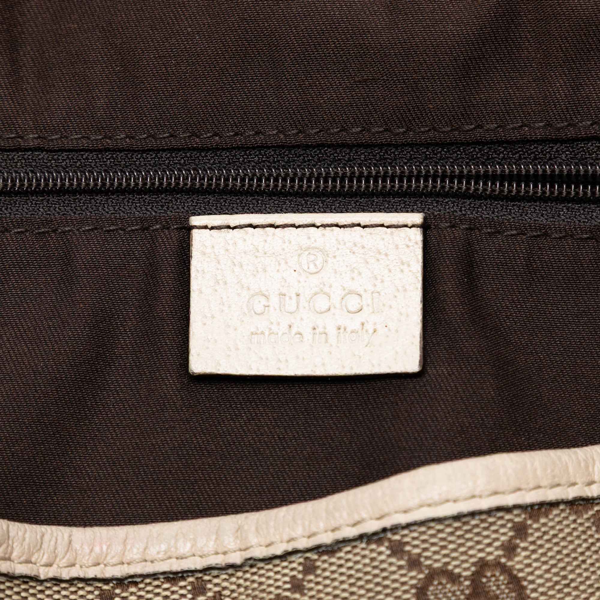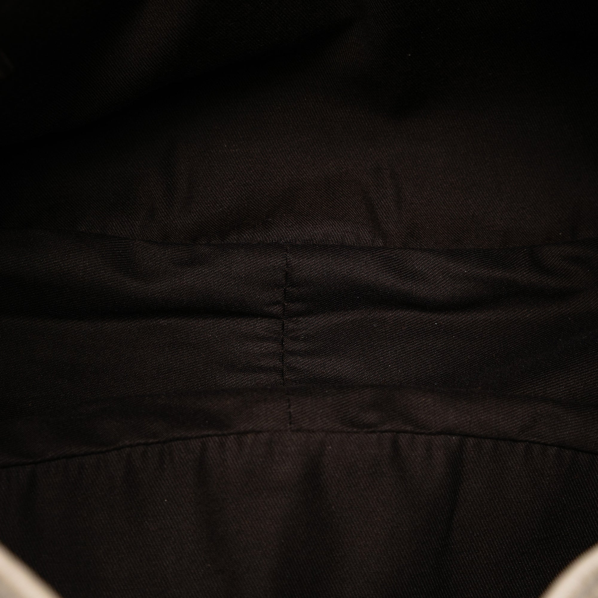 This tote bag features a canvas body with leather trim, flat leather straps, an open top, and interior zip and slip pockets. Retail Price: 770.00