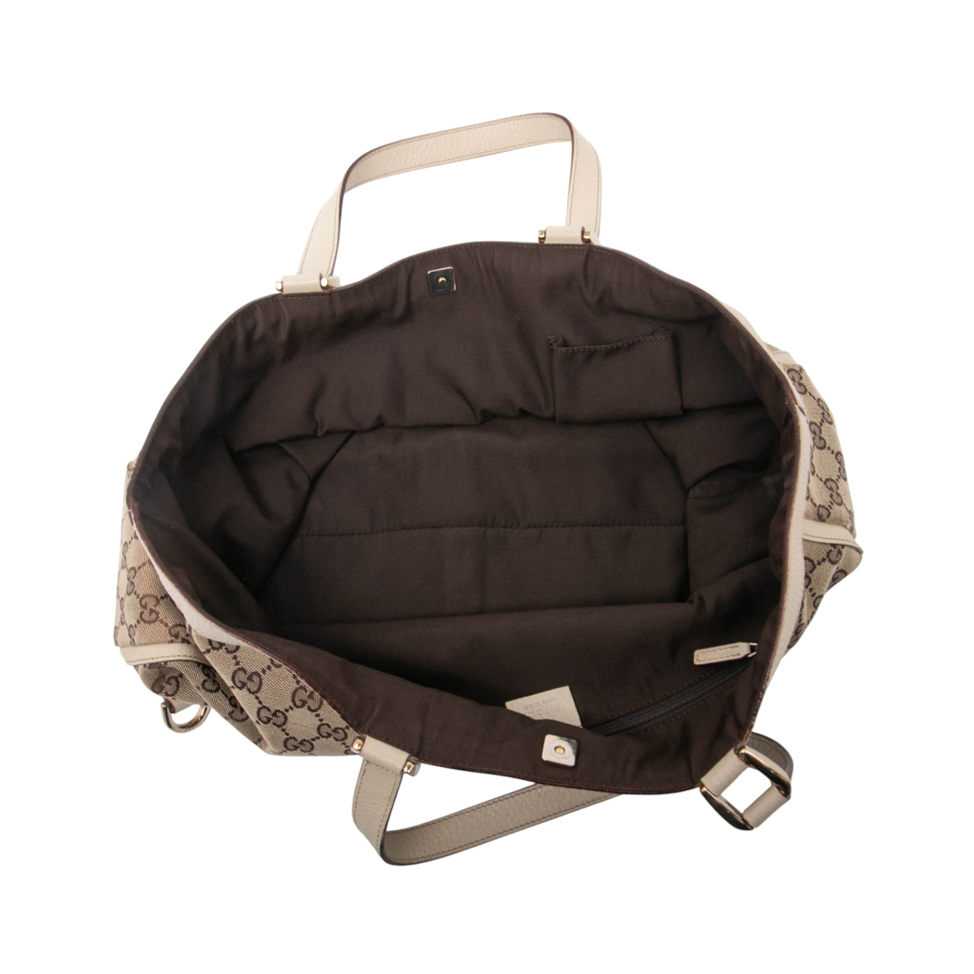 The Abbey D-Ring tote bag features a canvas body with leather trim, flat leather shoulder straps, an open top with a magnetic snap closure, and interior zip and slip pockets. Inclusion: Dust bag. Retail Price: 800.00