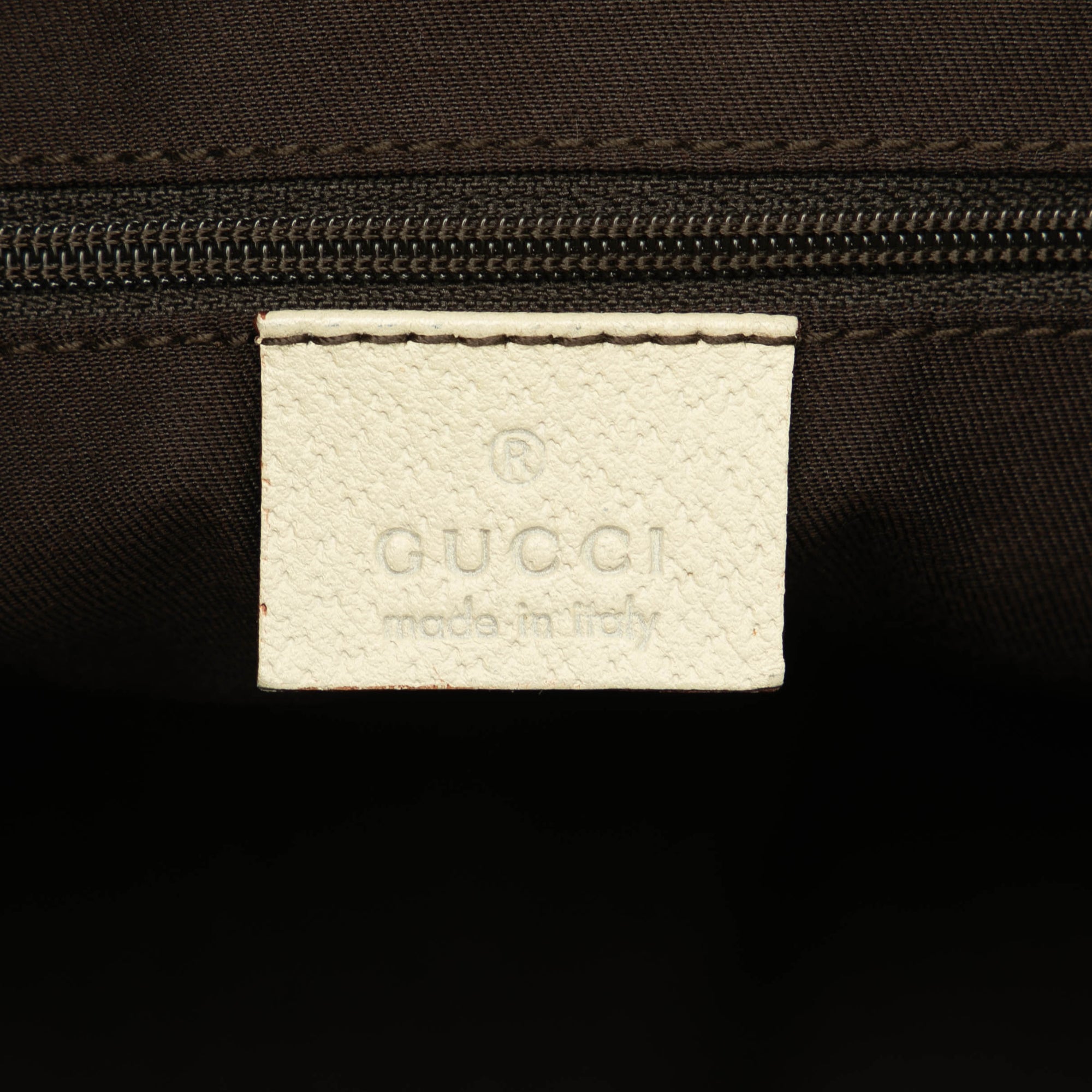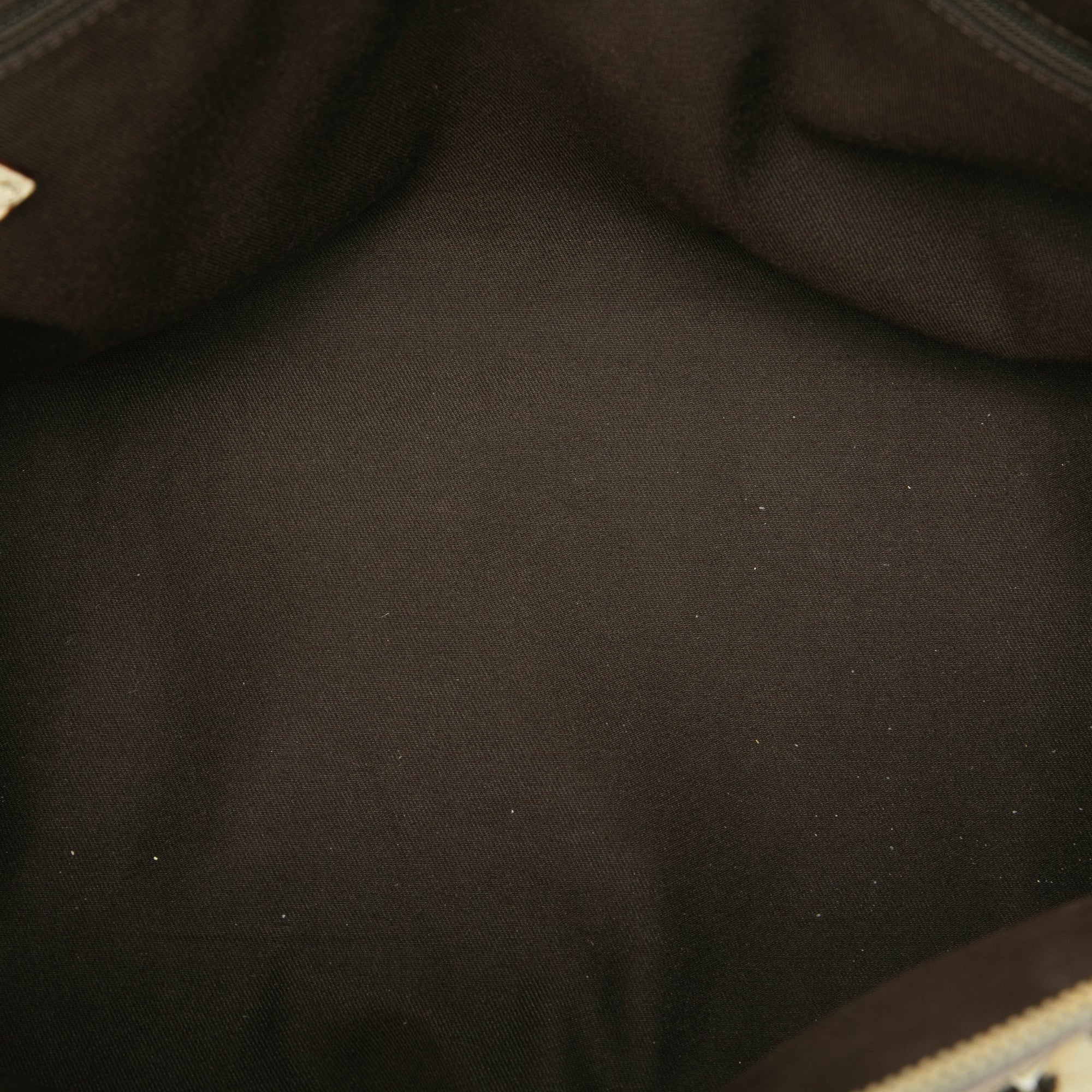 This shoulder bag features a canvas body with leather trim, flat leather straps, a top zip closure, and interior zip and slip pockets. Inclusion: Dust bag. Retail Price: 620.00
