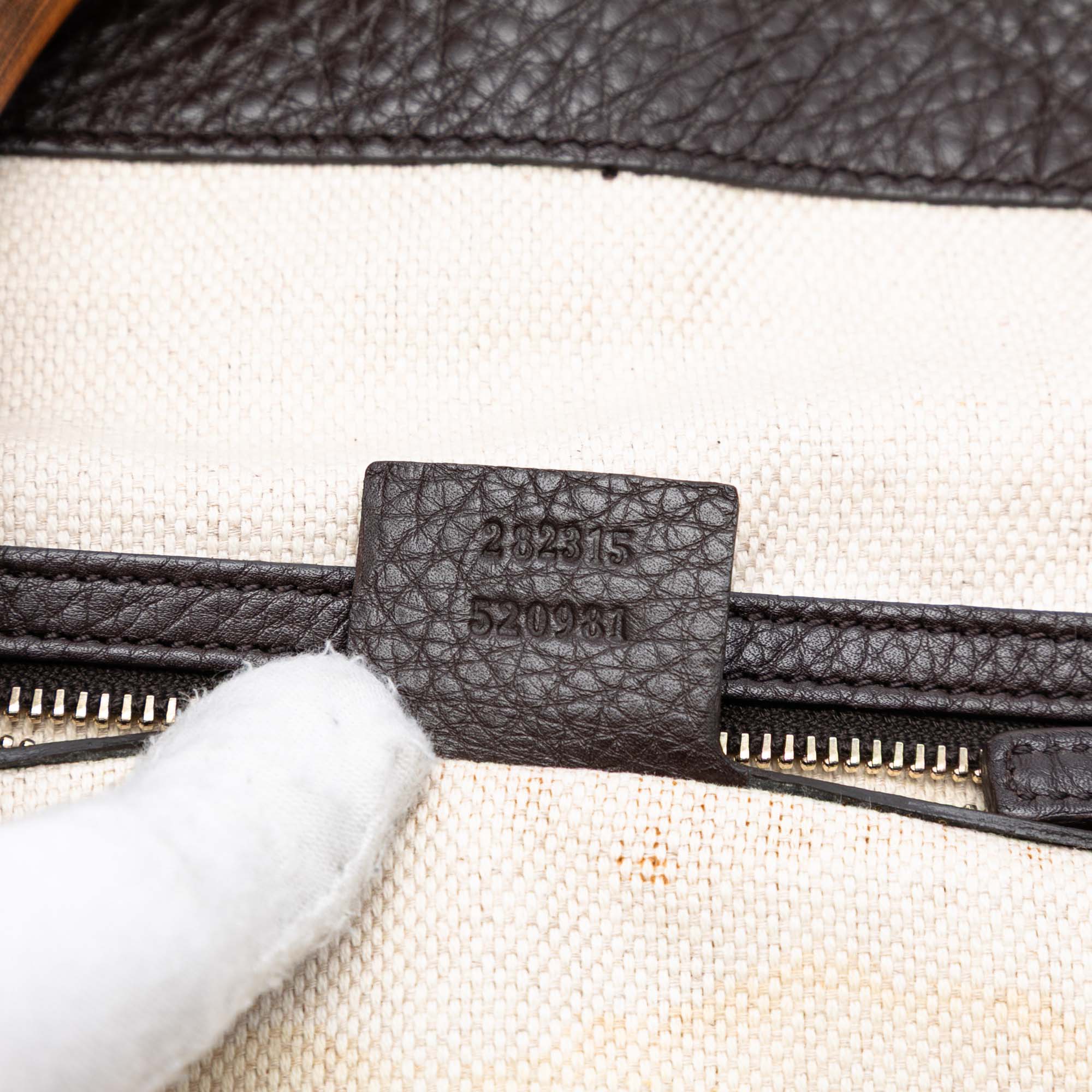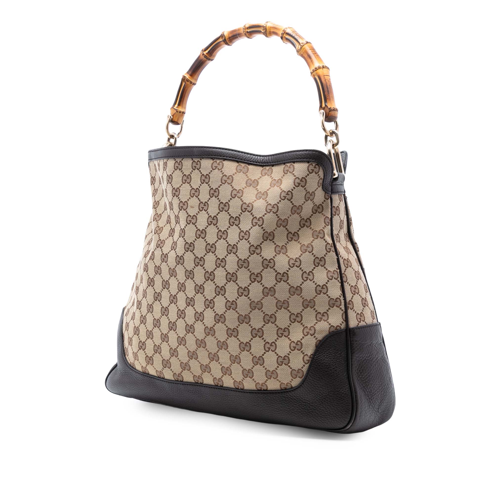 The Diana satchel features a canvas body with leather trim, a bamboo top handle, a detachable flat leather strap, an open top, and interior zip and slip pockets. Retail Price: 795.00