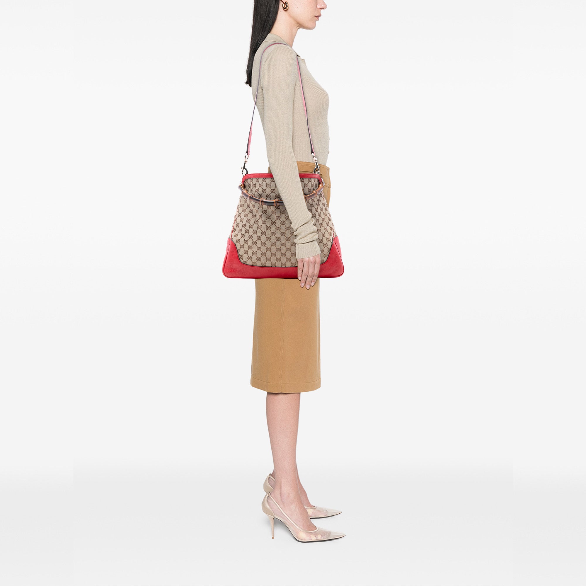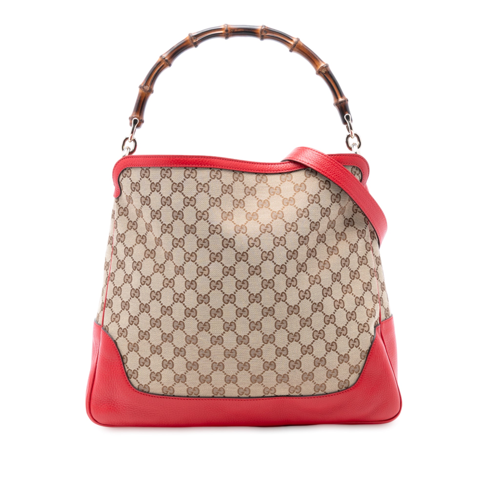 The Diana satchel features a canvas body with leather trim, a bamboo top handle, a detachable flat leather strap, an open top, and interior zip and slip pockets. Retail Price: 795.00